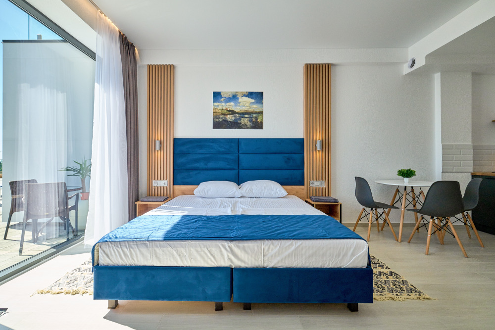 В апартаменте имеется спальная зона с удобной двуспальной кроватью или двумя односпальными кроватями, кухонной зоной с функциональным рабочим столом, тостером, микроволновой печью, столовой посудой. Бокалами, рюмками, стаканами, чашками, столовыми приборами, салатником, разделочной доской, ножами. Туалет с индивидуальными туалетными принадлежностями. В номере: столик с тремя стульями, настенное зеркало, шкаф, светильники,, мини-холодильник, чайник, тостер, кондиционер. WIFI, одноразовые тапочки.