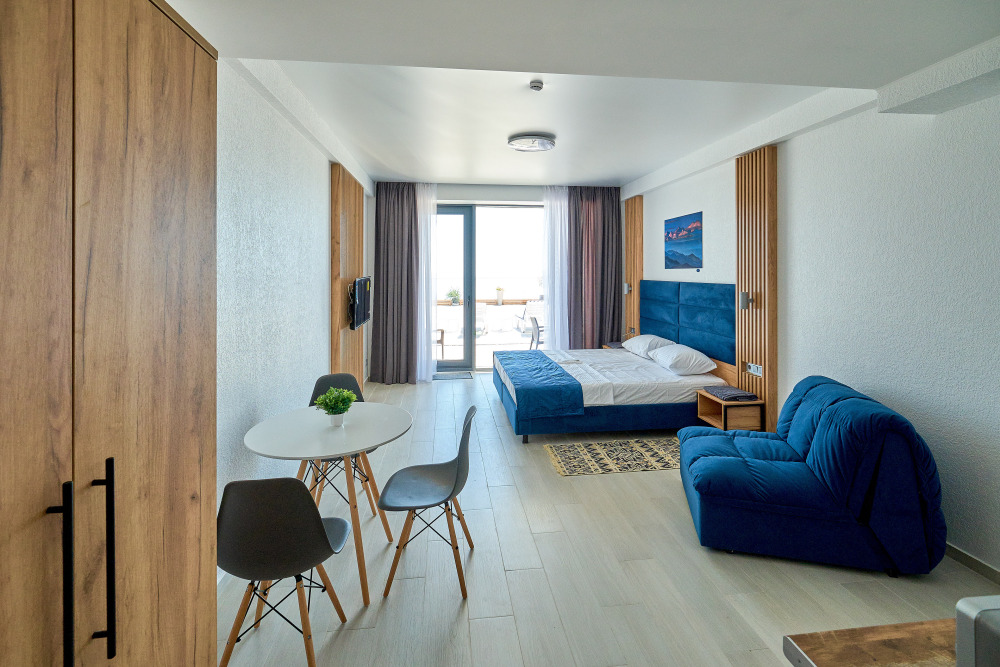 В апартаменте имеется спальная зона с удобной двуспальной кроватью или двумя односпальными кроватями, кухонной зоной с функциональным рабочим столом, тостером, микроволновой печью, столовой посудой. Бокалами, рюмками, стаканами, чашками, столовыми приборами, салатником, разделочной доской, ножами. Туалет с индивидуальными туалетными принадлежностями. В номере: столик с тремя стульями, настенное зеркало, шкаф, светильники, мини-холодильник, чайник, тостер, кондиционер. WI-FI, одноразовые тапочки.