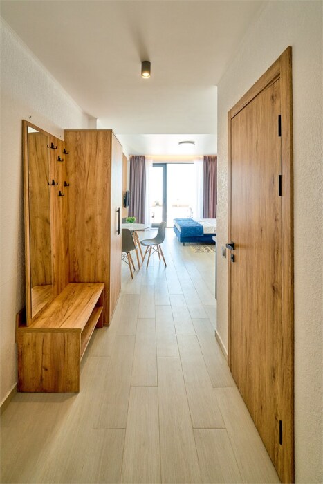 В апартаменте имеется спальная зона с удобной двуспальной кроватью или двумя односпальными кроватями, кухонной зоной с функциональным рабочим столом, тостером, микроволновой печью, столовой посудой. Бокалами, рюмками, стаканами, чашками, столовыми приборами, салатником, разделочной доской, ножами и т. д. Туалет с индивидуальными туалетными принадлежностями. В номере: столик с тремя стульями, настенное зеркало, шкаф, светильники,, мини-холодильник, чайник, тостер, кондиционер. WIFI, одноразовые тапочки.