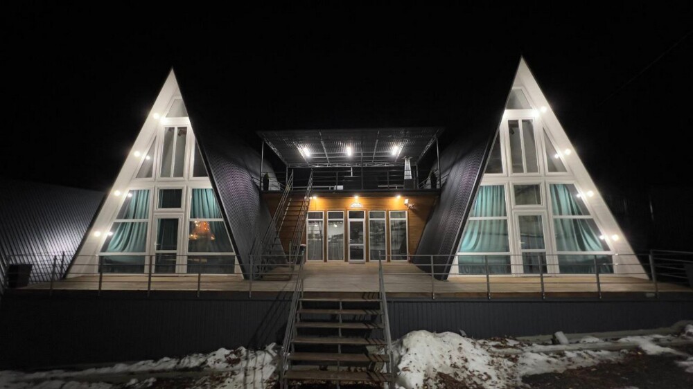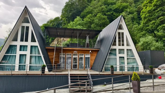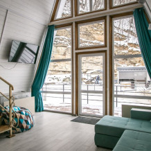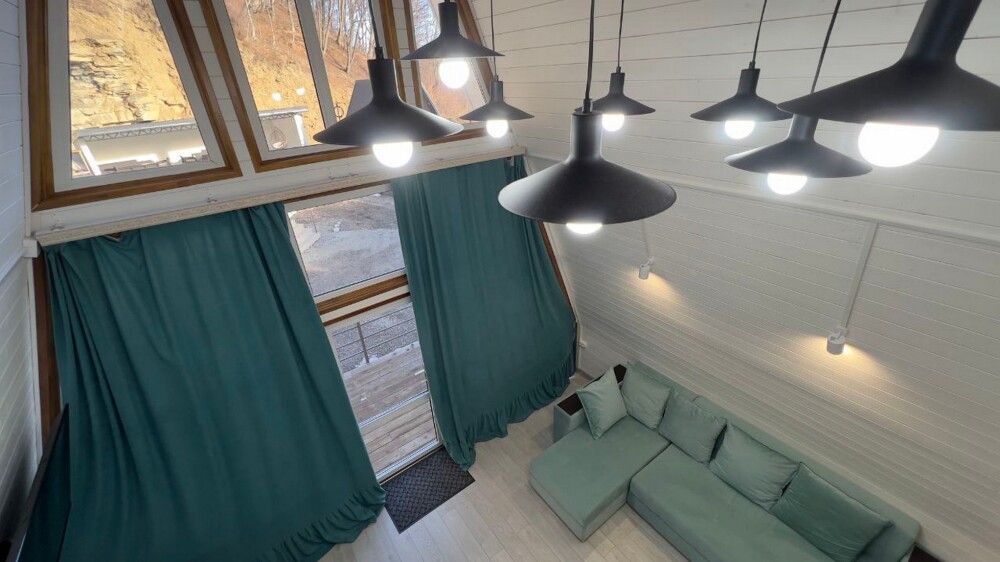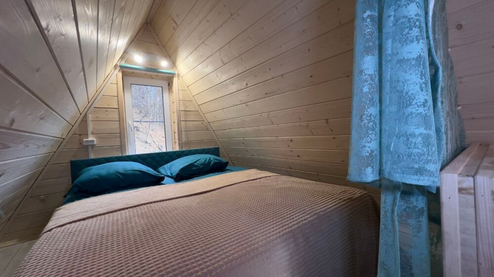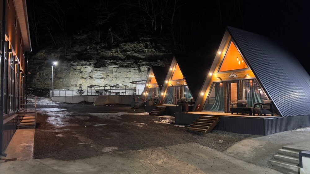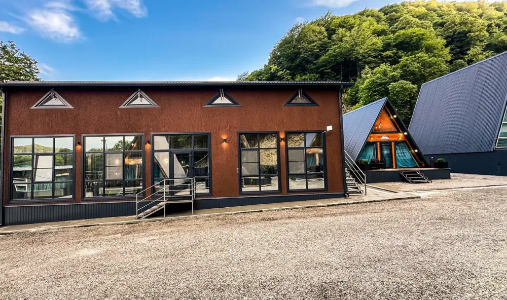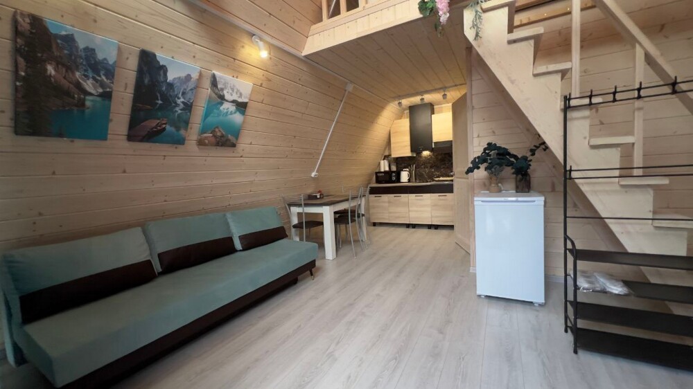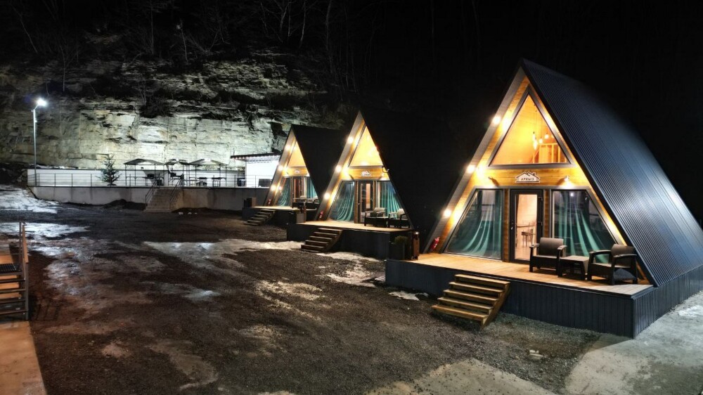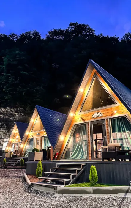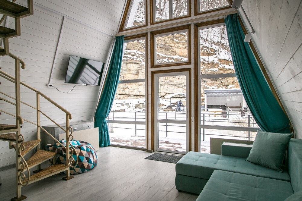 Гостям предлагается размещение в домиках А Frame на 4-8 человек, оборудованных всем необходимым для комфортного проживания: гостиная зона с кухней, обеденная зона, спальня, санузел. Каждый домик имеет собственную веранду с мебелью, где можно посидеть, греясь на солнышке и созерцая горы.
