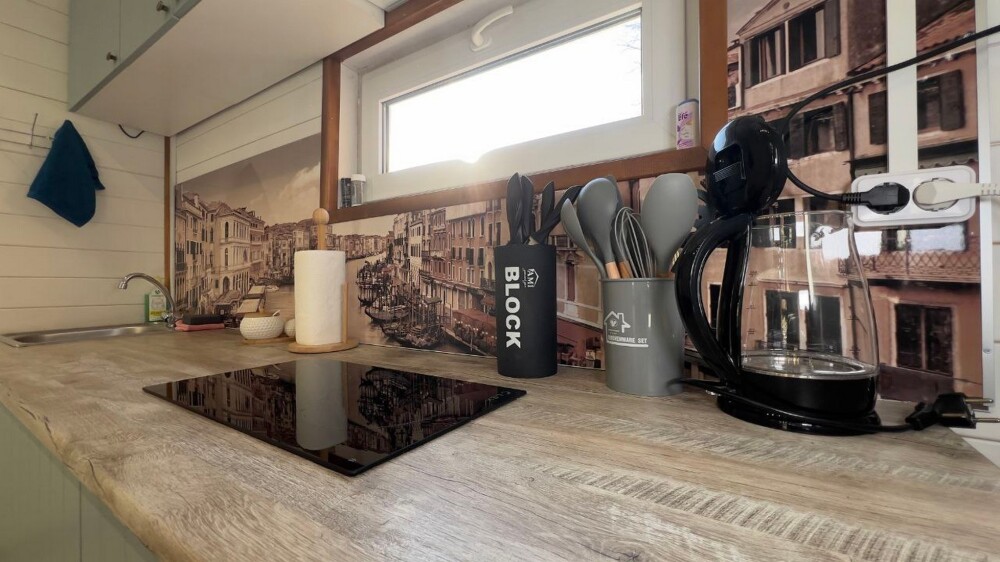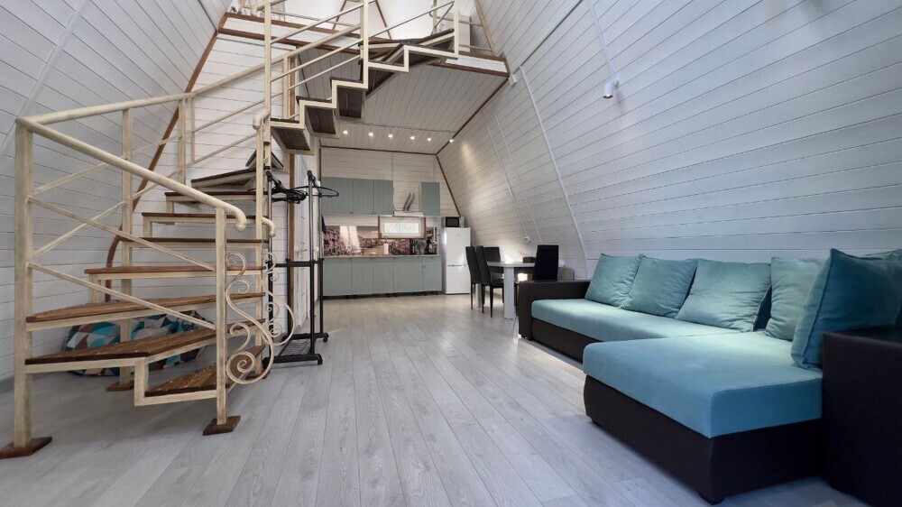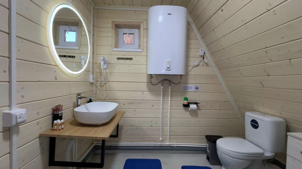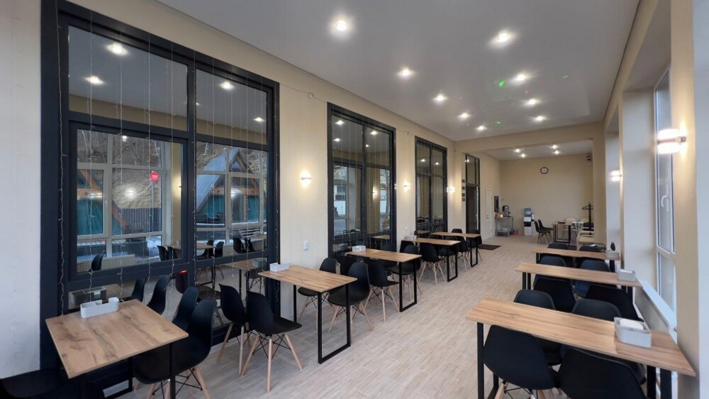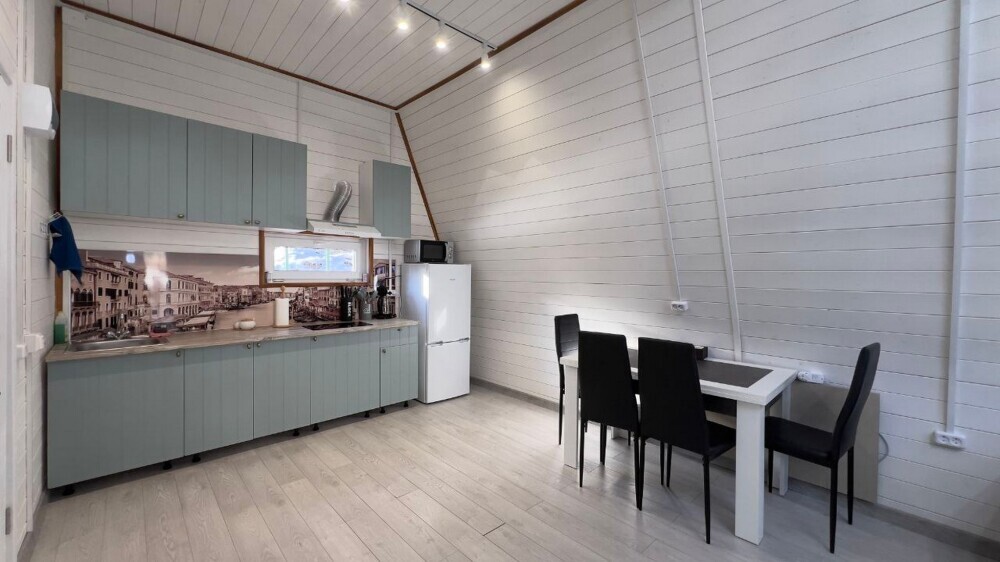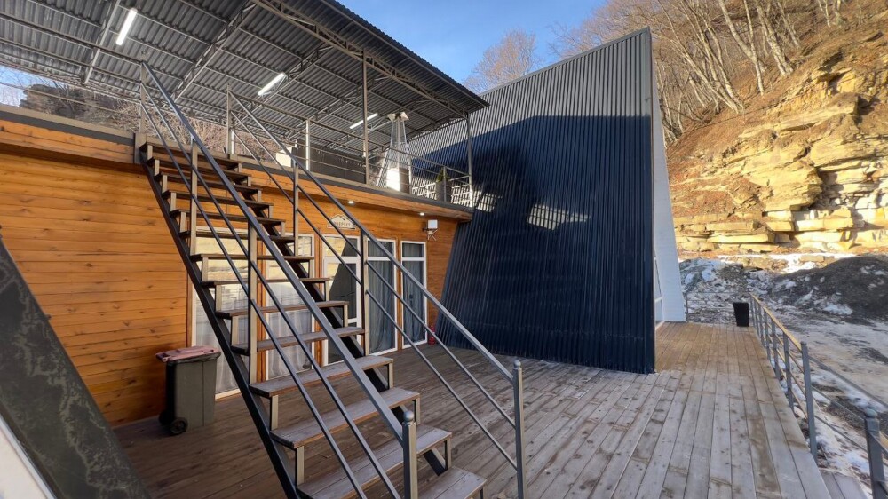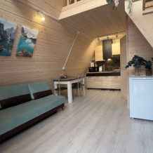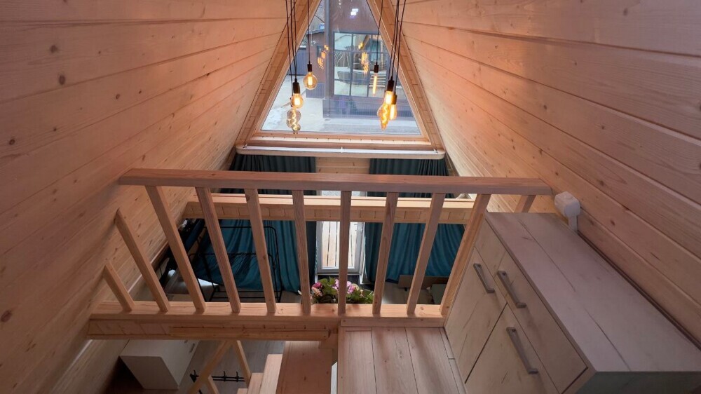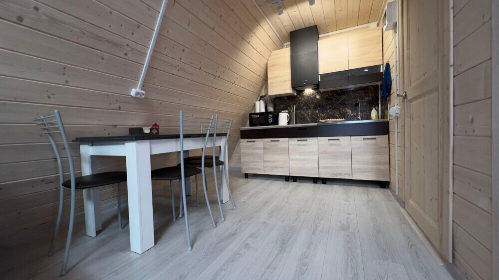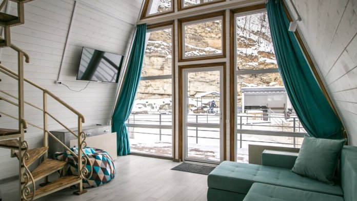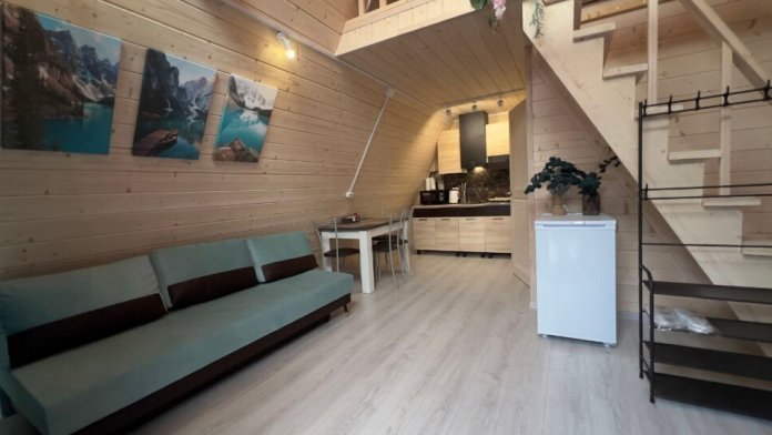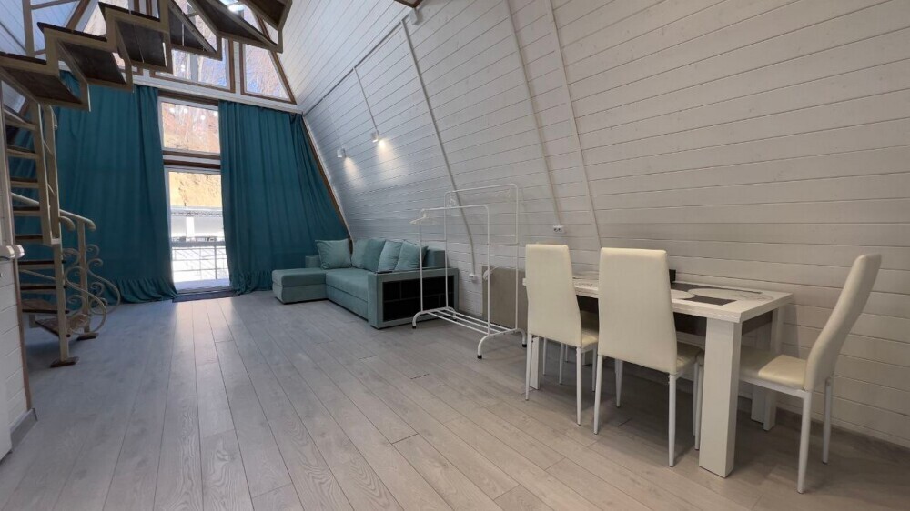Гостям предлагается размещение в домиках А Frame на 4-8 человек, оборудованных всем необходимым для комфортного проживания: гостиная зона с кухней, обеденная зона, спальня, санузел. Каждый домик имеет собственную веранду с мебелью, где можно посидеть, греясь на солнышке и созерцая горы.