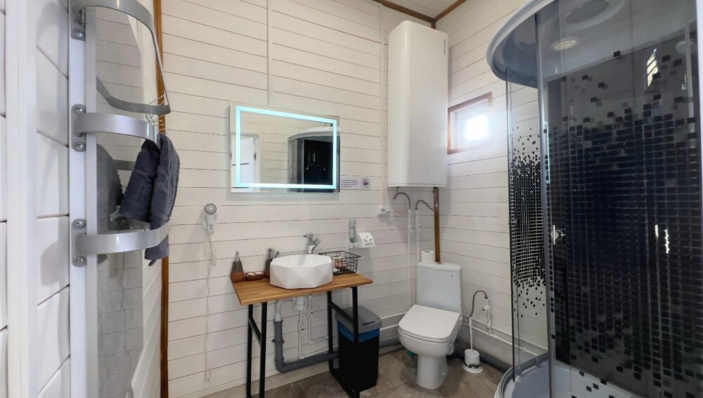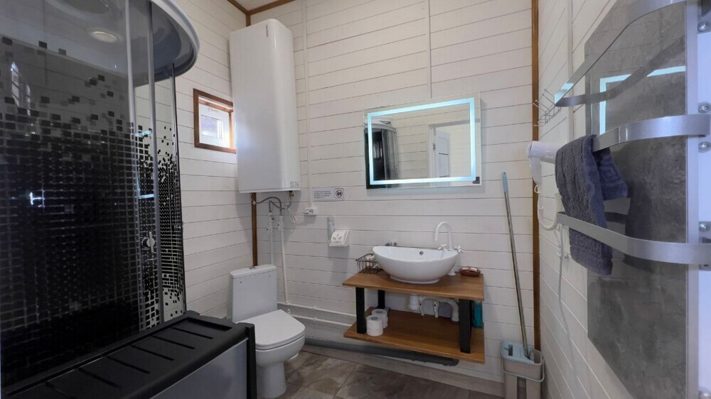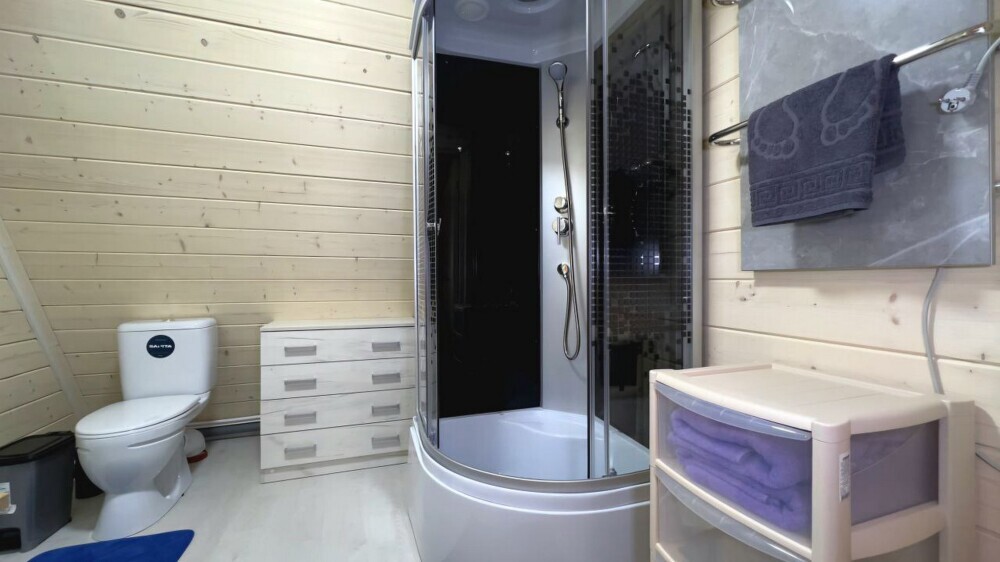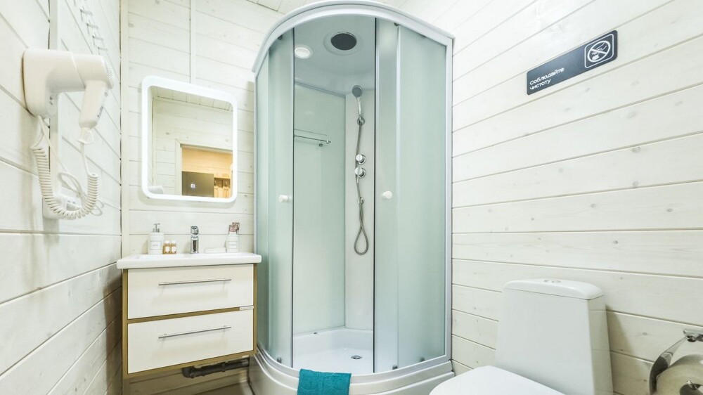 Индивидуальная ванная комната: душевая кабина, раковина, туалет.