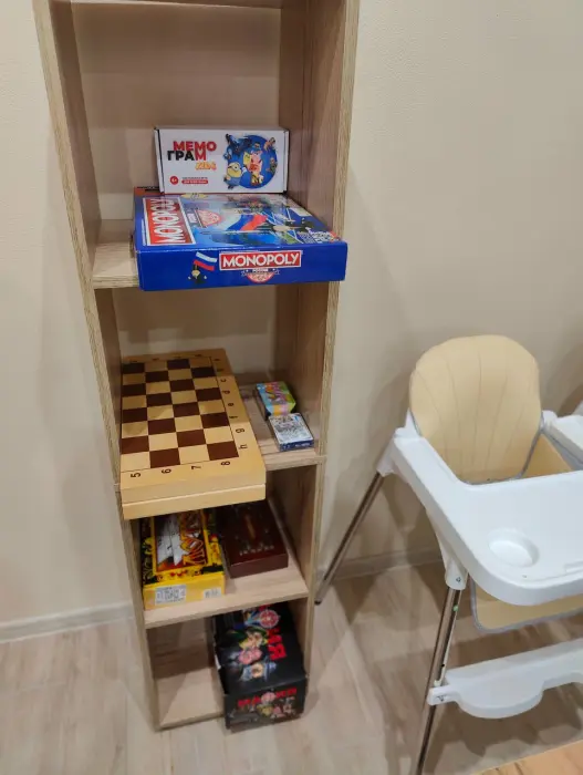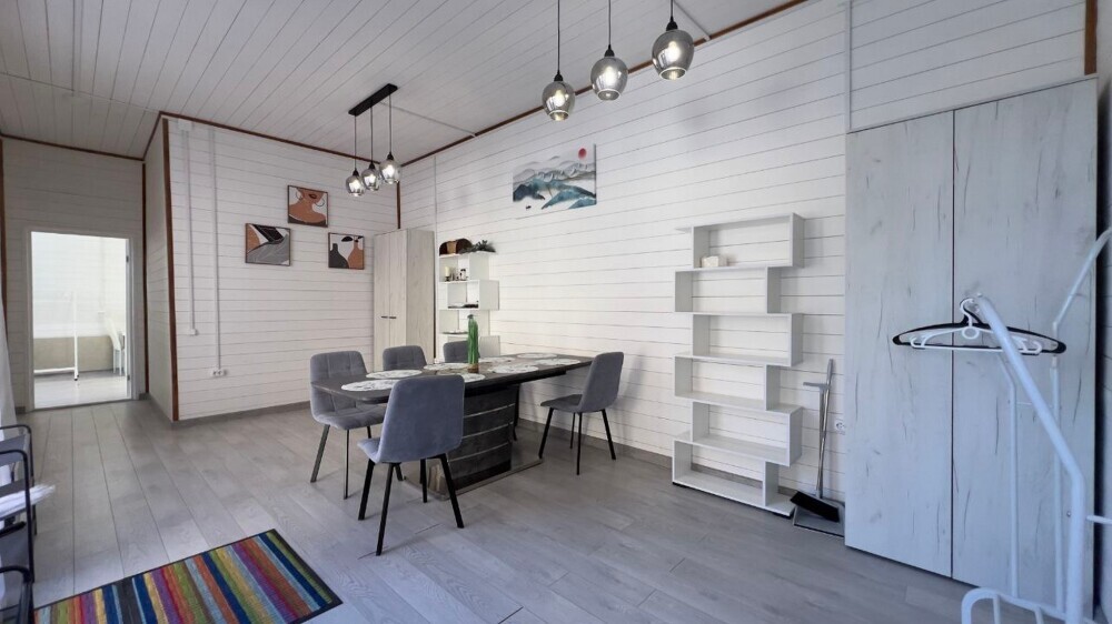 Имеется собственная кухня со всей необходимой техникой, телевизор, шкаф, вешалка, журнальный столик, комод, обеденный стол, стулья.