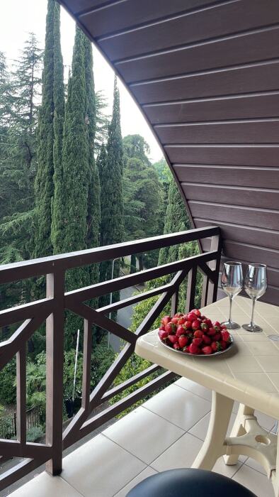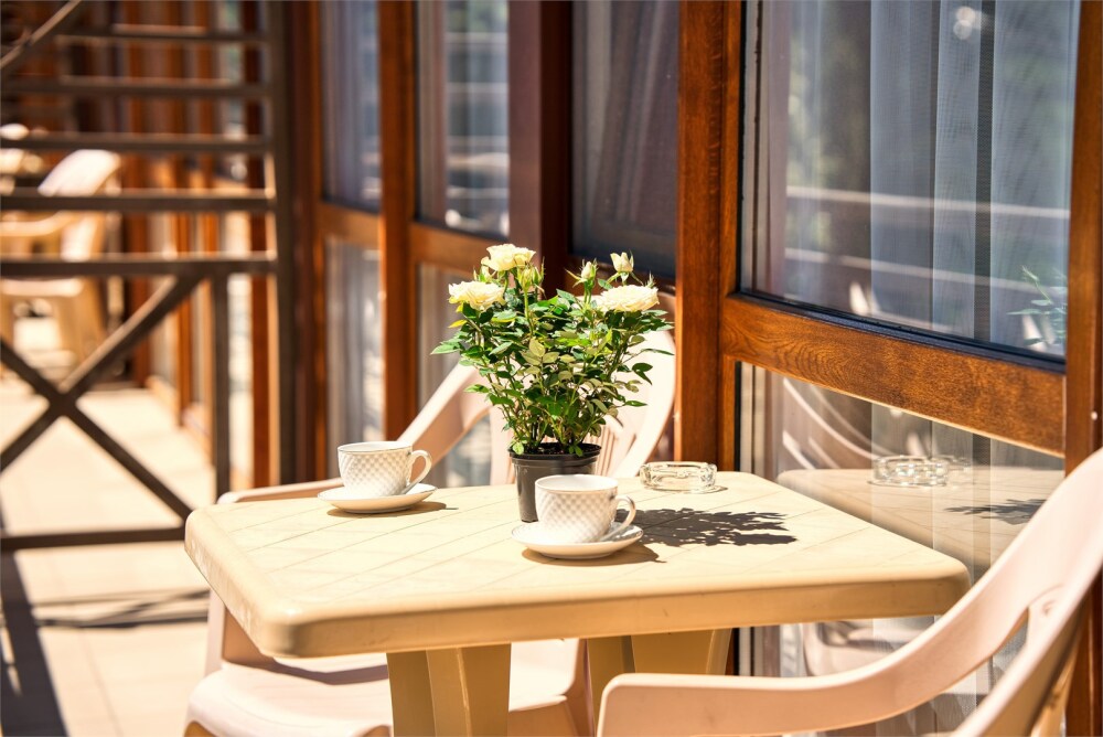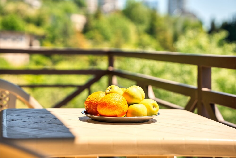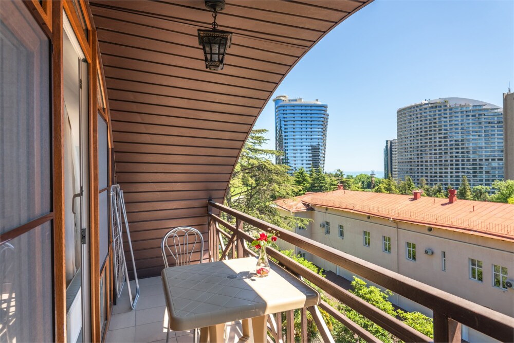 В каждом номере балкон с видом на город, Wi-Fi и журнальный стол за которым можно работать.