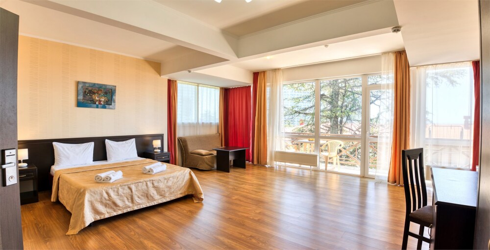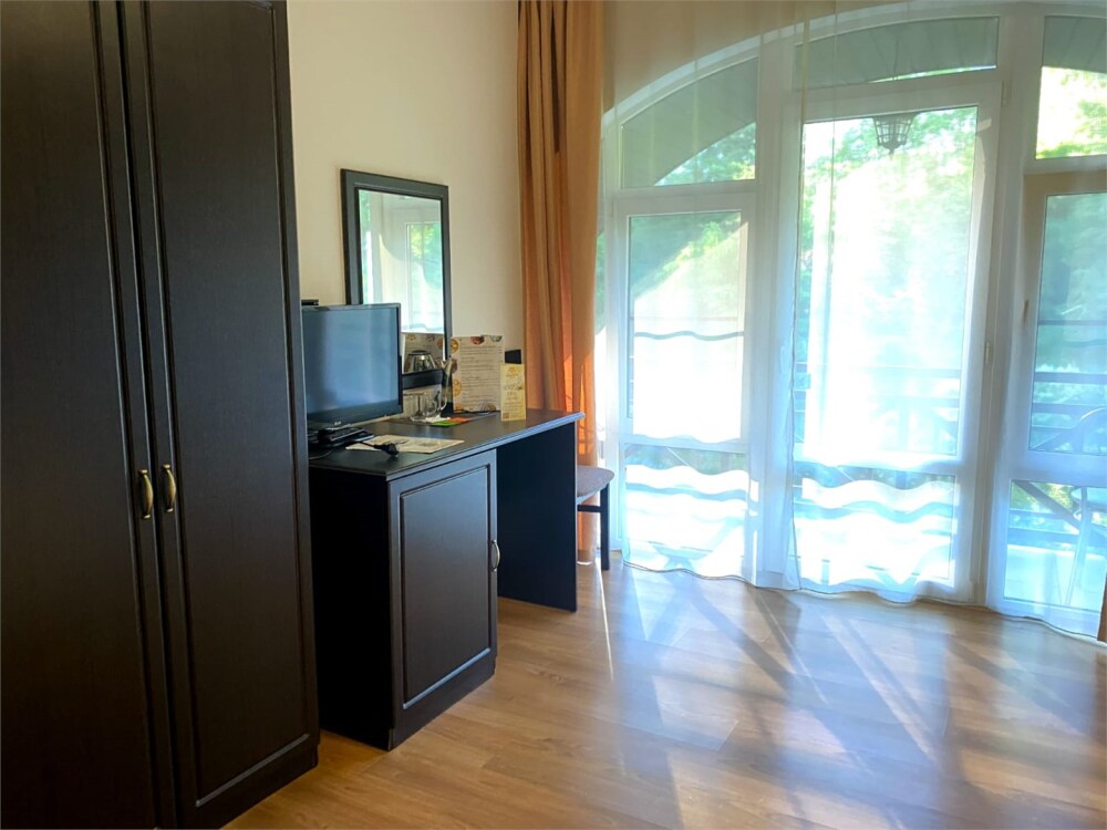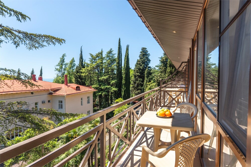 В номере есть балкон с видом на деревья и город, Wi-Fi и журнальный стол, за которым можно работать.