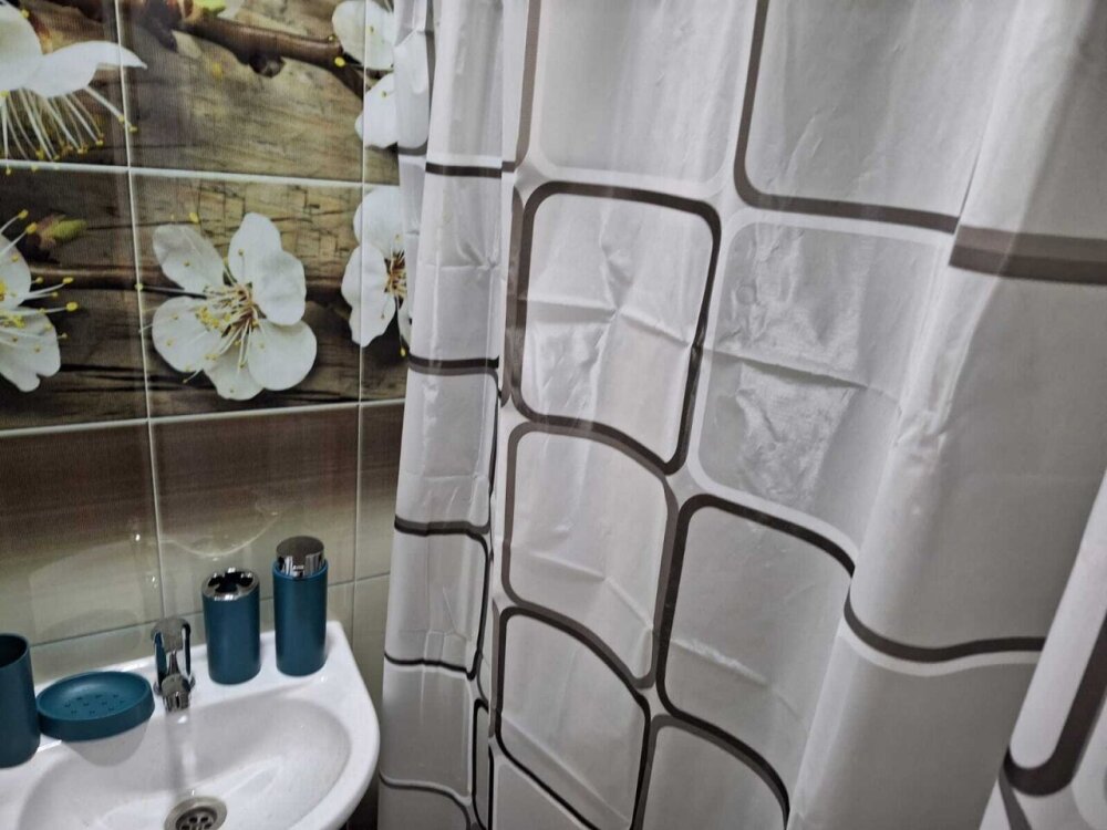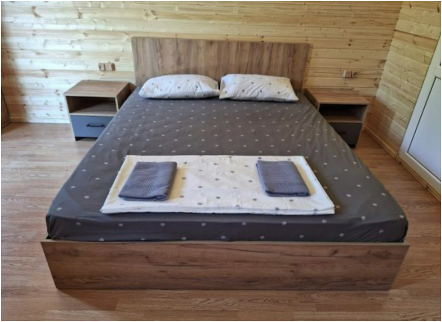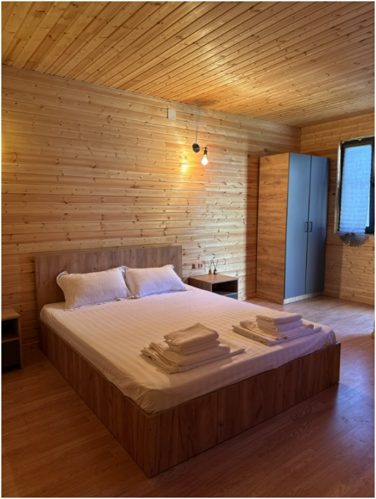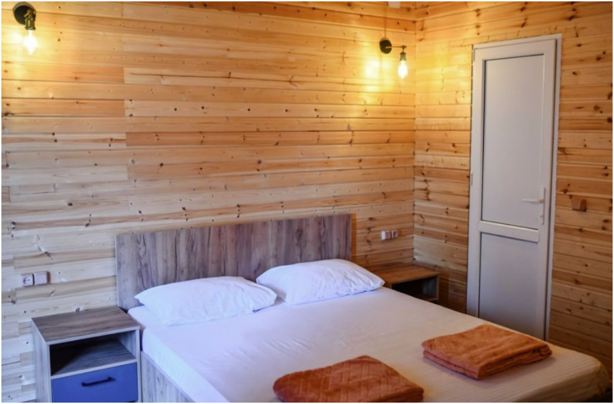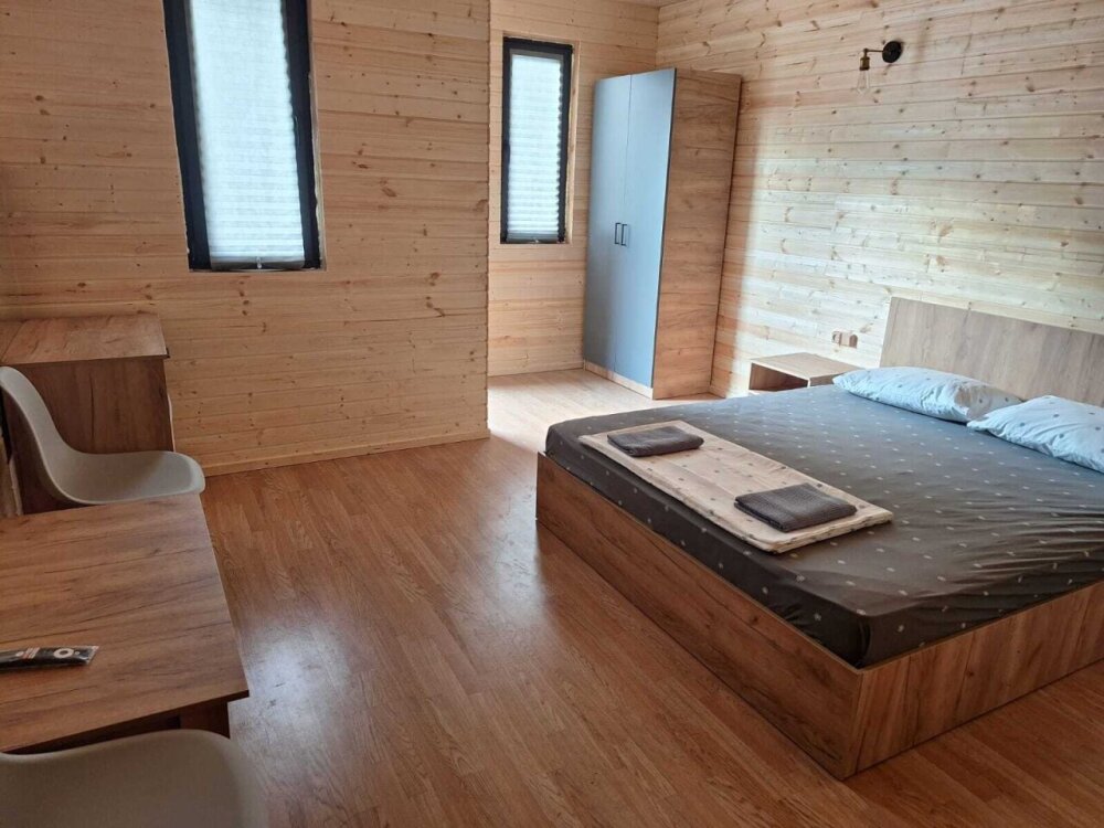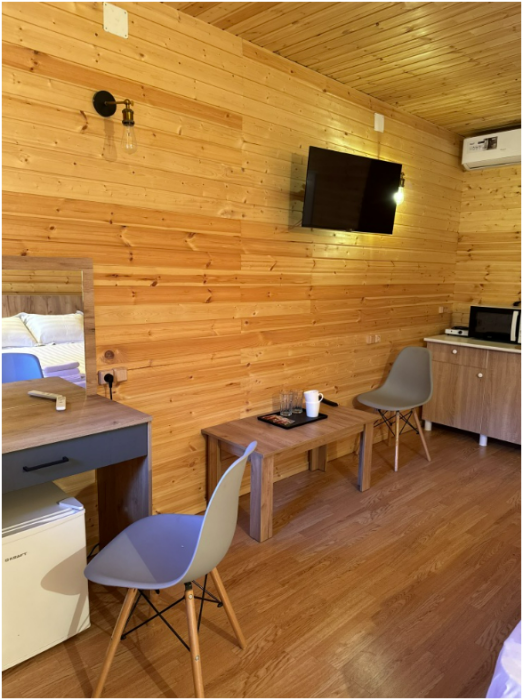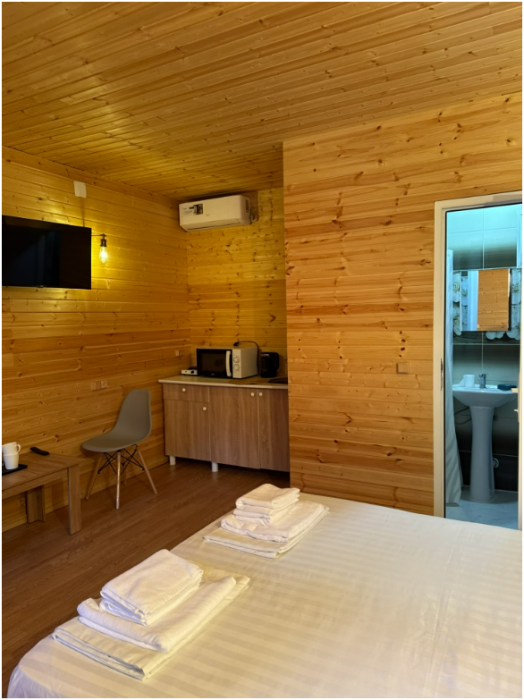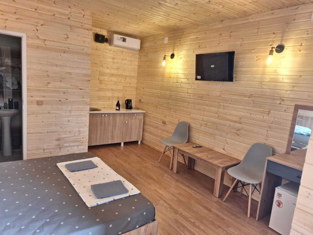 Комплекс новый, чистый. Поэтому, не хватало некоторых мелочей, типа фена, крючов для полотенец. Но хозяин на просьбы быстро реагировал, привозил необходимое. В планах у хозяина установить бассейн, сделать кухонную зону. Будет ещё лучше. До моря минут 15 пешком. Рядом неплохая столовая, есть продуктовый и хозяйственный магазин.