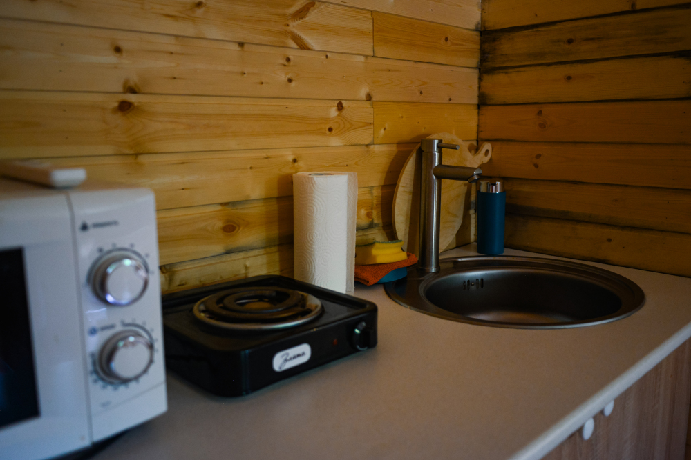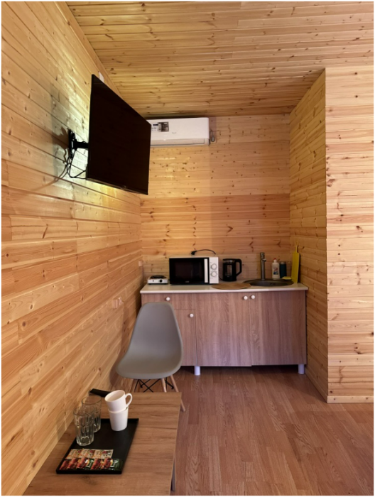В каждом доме есть душ и санузел. В каждом номере есть телевизор, чайник, фен, плита, микроволновая печь и вся необходимая посуда.