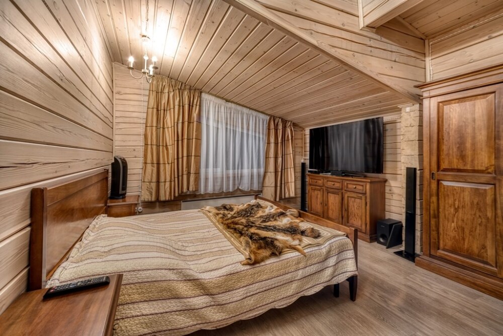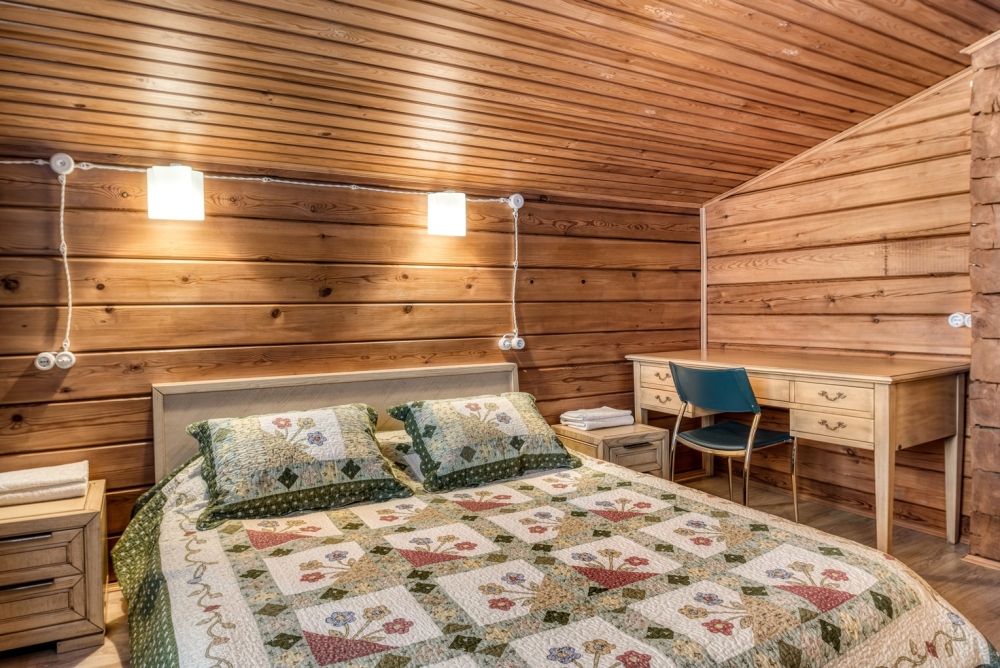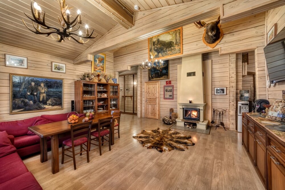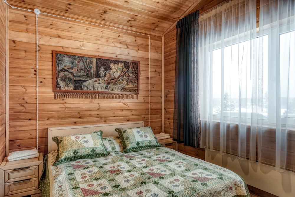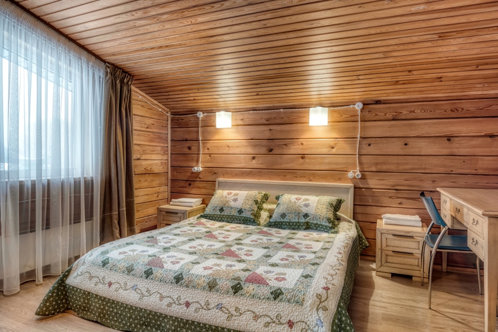 Это большой (200м2) и уютный коттедж отличается неповторимым колоритом и самобытностью в стиле охотничьего дома. В доме есть абсолютно всё для комфортного проживания 8-10 гостей. Светлая веранда оснащена садовой мебелью. В центре гостиной почётное место занимает массивный стол, который собирает гостей у большого камина. Три спальни смогут разместить до 10 гостей. В доме есть современная просторная кухня с плитой, духовкой, микроволновой печью, холодильником и посудой для сервировки и приготовления