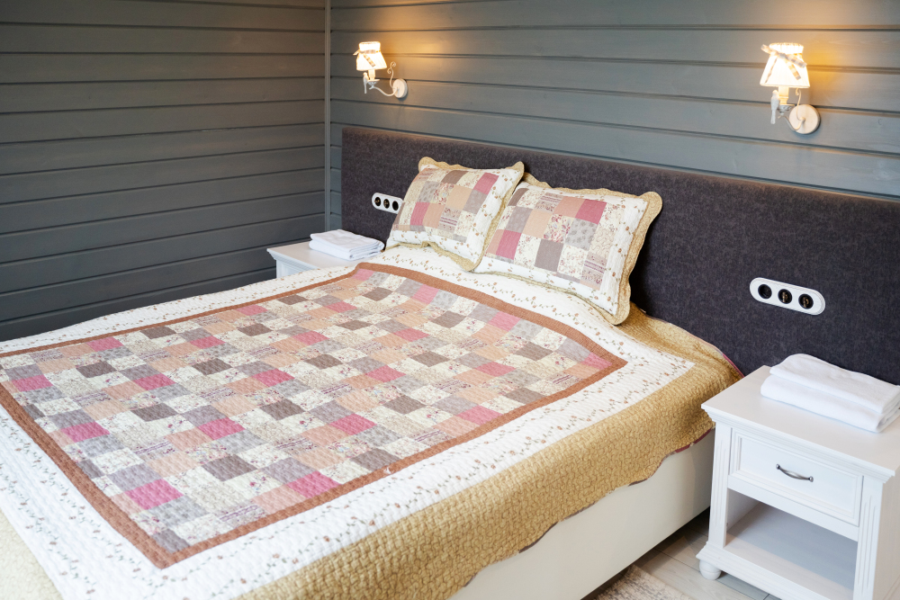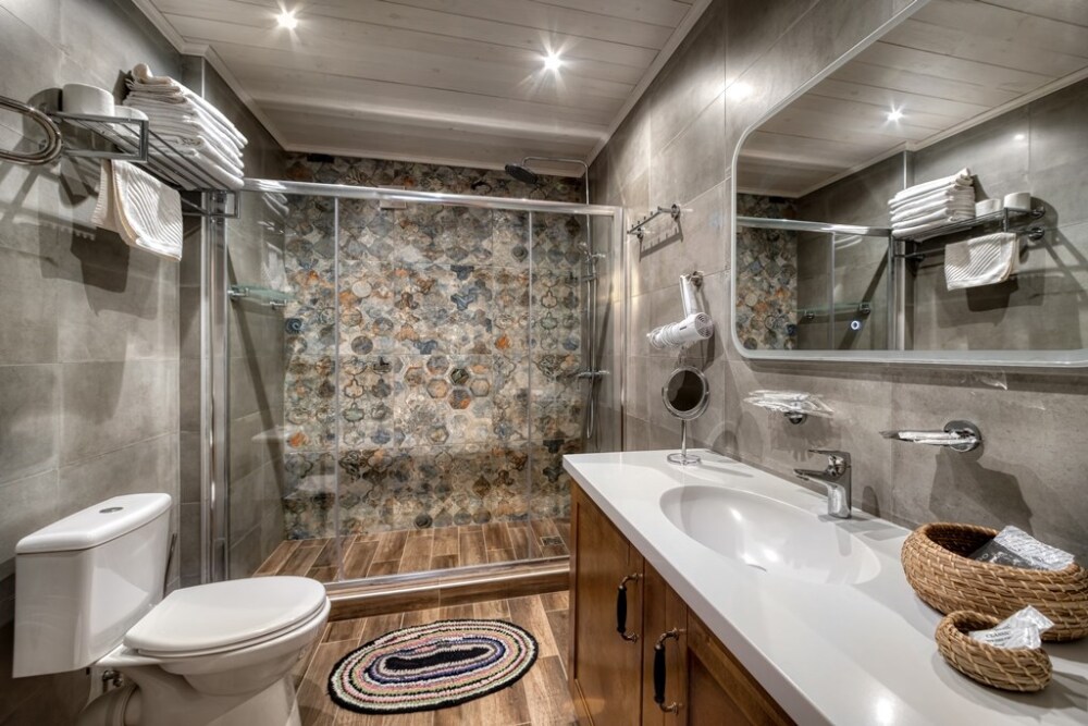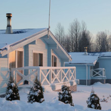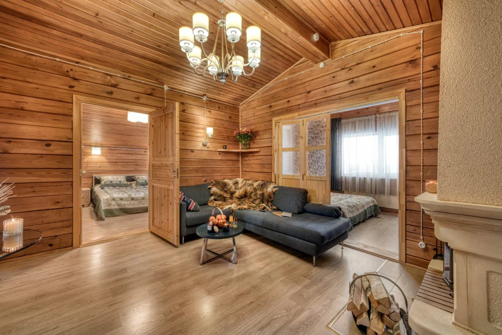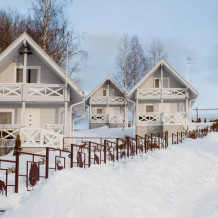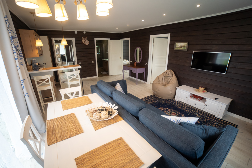Дом , общей площадью 80м2. Интерьер коттеджей сочетает в себе лучшие черты современности и красоту классического стиля. Прихожая с подогревом полов, шкаф-купе с зеркальными дверьми и комодом. Коттедж с двумя спальнями и гостиной комнатой. В первой спальне двуспальная кровать, во второй две полутораспальные кровати. В гостиной находится кухонная зона, оснащённая чайником, капсюльной кофемашиной Nespresso , микроволновой печью, газовой панелью, холодильником, посудой для приготовления и сервировки.