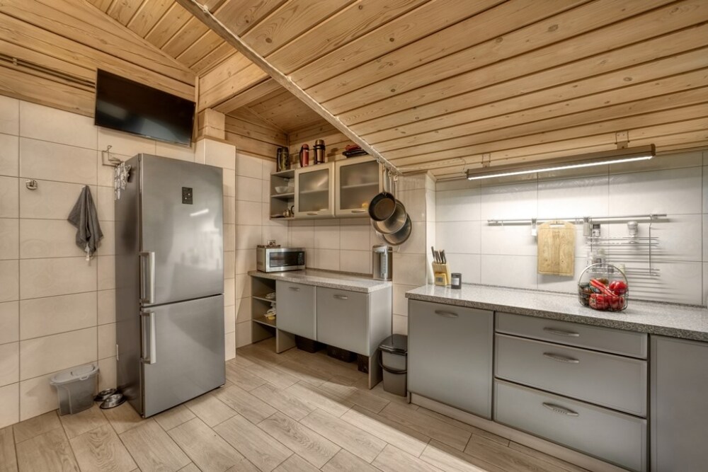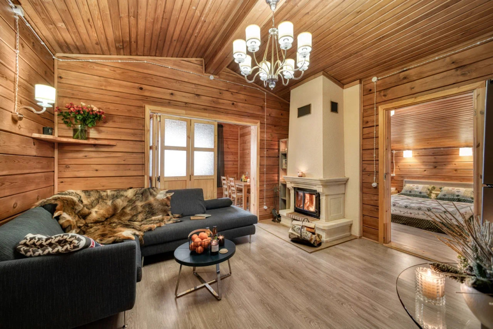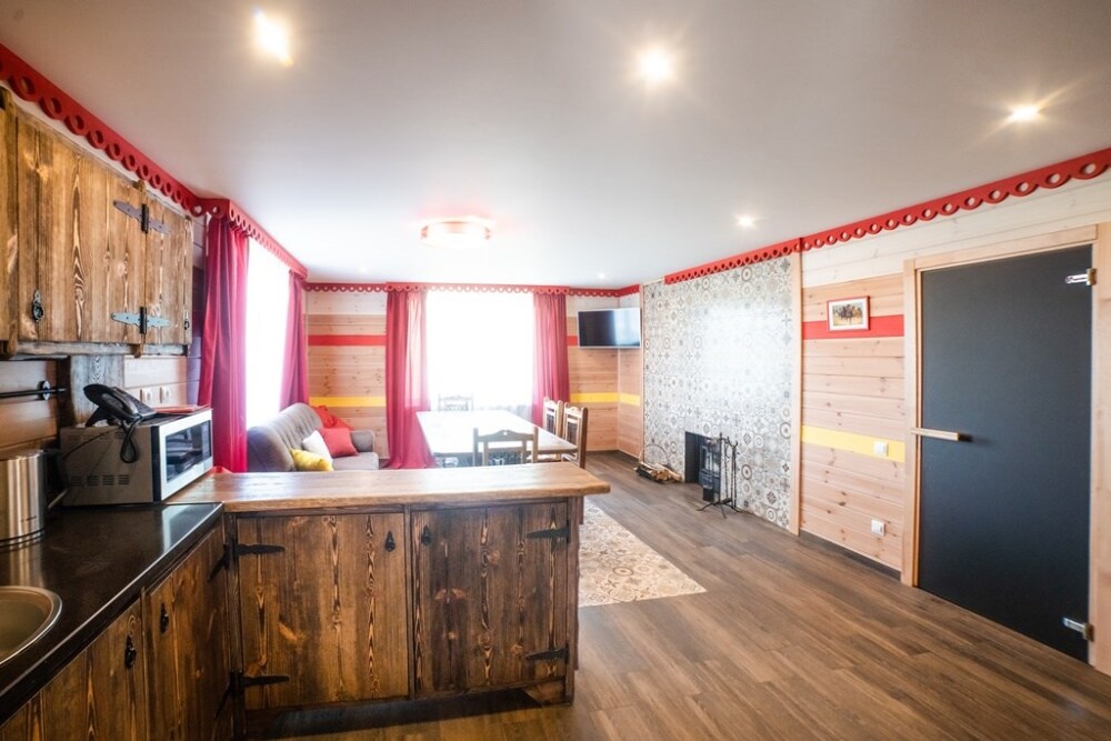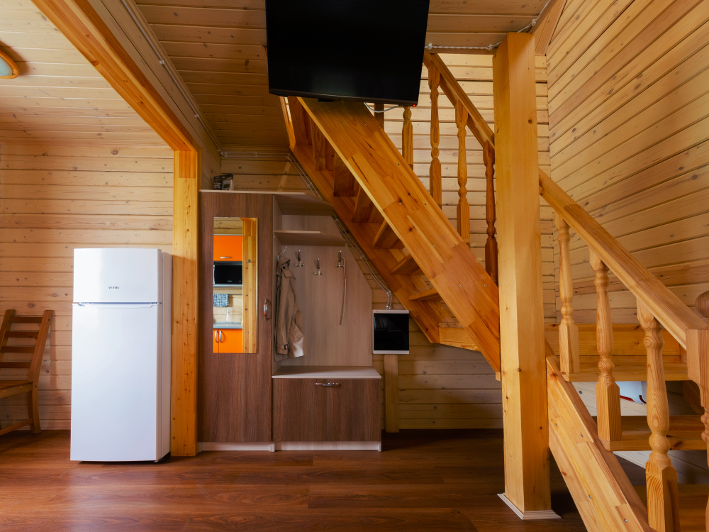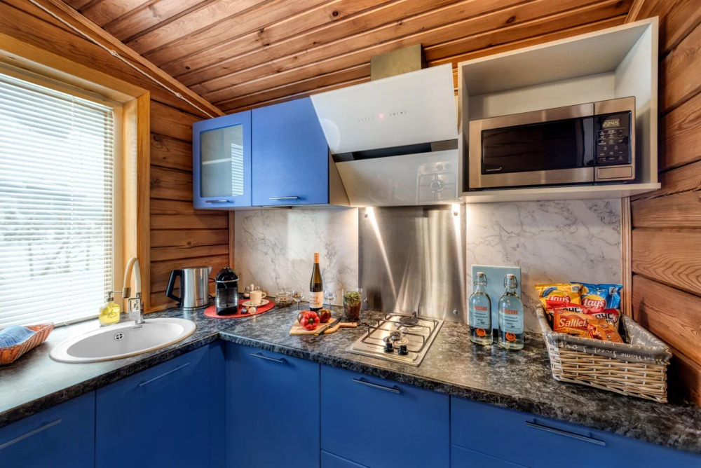 На мансардном этаже находится спальня на 4 места, на первом этаже гостиная, кухонная зона и санузел с душевой кабиной. Небольшая кухня укомплектована микроволновой печью, чайником, холодильником, капсульной кофемашиной и посудой для сервировки. В уютной столовой зоне: обеденный стол со стульями, диван, телевизор