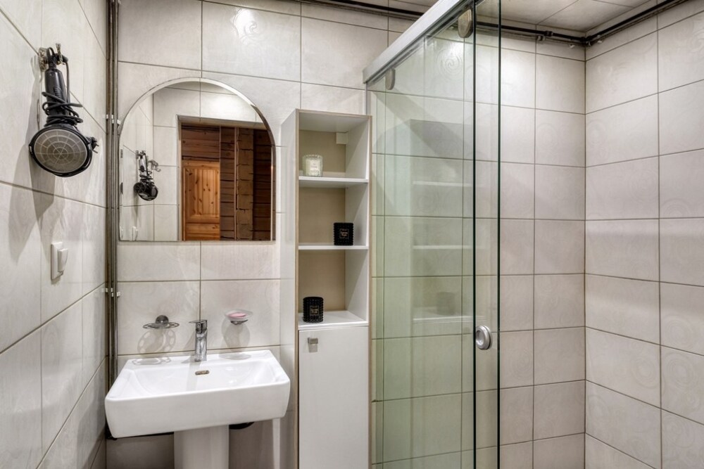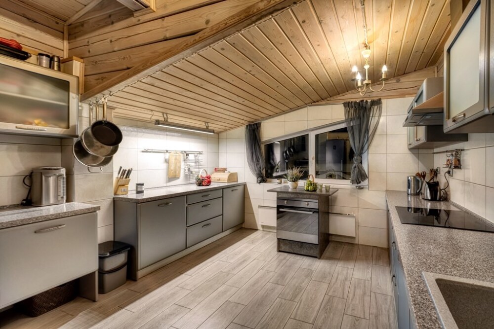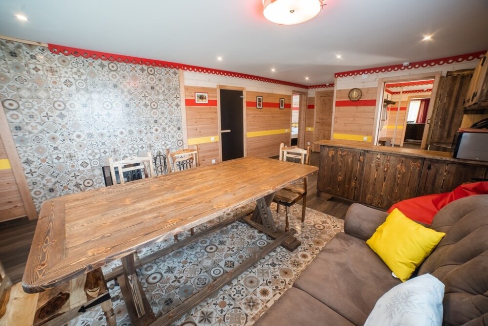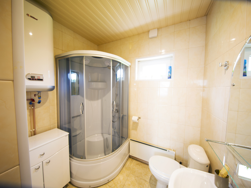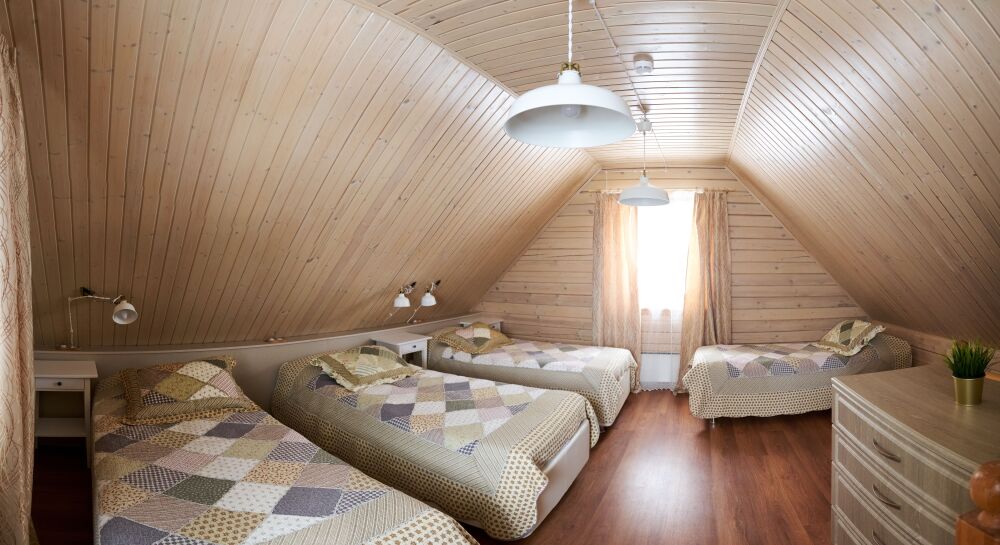 На мансардном этаже находится спальня на 4 места, на первом этаже гостиная, кухонная зона и санузел с душевой кабиной. Небольшая кухня укомплектована микроволновой печью, чайником, холодильником, капсульной кофемашиной и посудой для сервировки. В уютной столовой зоне: обеденный стол со стульями, диван, телевизор