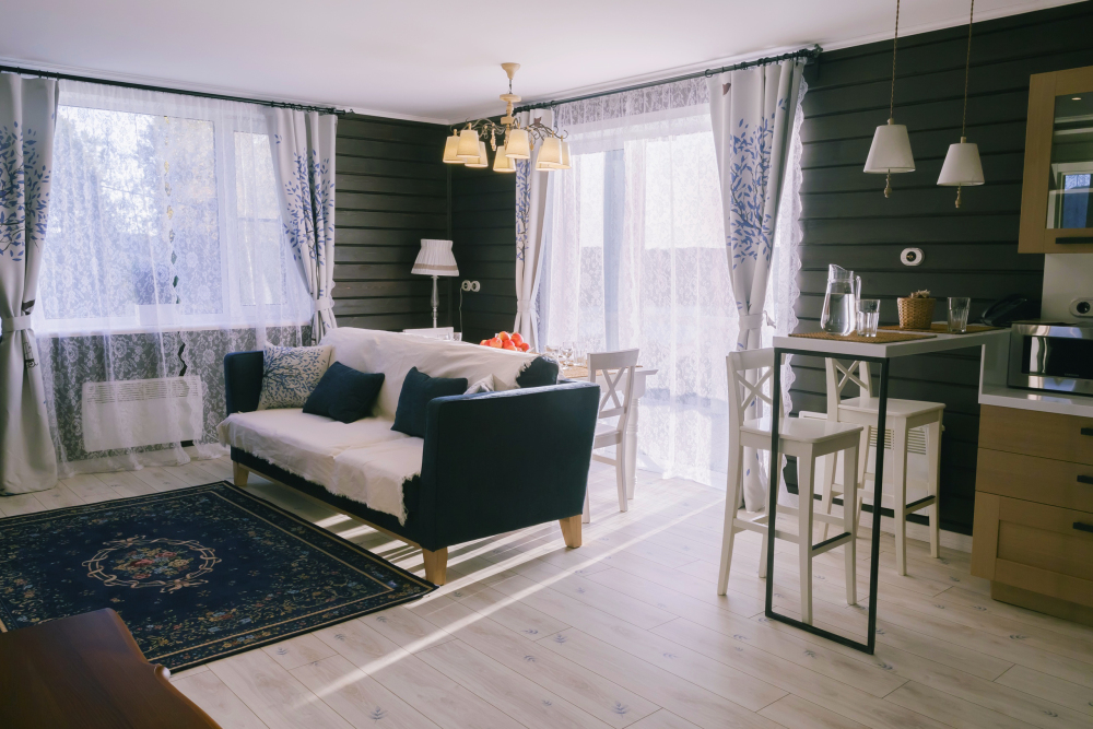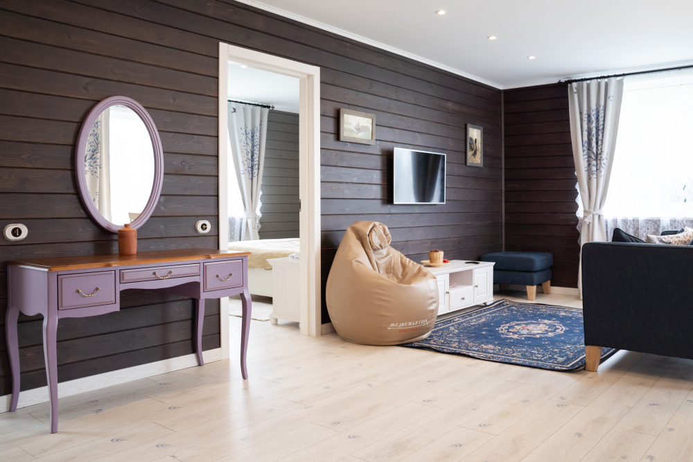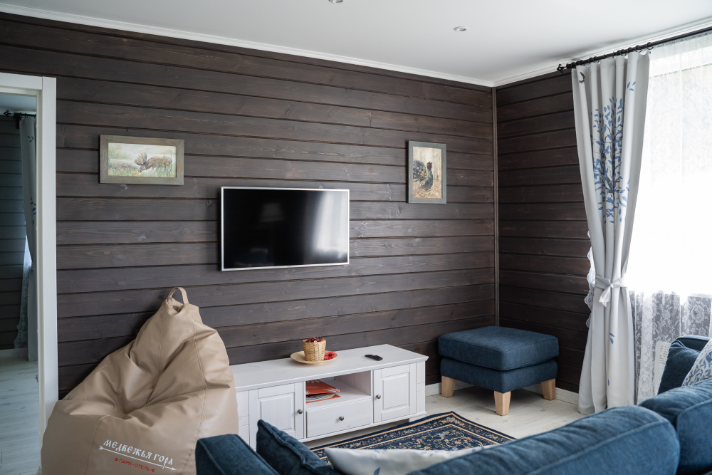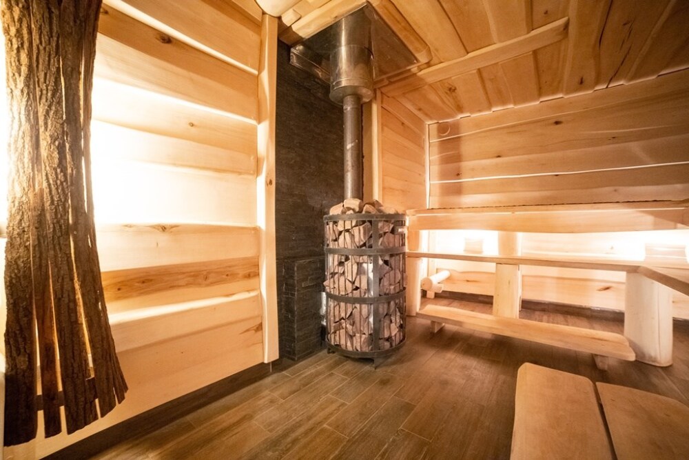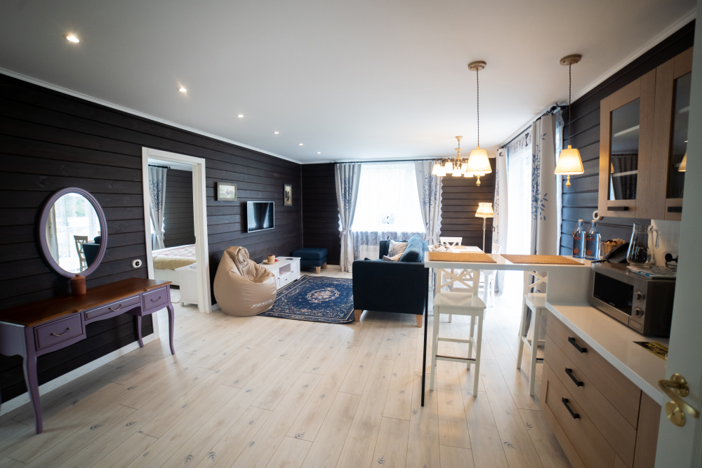 Дом Баня аналогичен Большим домам в Парк-отеле: с просторной меблированной гостиной с кухонной зоной. В Доме есть спальня с двуспальной кроватью. Из гостиной вход в парилку.