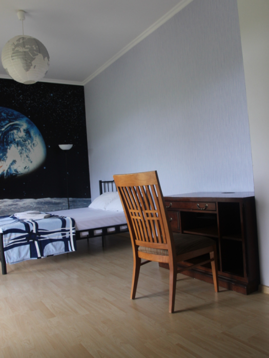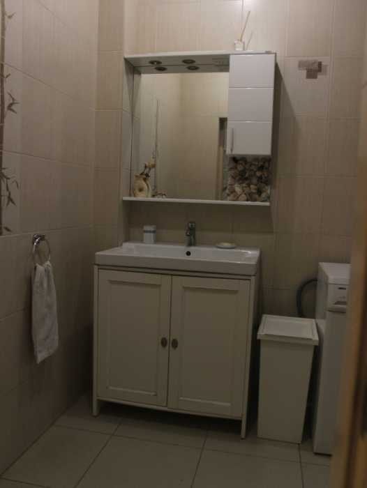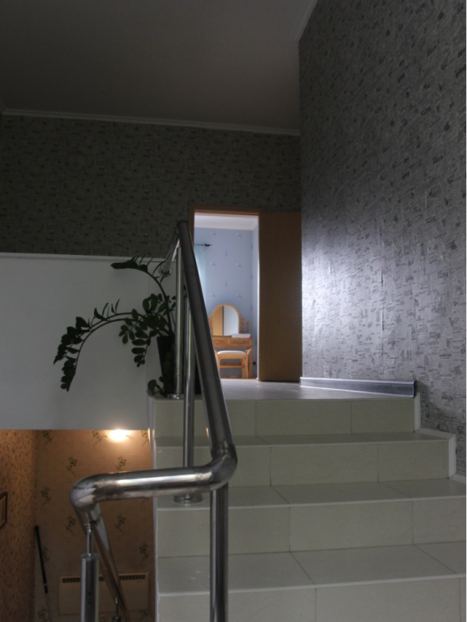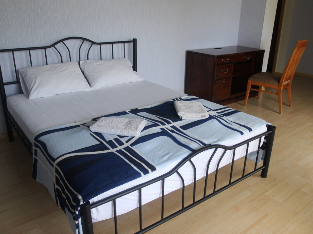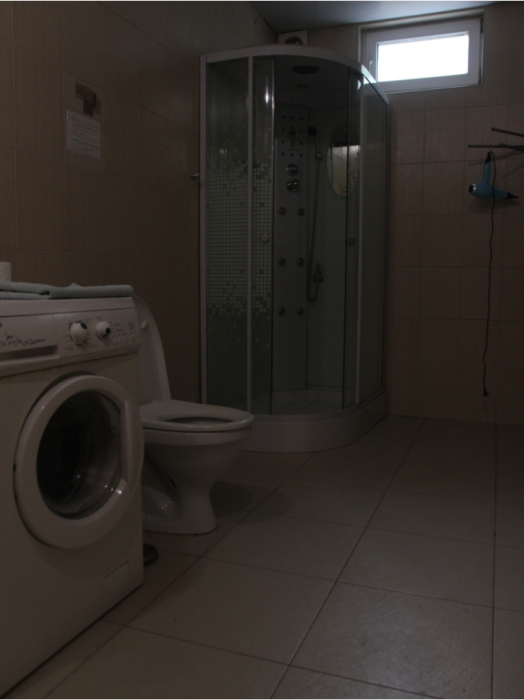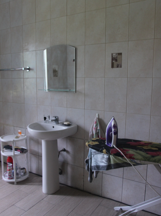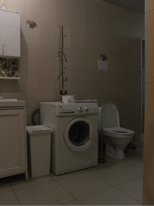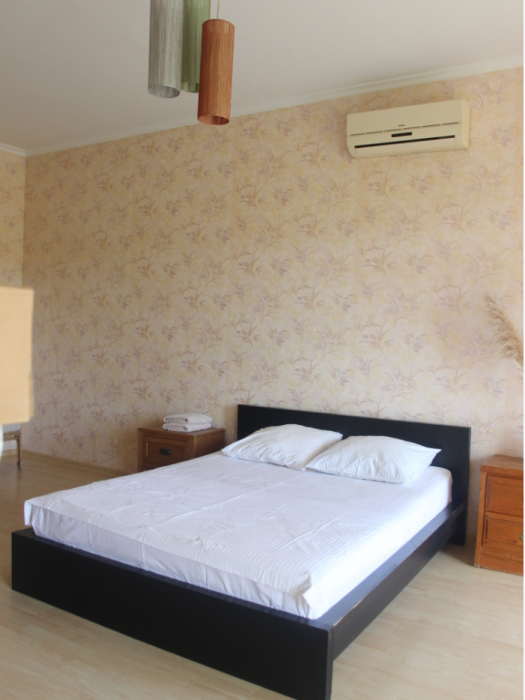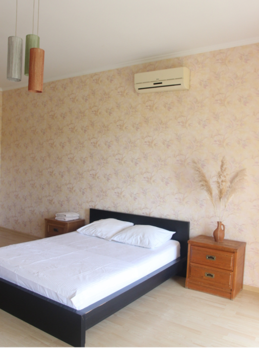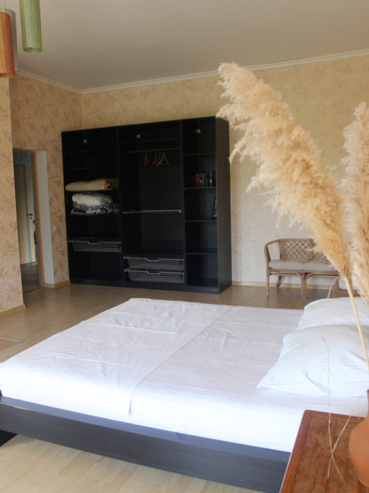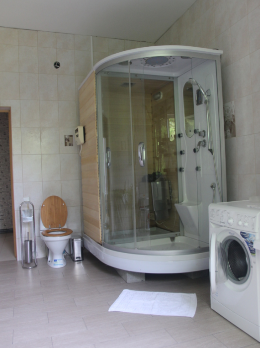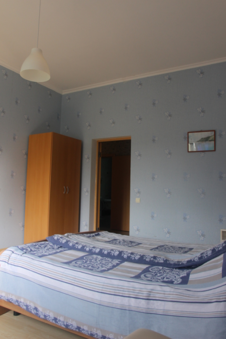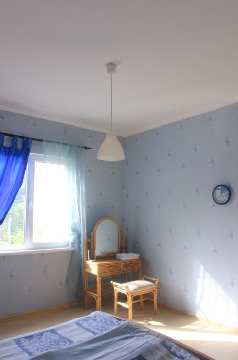 Три большие светлые спальни оснащены двуспальными кроватями, шкафом, кондиционером и отоплением. Два санузла с душем и раковиной находится в коридоре первого и второго этажа. Мы предоставляем гостям постельное белье, банные полотенца, полотенца для кухни и фен. Есть мини-сауна, стиральная машина. Гостиная первого этажа оборудована современной кухней: плита, холодильник, чайник, посуда, посудомоечная машина, духовка, большой диван, стол и телевизор, работает Wi-Fi через сотовую связь.