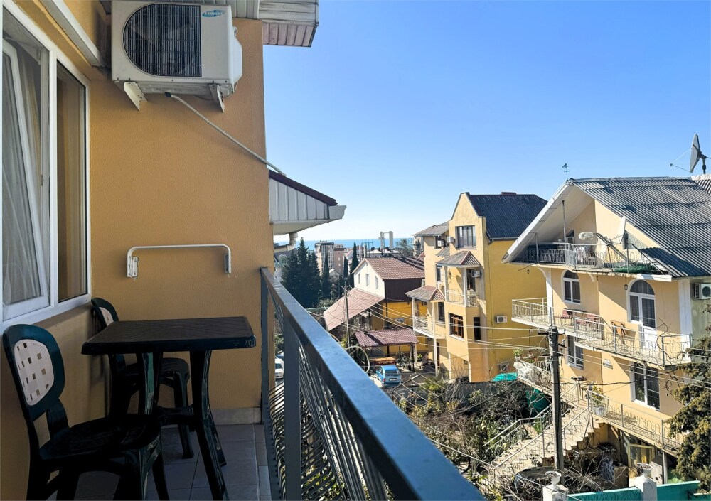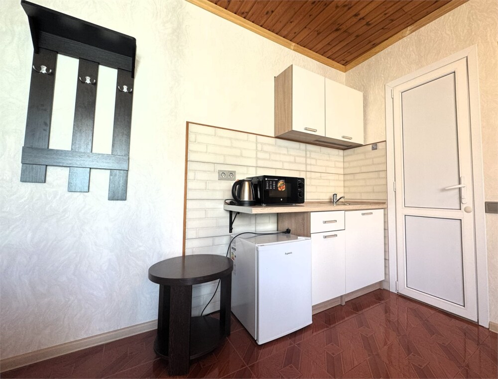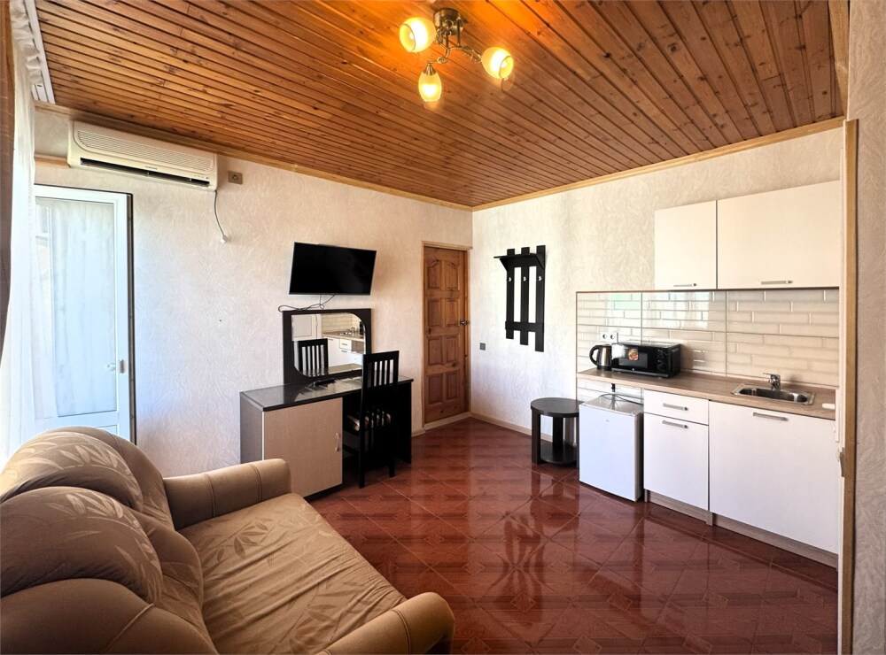 Номер-студия с мини-кухней и балконом (на два номера). Один ребёнок до 5 лет — можно без отдельного спального места.