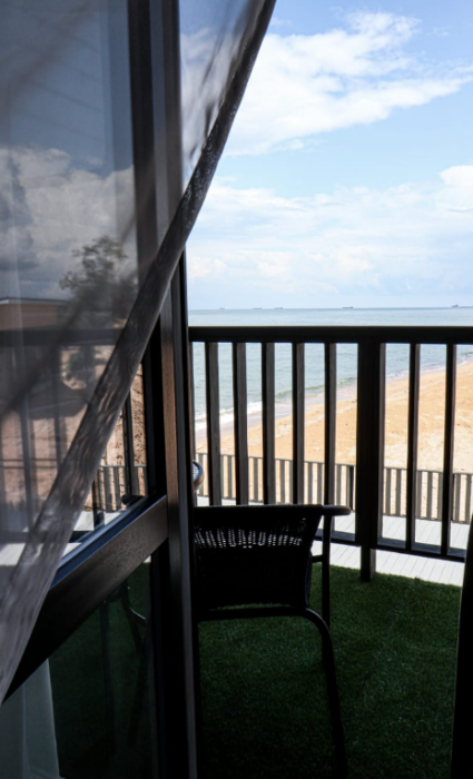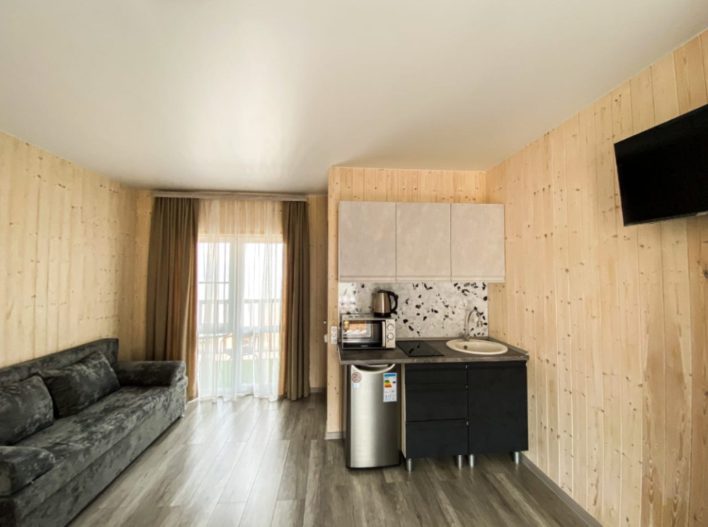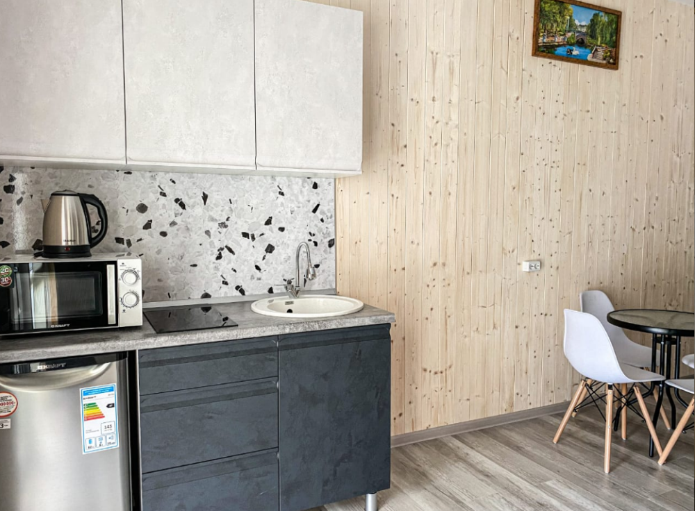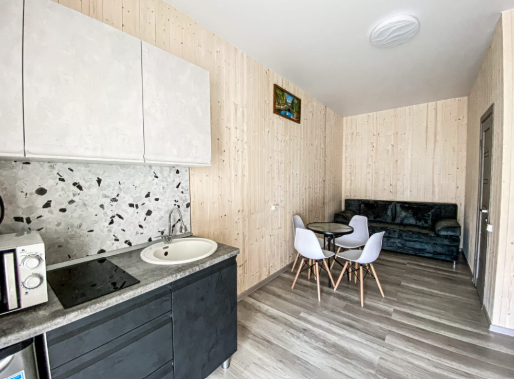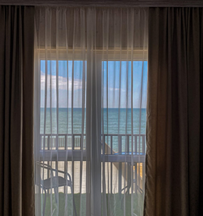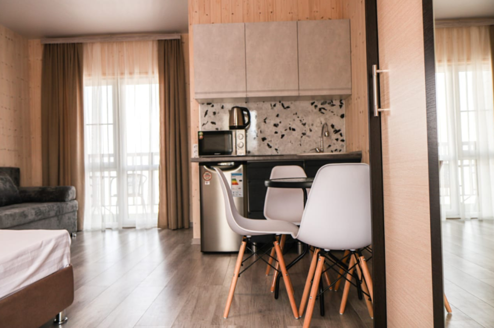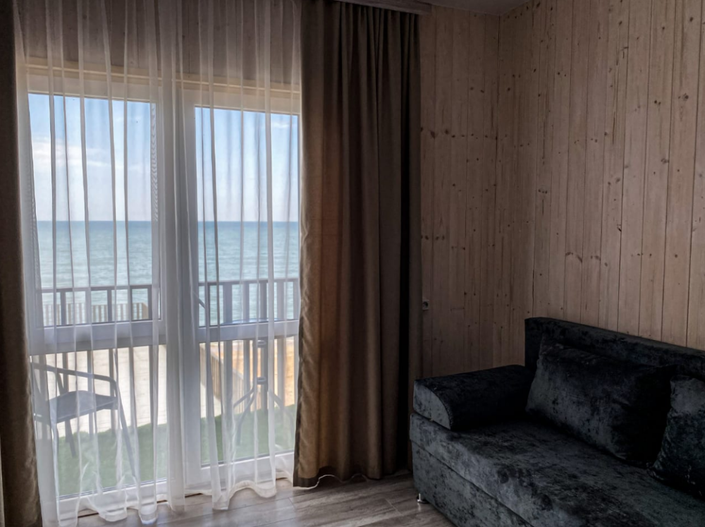 Прекрасный выбор для спокойного семейного отдыха. В номере есть всё необходимое: посуда, микроволновка, чайник, и даже белоснежное постельное бельё. Единственный недостаток - отсутствие бокалов для вина, но мы легко справились, используя кружки для чая ???? Вид из номера, особенно если жить в студии, просто великолепен! Засыпать и просыпаться под шум прибоя - настоящее удовольствие. Мы уверены, что это лучшее месторасположение отеля в Голубицкой! Если мы ещё раз поедем в этот район, то только в этот отель! Администратор - очень приятная и милая женщина, всегда готова помочь и оперативно решает все вопросы.