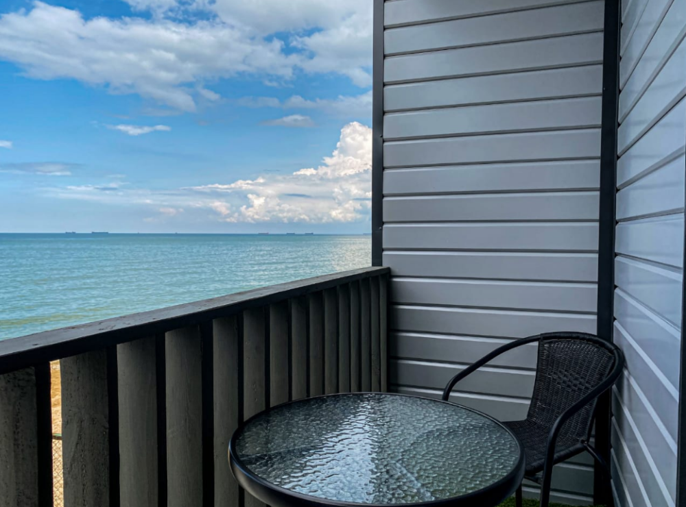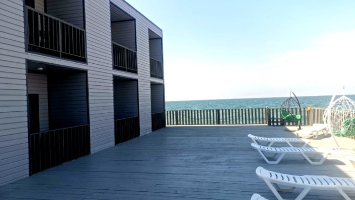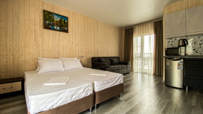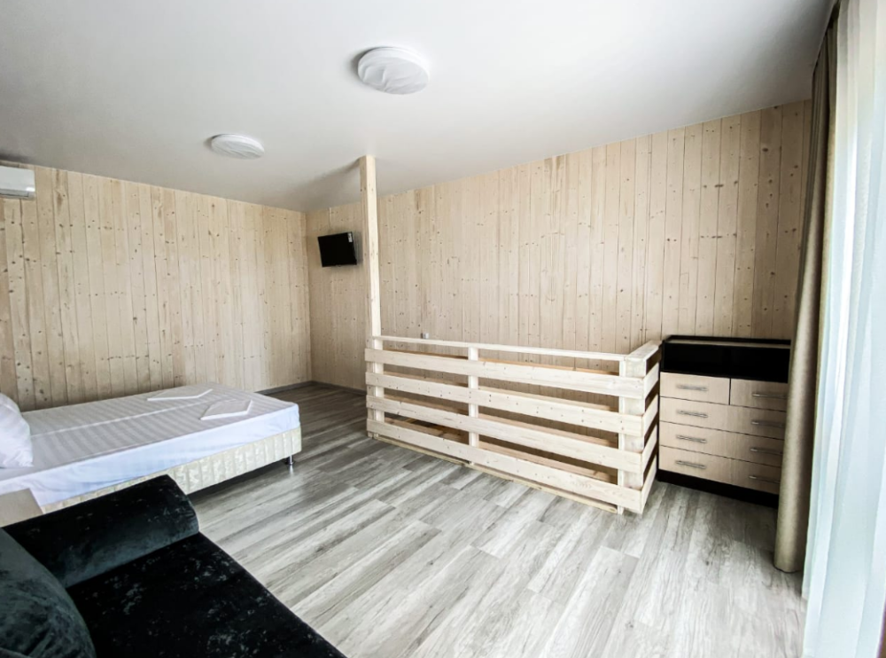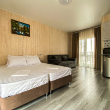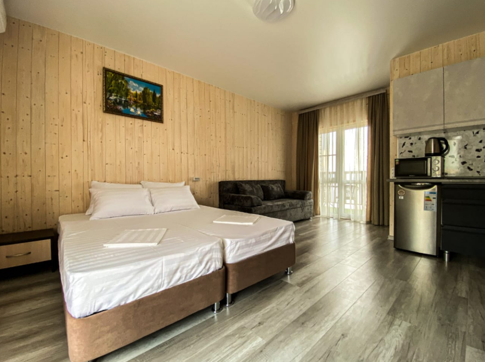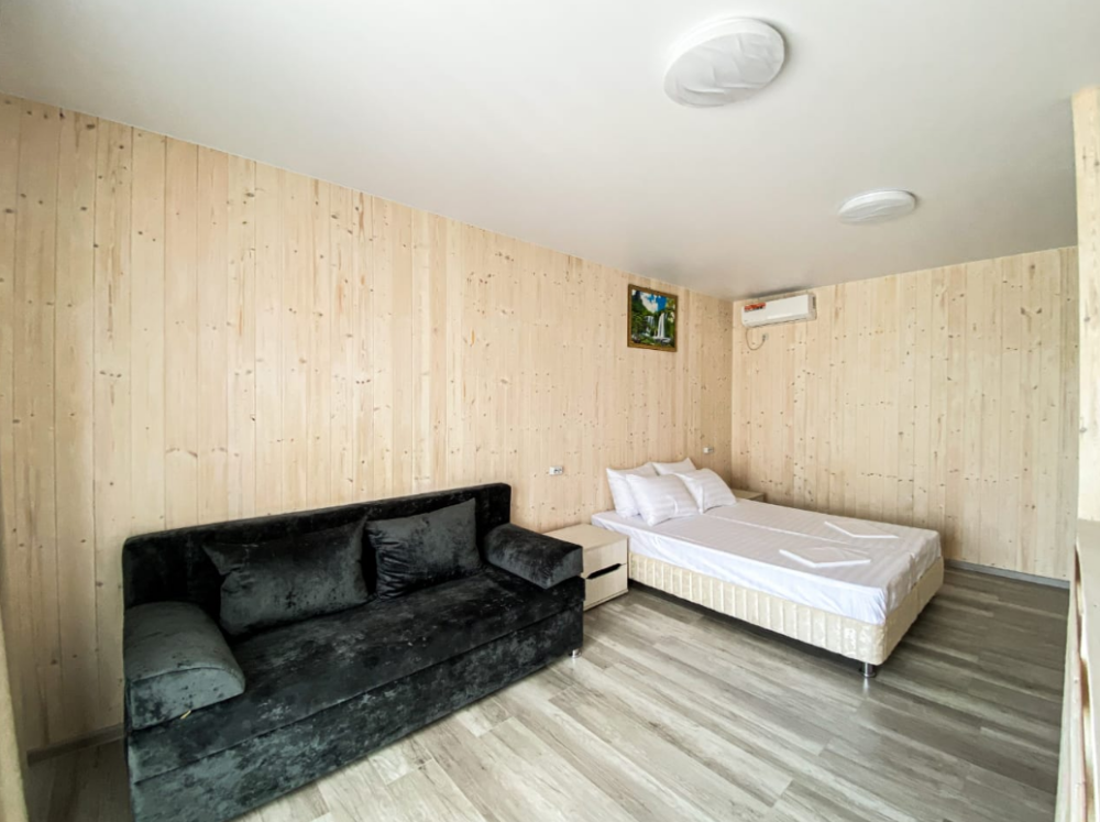 Отель превосходный! Наш отпуск с ребенком прошел замечательно. Среди преимуществ: выходишь из номера - и через два шага уже в море, есть навес от солнца неподалеку, хоть и без лежаков, но людей здесь мало, и это главное преимущество. Наш номер был студия на четверых. При заезде было чисто (весь отпуск никто не убирался, но нам это и не требовалось). Есть все необходимое для готовки. Предоставляются полотенца для всех, включая ребенка (одно большое и одно маленькое на всех постояльцев, включая ребенка). Телевизор с интернетом + Wi-Fi на территории, даже доходит до пляжа. Веранда прекрасная, хотя уже немного изношена другими отдыхающими (из трех качелей две сломаны). Парковка платная, всего в двух шагах (250 рублей в сутки). Если вы предпочитаете оживленные пляжи с киосками (чебуречные, столовые, сувенирные) и активным водным отдыхом, нужно пройти вдоль пляжа всего 5 минут.