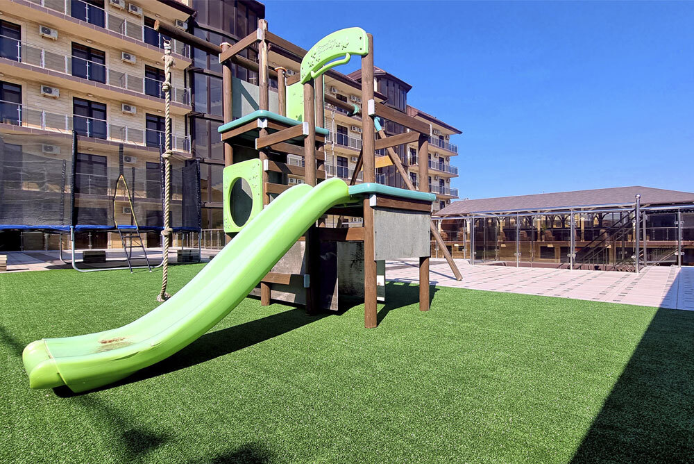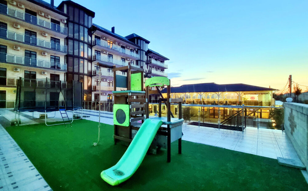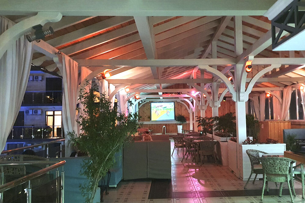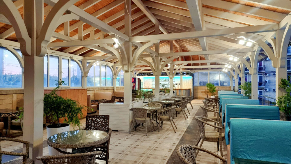На благоустроенной огороженной территории - большой открытый бассейн с отделением для самых маленьких, шезлонги, игровая детская площадка, батут, столы для настольного тенниса. Для детей предусмотрены анимационные программы. Кафе и бар, оформленные в оригинальном интерьере, с летней верандой, прилегающей к бассейну, предлагают гостям разнообразное, вкусное, недорогое питание, шашлыки, блюда на мангале, напитки.
