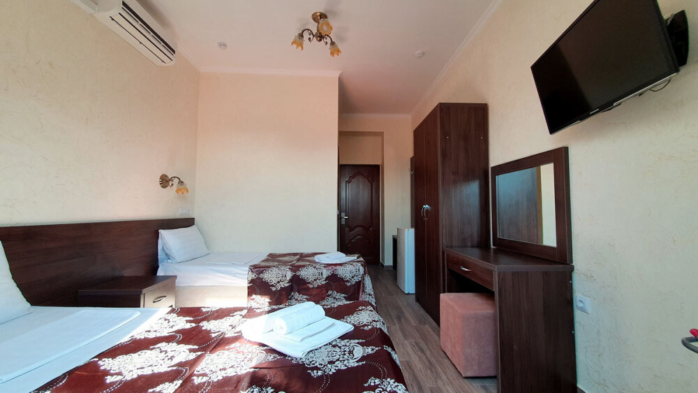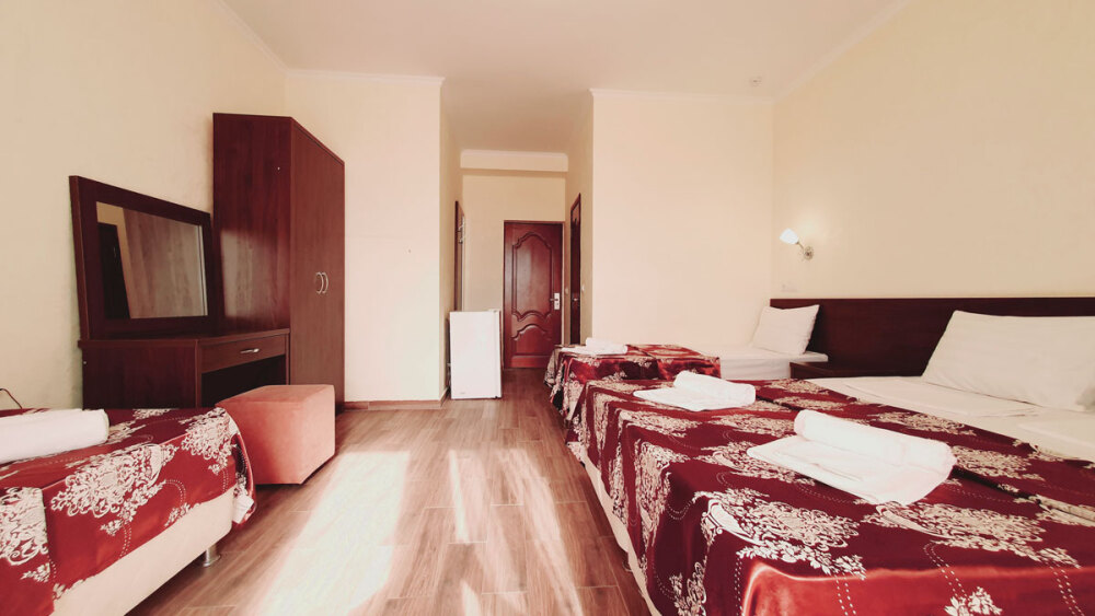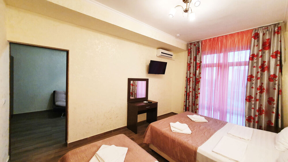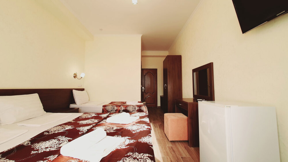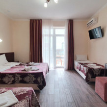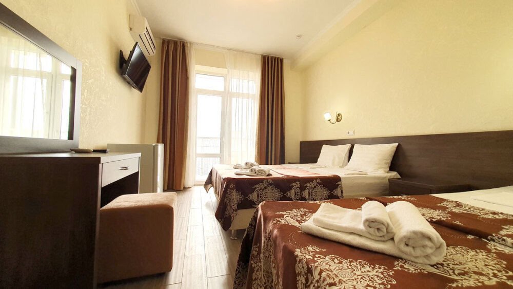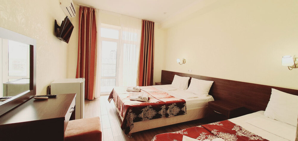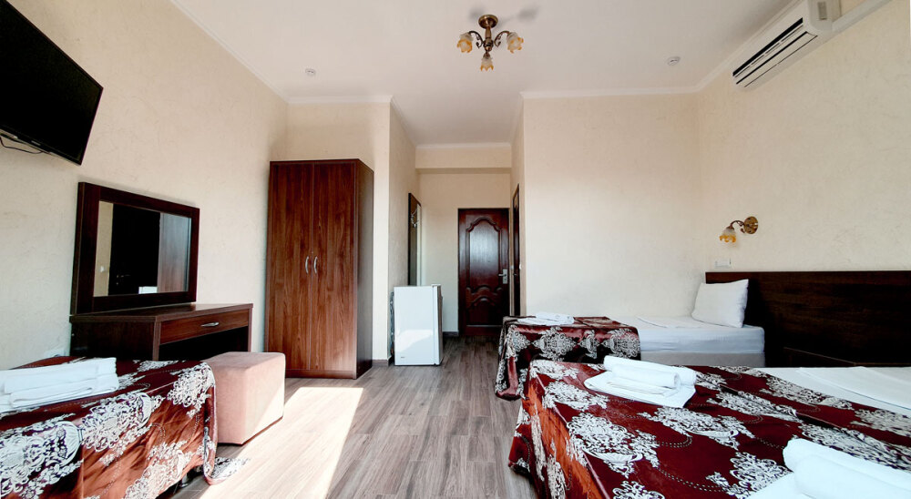 Комфортабельный номер (площадь: 25 м²) с удобствами, без балкона. Предназначен для размещения до четырех гостей. Оборудован двуспальной и двумя односпальными кроватями, кондиционером, телевизором, холодильником.