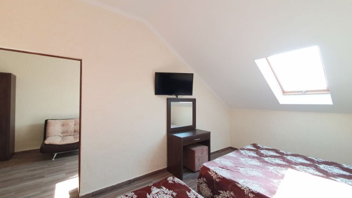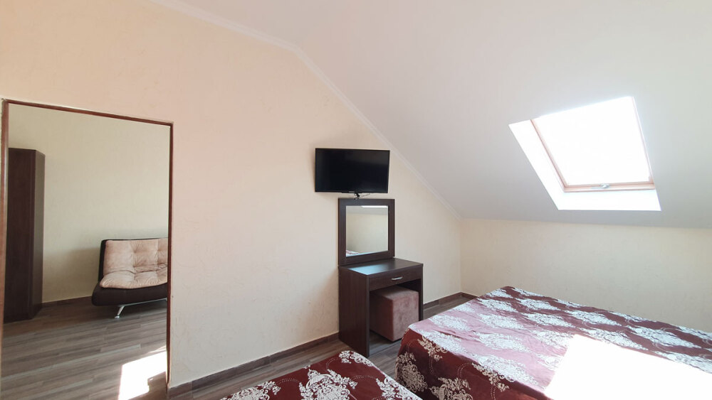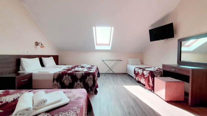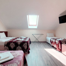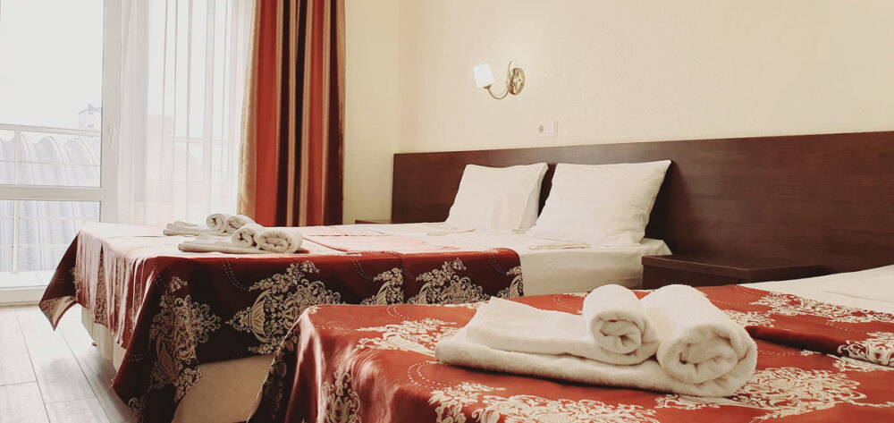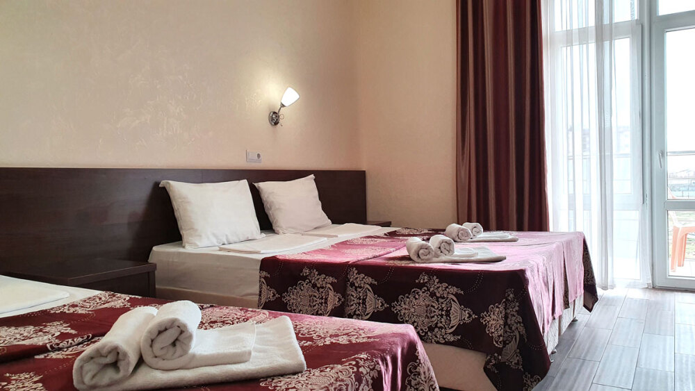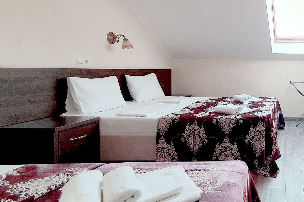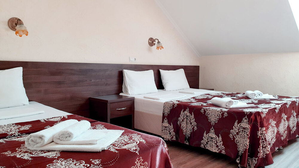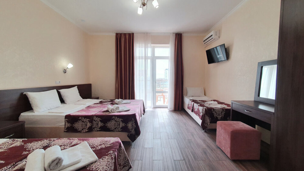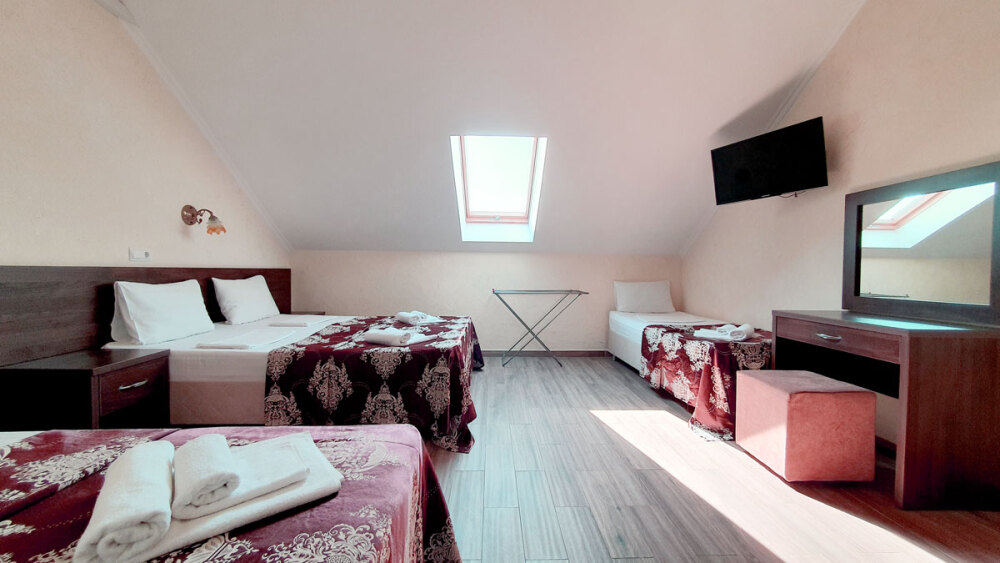 Комфортабельный номер (площадь: 25 м²) с удобствами и балконом. Предназначен для размещения до четырех гостей. Оборудован двуспальной и двумя односпальными кроватями.