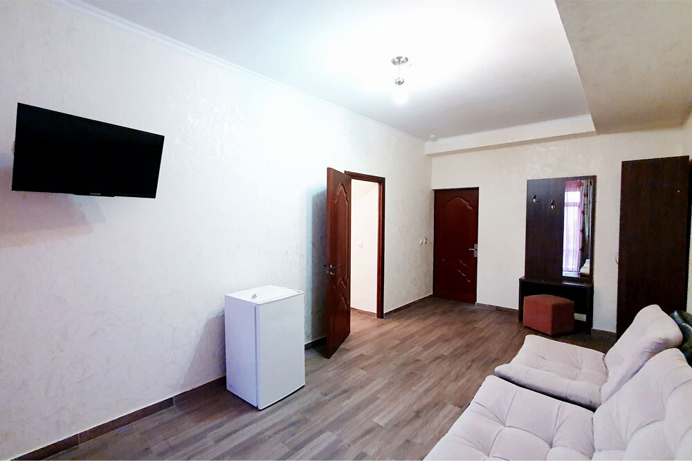 Двухкомнатный комфортабельный номер (площадь: 50 м²). Предназначен для размещения до четырех гостей. Спальня оборудована большой двуспальной и односпальной кроватями, в гостиной - диван и кресло. Жк-телевизоры в обеих комнатах.