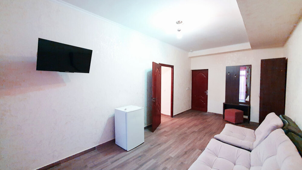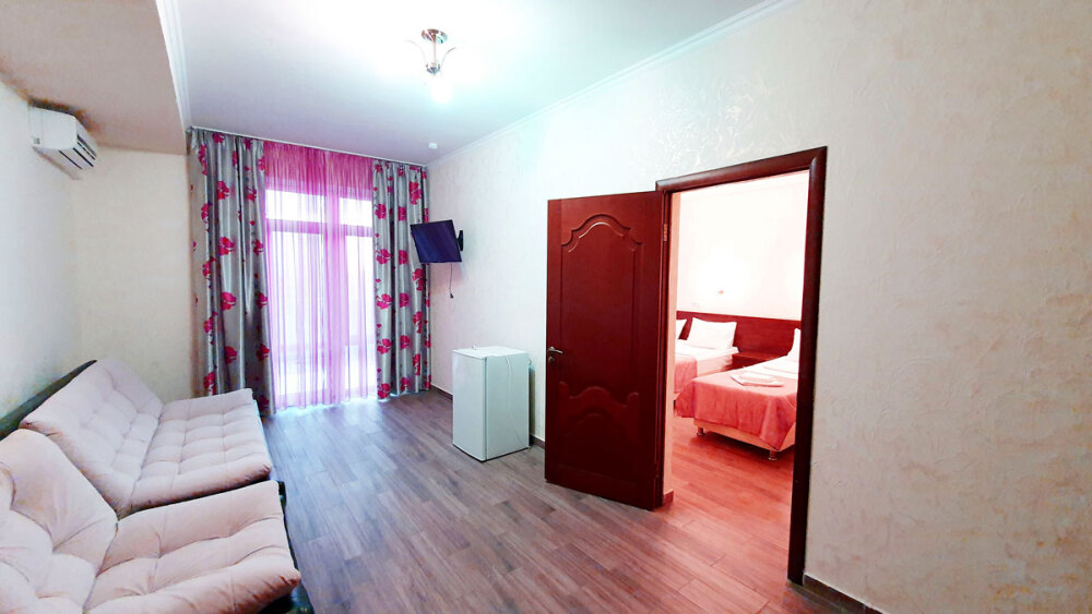 Двухкомнатный комфортабельный номер (площадь: 50 м²) с балконом. Предназначен для размещения до четырех гостей. Спальня оборудована большой двуспальной и односпальной кроватями, в гостиной - диван и кресло. Жк-телевизоры в обеих комнатах.