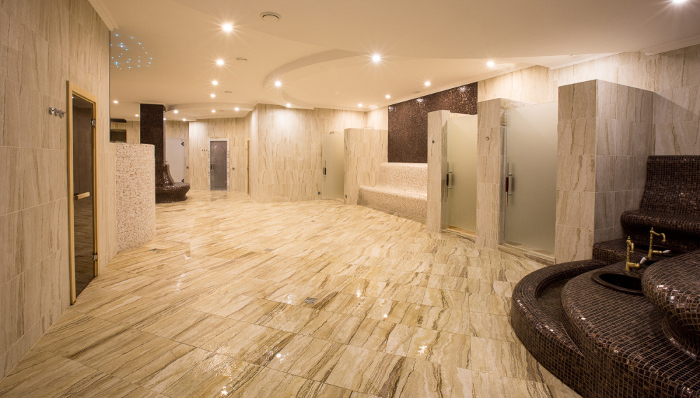 Посещение Банного комплекса включает: финскую сауну, турецкий хаммам, русскую парную, полотенца, тапочки, шезлонги в зоне бассейна.