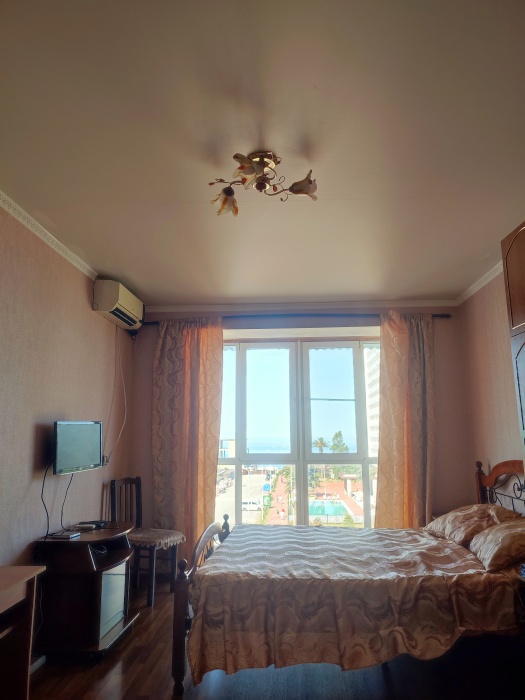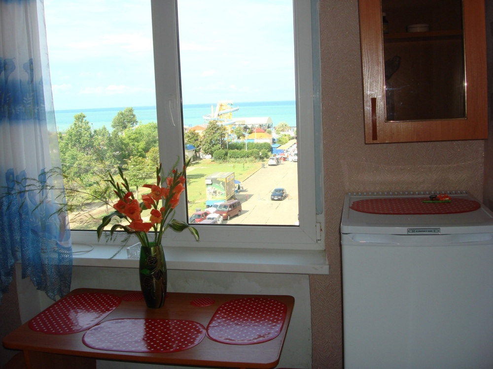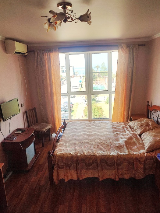 Витражные окна квартиры выходят на море и пальмы. В пяти минутах ходьбы мини-маркет, множество магазинов, большой выбор кафе, столовых и ресторанов. Квартира рассчитана 3 места (больше трех не принимаю) с двуспальной и односпальной кроватями, телевизором и кондиционером. Есть Wi-Fi.Оборудованная кухня (холодильник, плита, посуда и приборы, электрический чайник), совместный санузел с душевой кабиной, стиральной машинкой и феном. Предоставляю комплект полотенец, постельное белье, утюг.