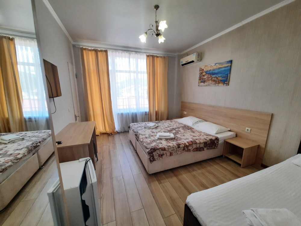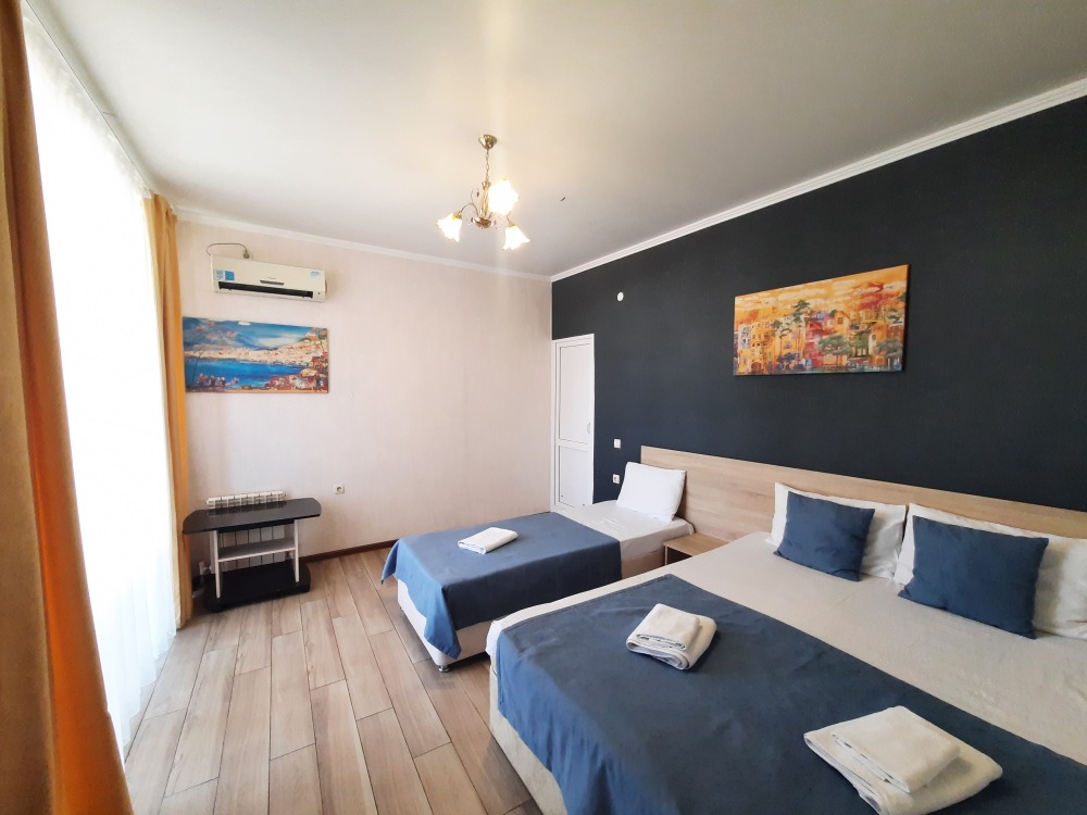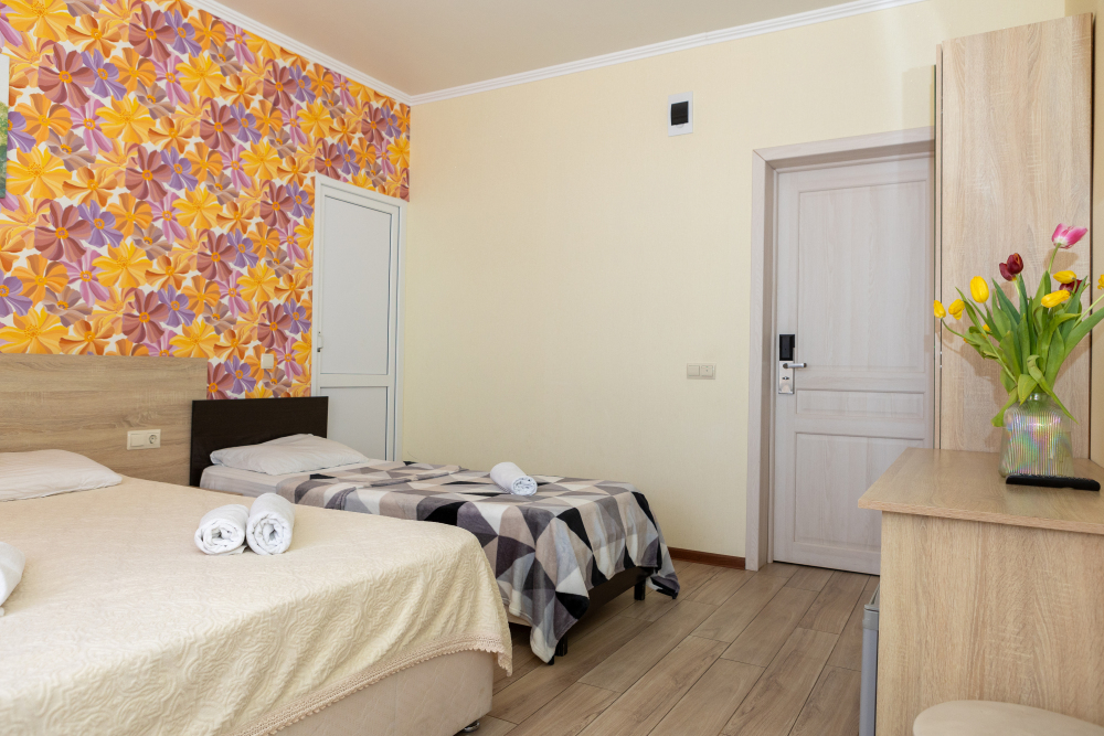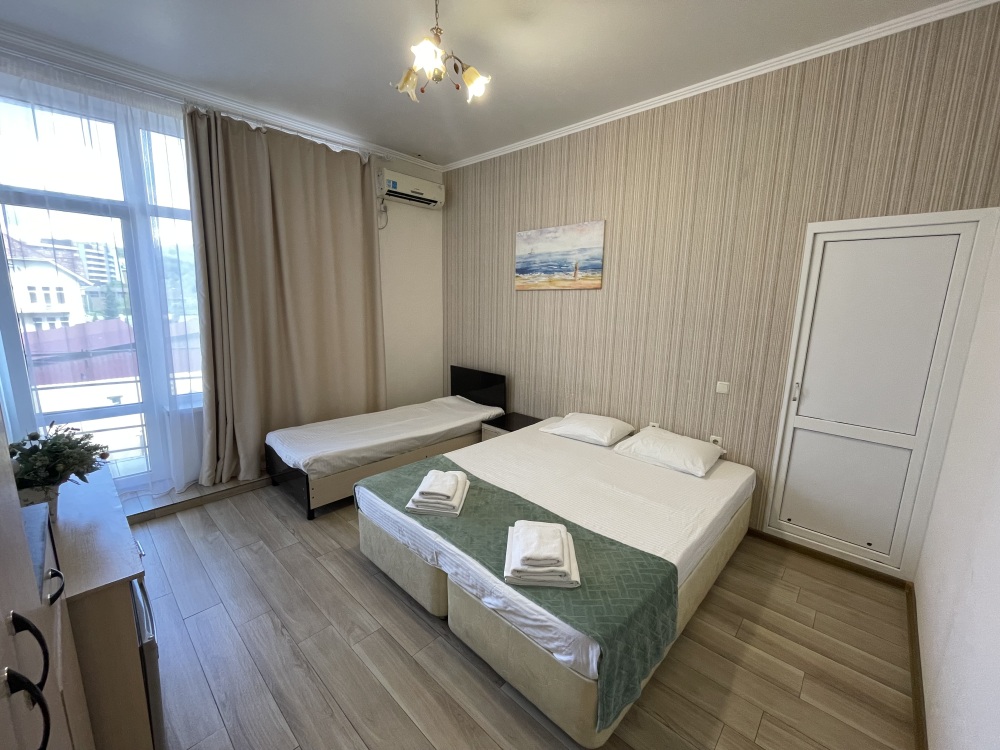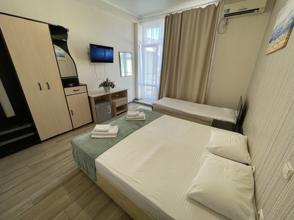 Просторный номер для 3 гостей с балконом расположены на 3-4 этажах гостевого дома. Номера в новом корпусе №2, высокие потолки, много света в комнате. В комнате двуспальная и односпальная кровати.