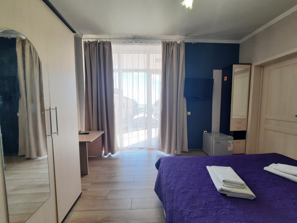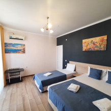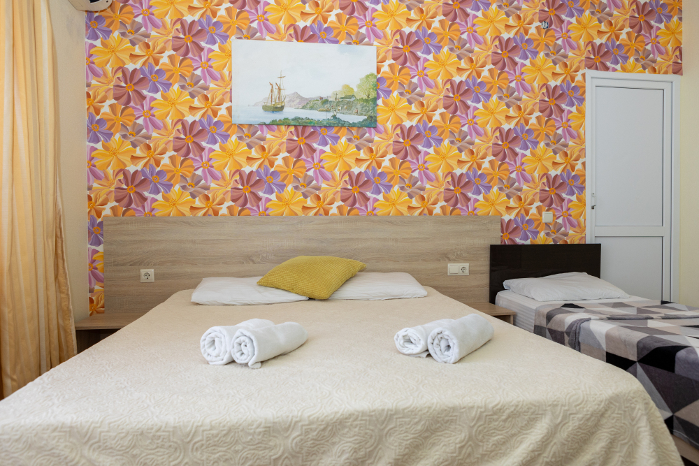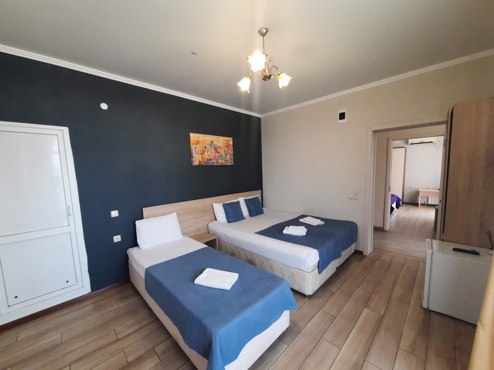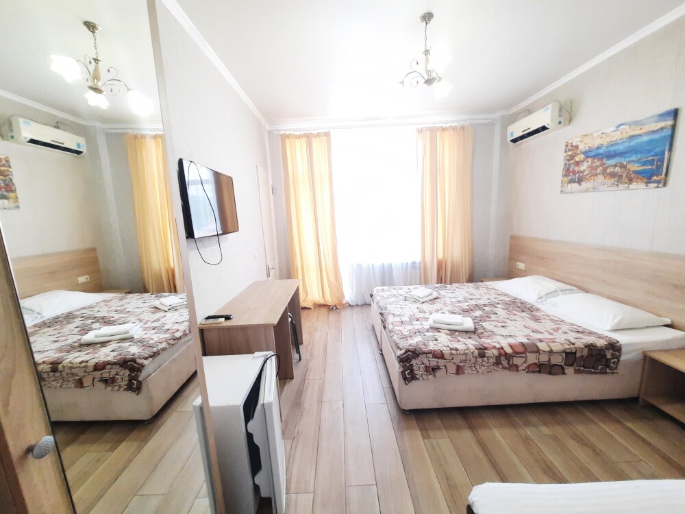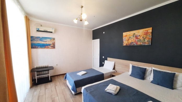 Просторный номер для 3 гостей с балконом расположены на 3-4 этажах гостевого дома. Номера в новом корпусе №2, высокие потолки, много света в комнате. В комнате двуспальная и односпальная кровати.