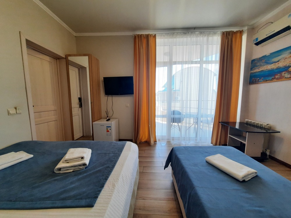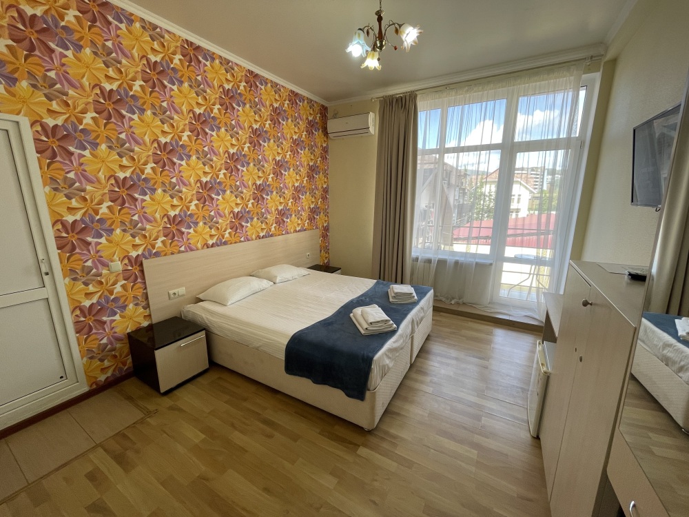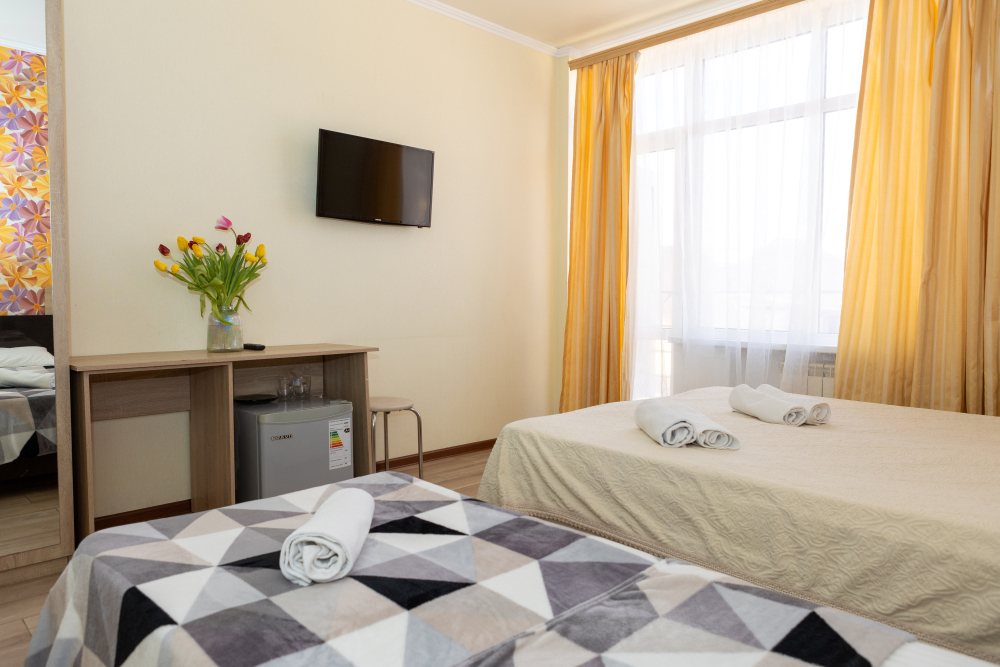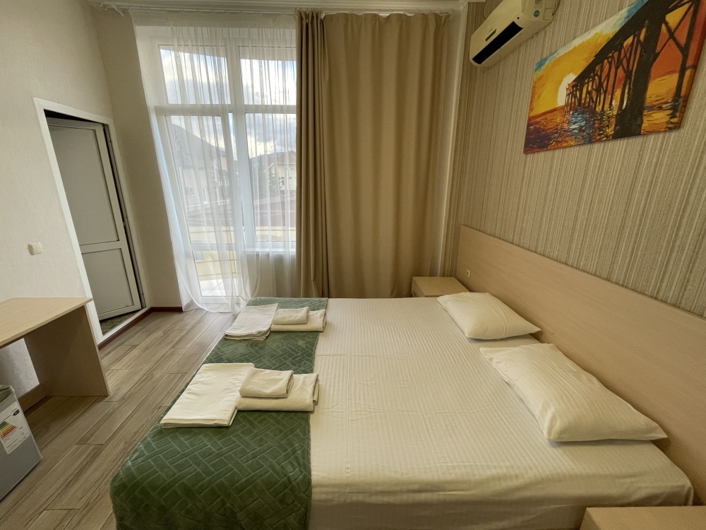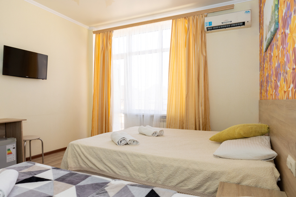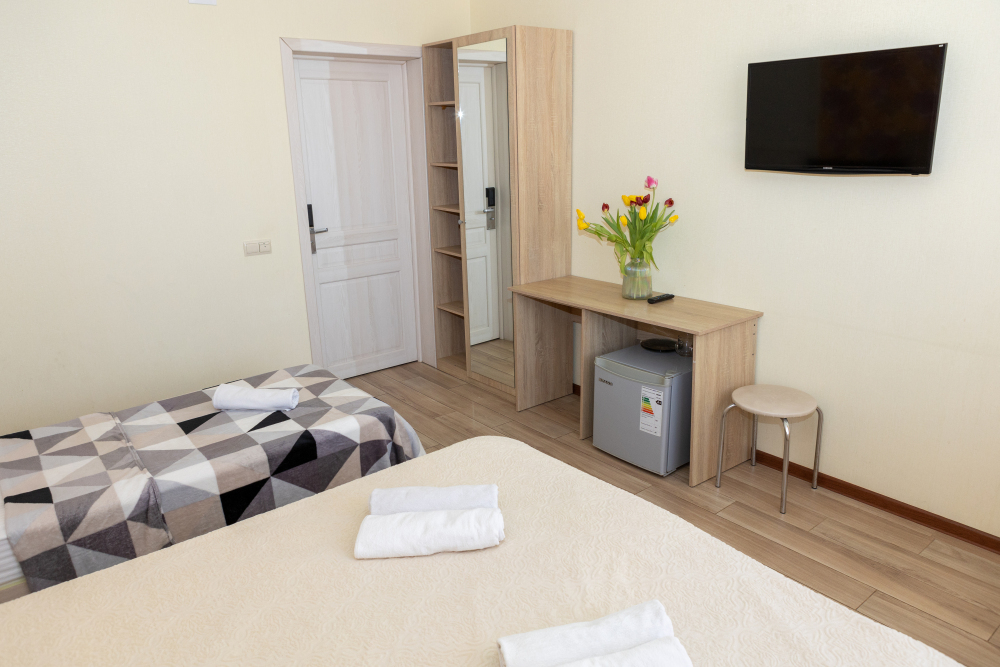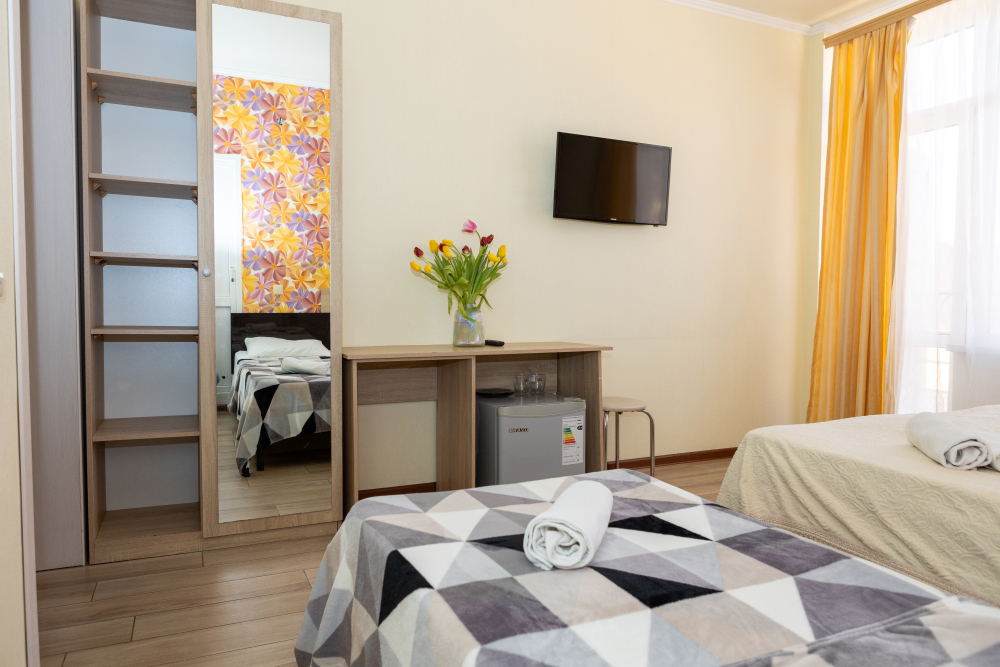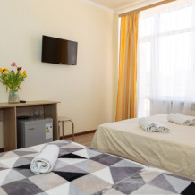 Просторный номер для 2 гостей с балконом расположены на 3−4 этажах гостевого дома. Номера в новом корпусе №2, высокие потолки, много света в комнате. В комнате двуспальная или 2 раздельные кровати, доп. место еврораскладушка.