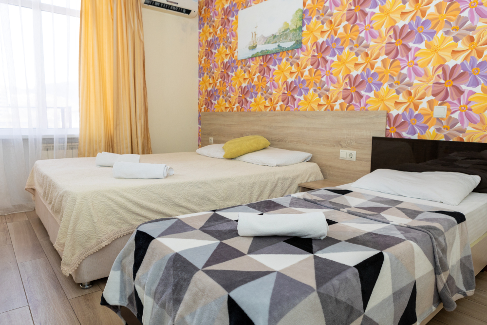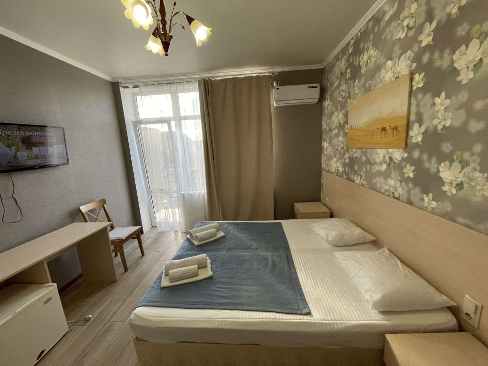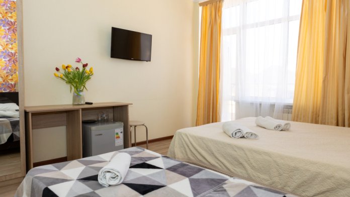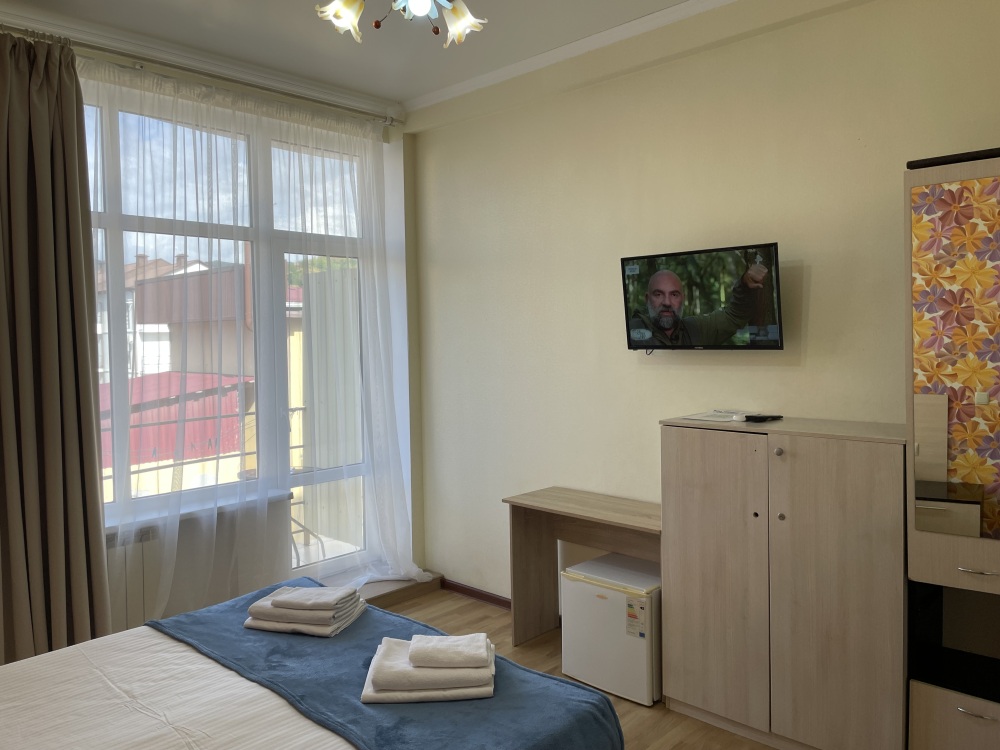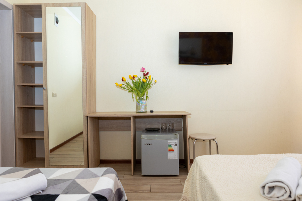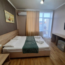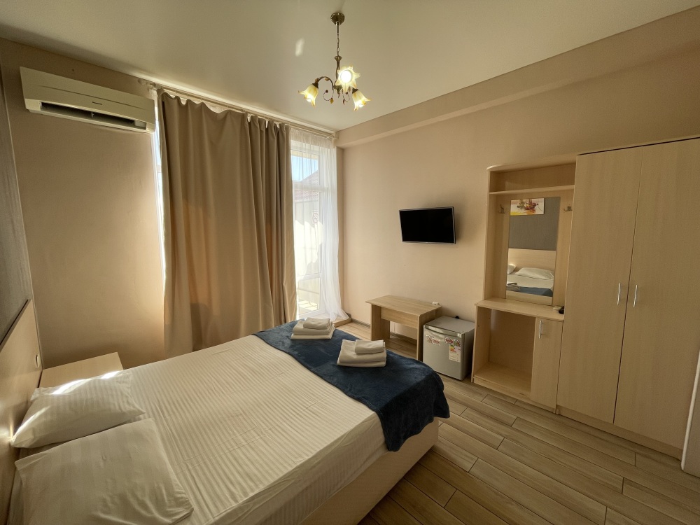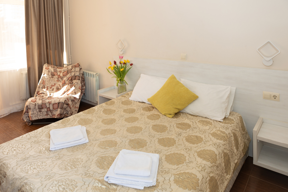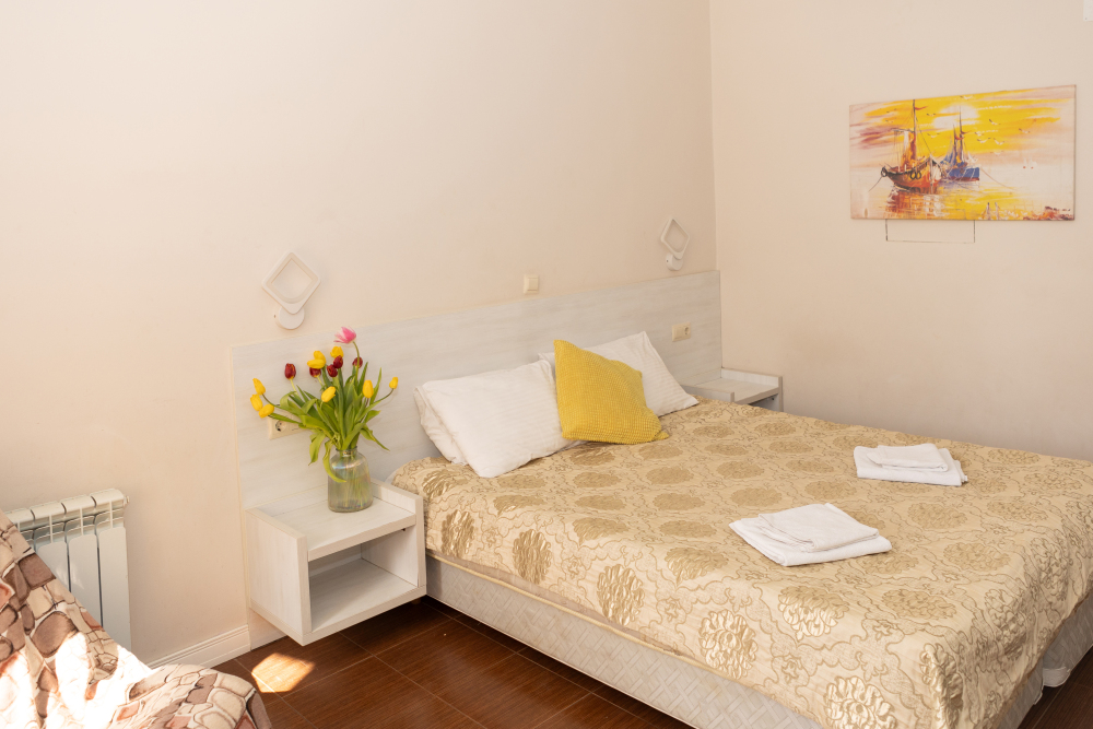 Просторный номер для 2 гостей с балконом расположены на 3−4 этажах гостевого дома. Номера в новом корпусе №2, высокие потолки, много света в комнате. В комнате двуспальная или 2 раздельные кровати, доп. место еврораскладушка.