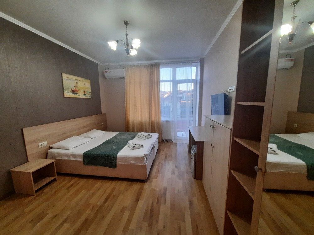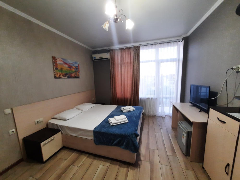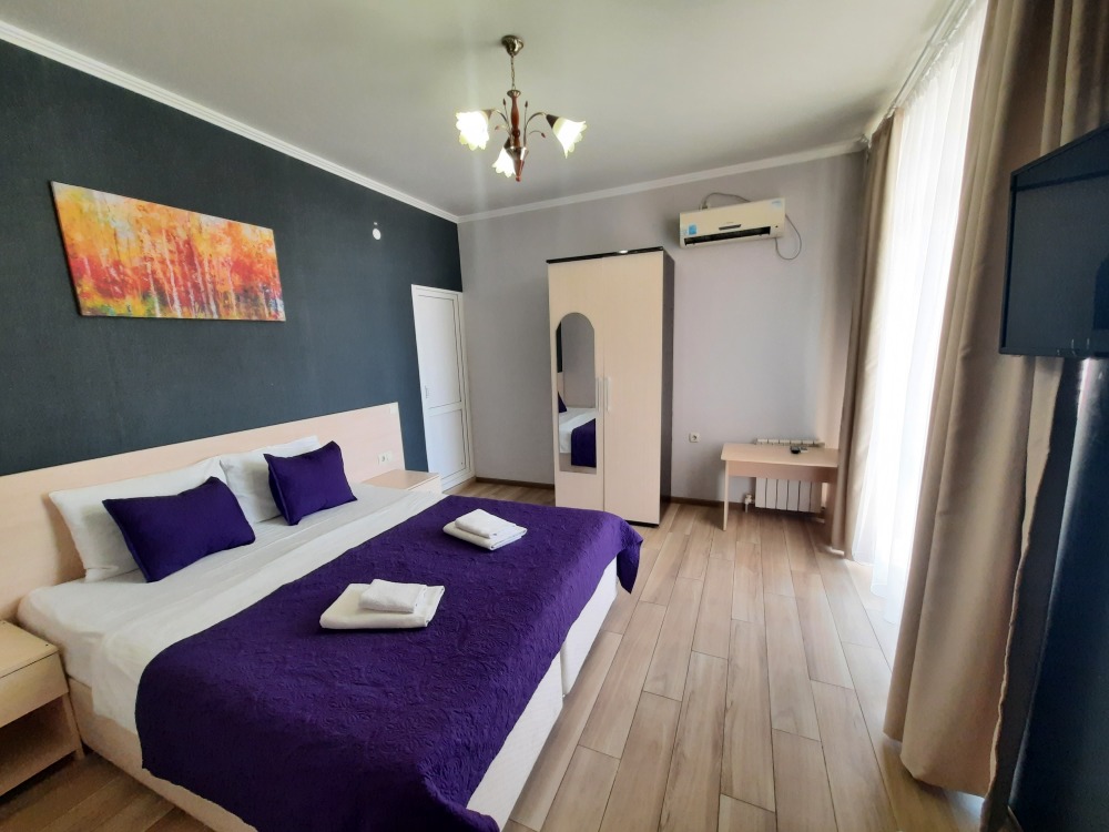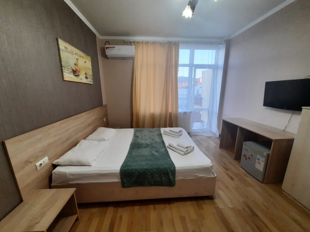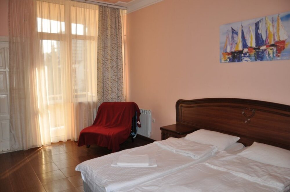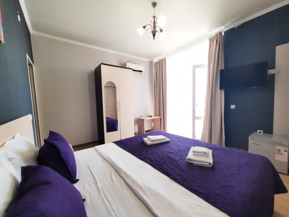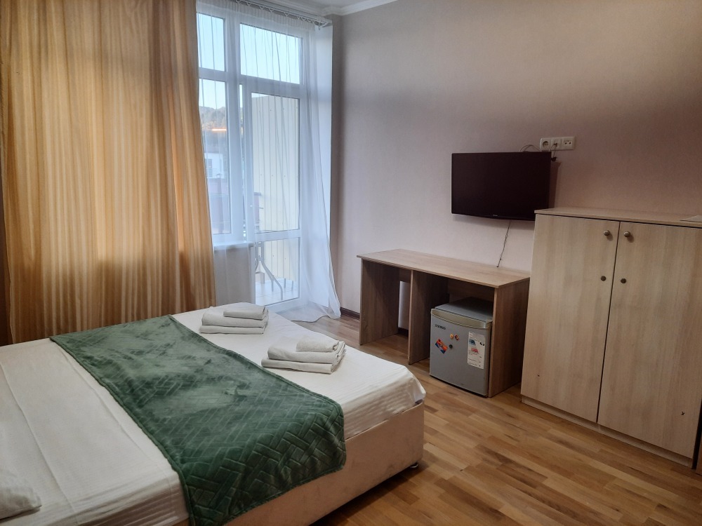 Просторный номер для 2 гостей с балконом расположены на 3−4 этажах гостевого дома. Номера в новом корпусе №2, высокие потолки, много света в комнате. В комнате двуспальная или 2 раздельные кровати, доп. место еврораскладушка.