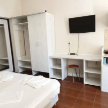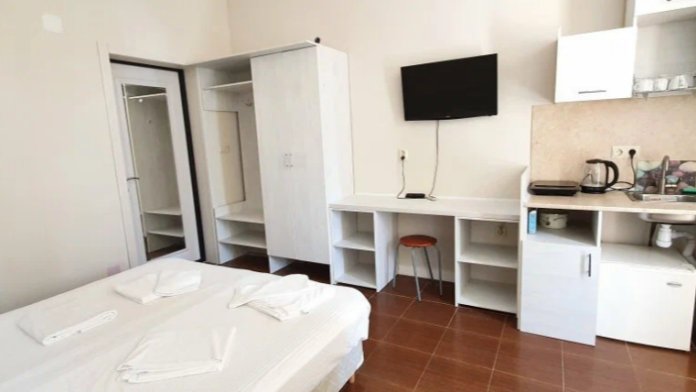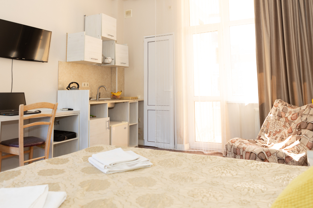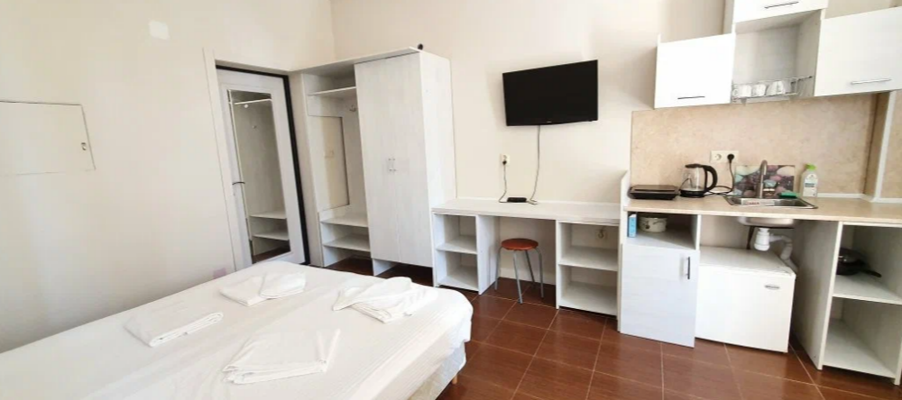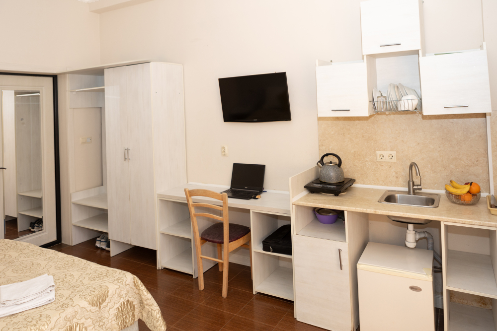 Особенностью данных номеров это наличие общей кухни на каждом этаже, полностью оборудованной и с прекрасным видом на море. Стиральная машинка бесплатно, на этаже.