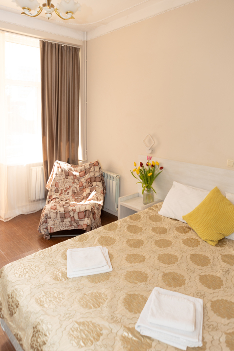 Просторный номер для 2−3 гостей с балконом расположены на 3−4 этажах гостевого дома. Номера в новом корпусе №2, высокие потолки, много света в комнате. В комнате двуспальная или 2 раздельные кровати, односпальная кровать или кресло для 3-го гостя.