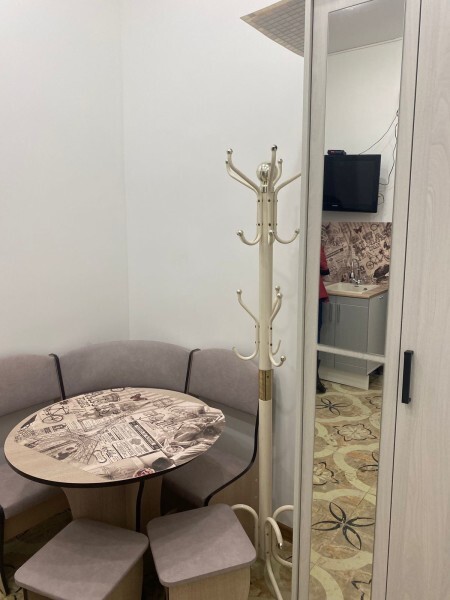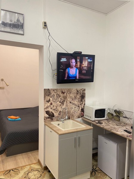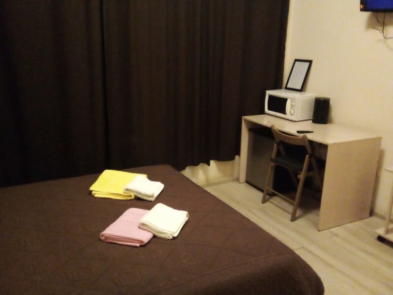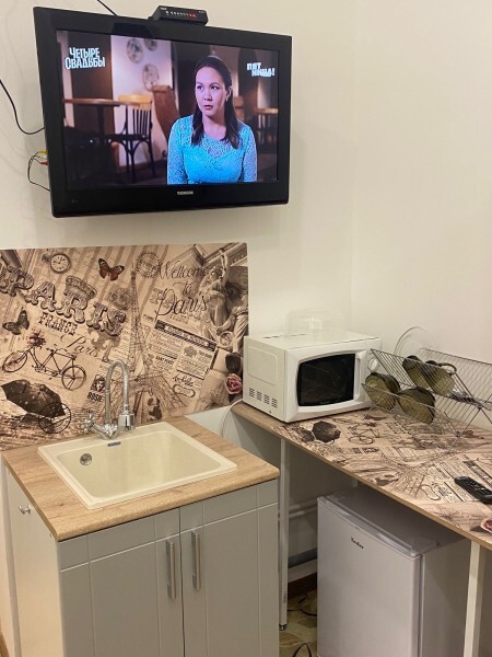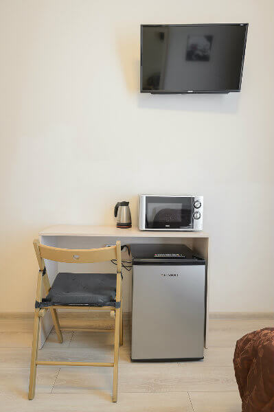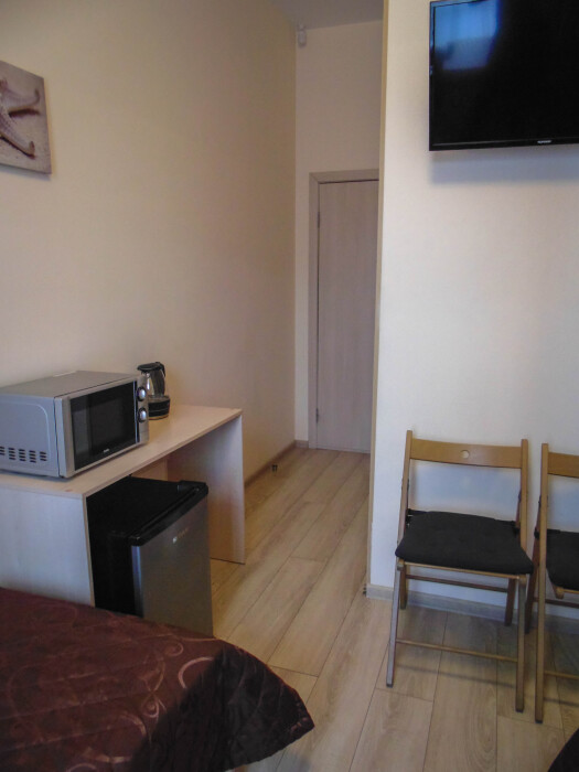 Номер из комнаты с кроватью, комнаты с кухонной зоной и шкафом, комната с душем и туалетом. Два телевизора, холодильник, чайник, микроволновка в номере. Отдельный вход, двойная дверь для шумоизоляции. Чай-кофе-сахар предоставляются в номере бесплатно