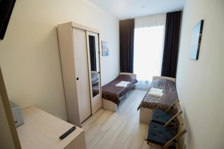 Две односпальные кровати, шкаф, стол, стул, телевизор, чайник, микроволновка, холодильник, своя душевая и туалет.