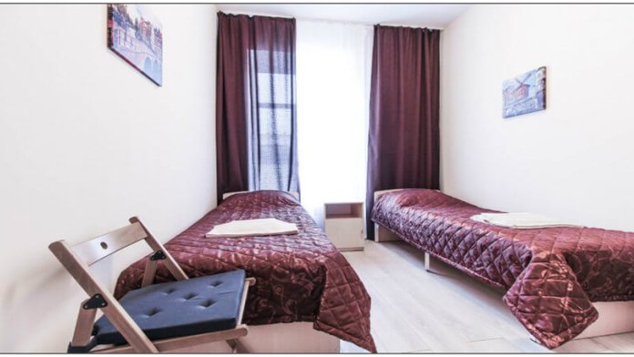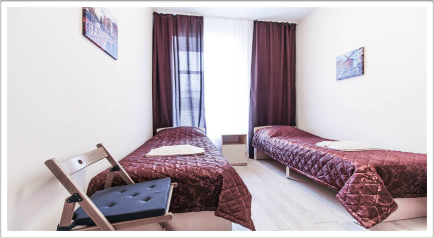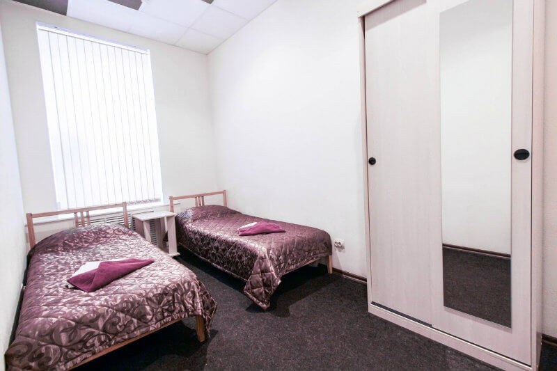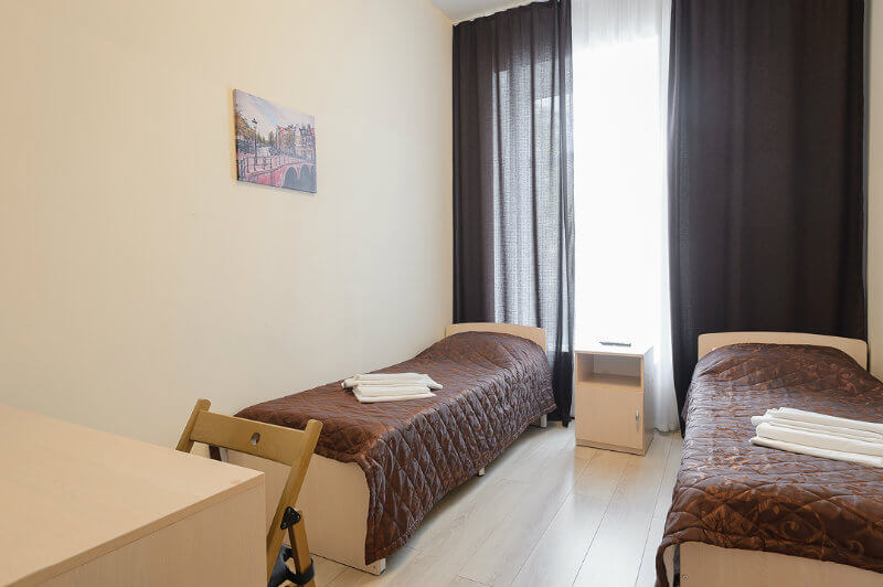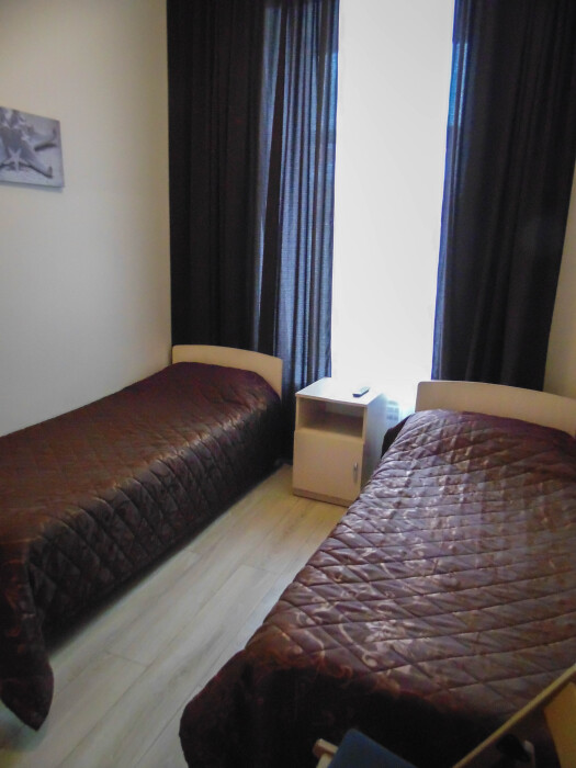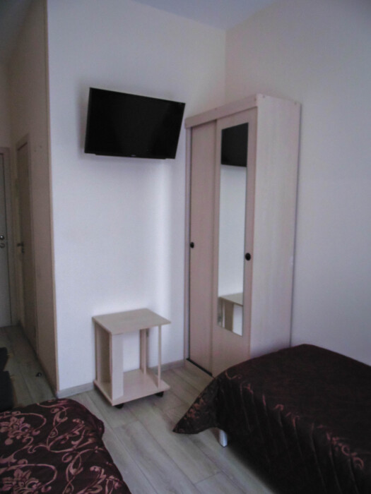 Две односпальные кровати, шкаф, телевизор, своя душевая и туалет.