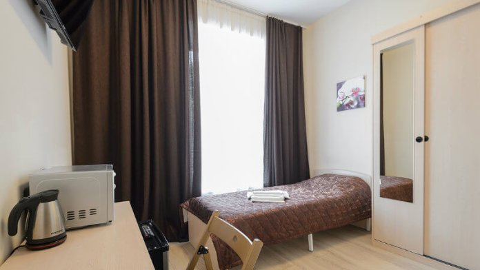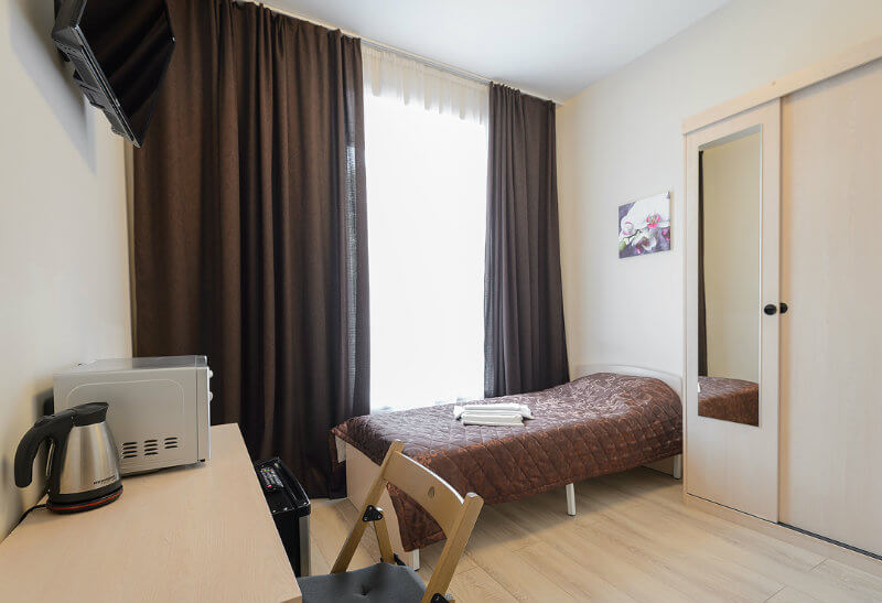Полутороспальная кровать 120 см, шкаф, стол, стул, телевизор, чайник, микроволновка, холодильник, своя душевая и туалет.