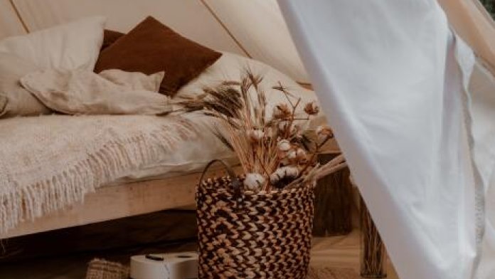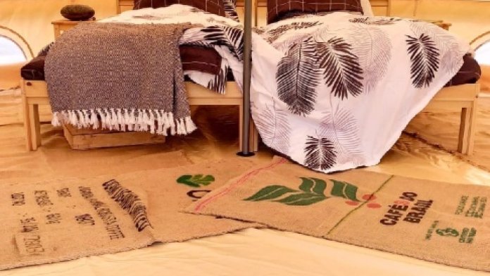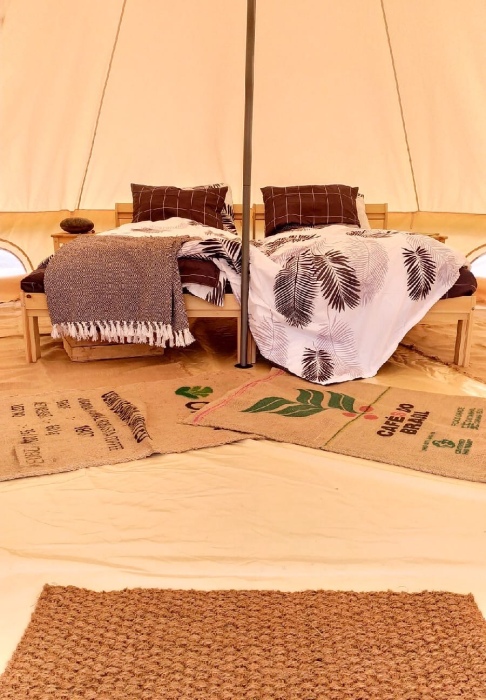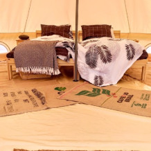 Просторный шатер оборудован для двоих с одной двуспальной кроватью и одноместная кровать. Ортопедические матрасы, простыни с подогревом. При необходимости можно добавить раскладушку. Максимальная вместимость 4 человека.