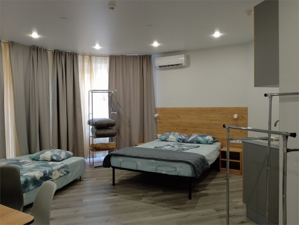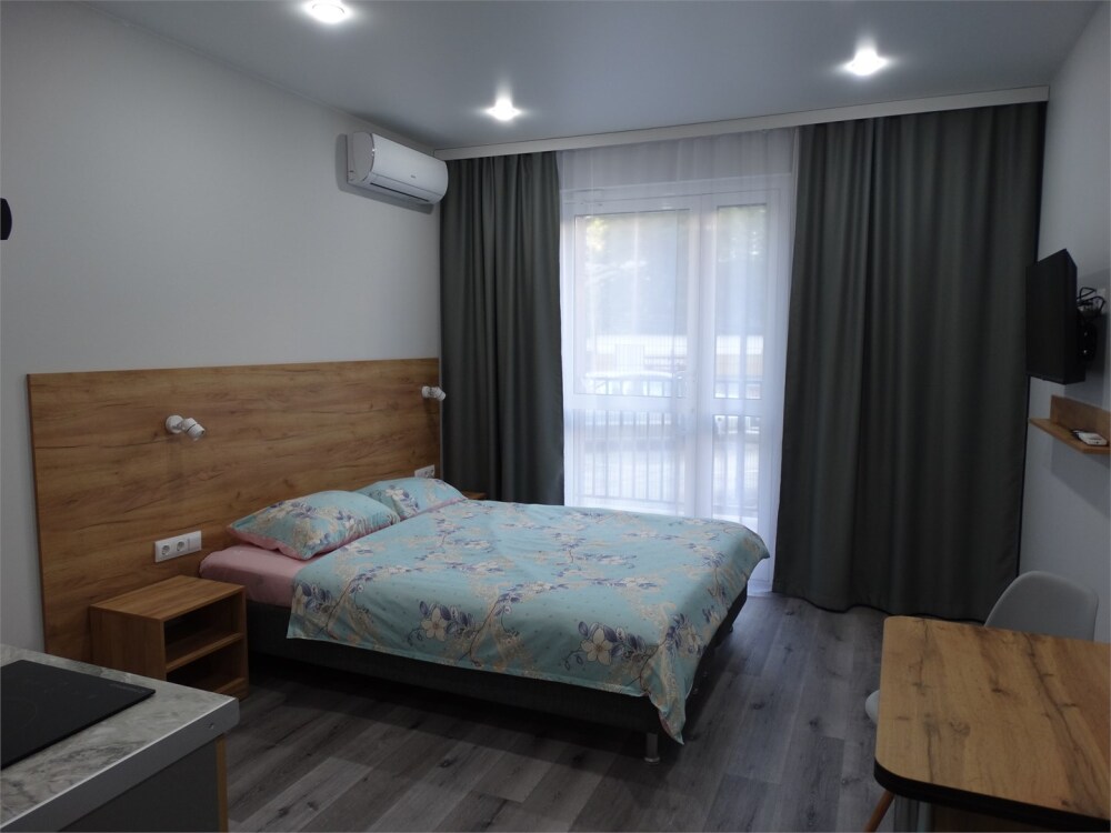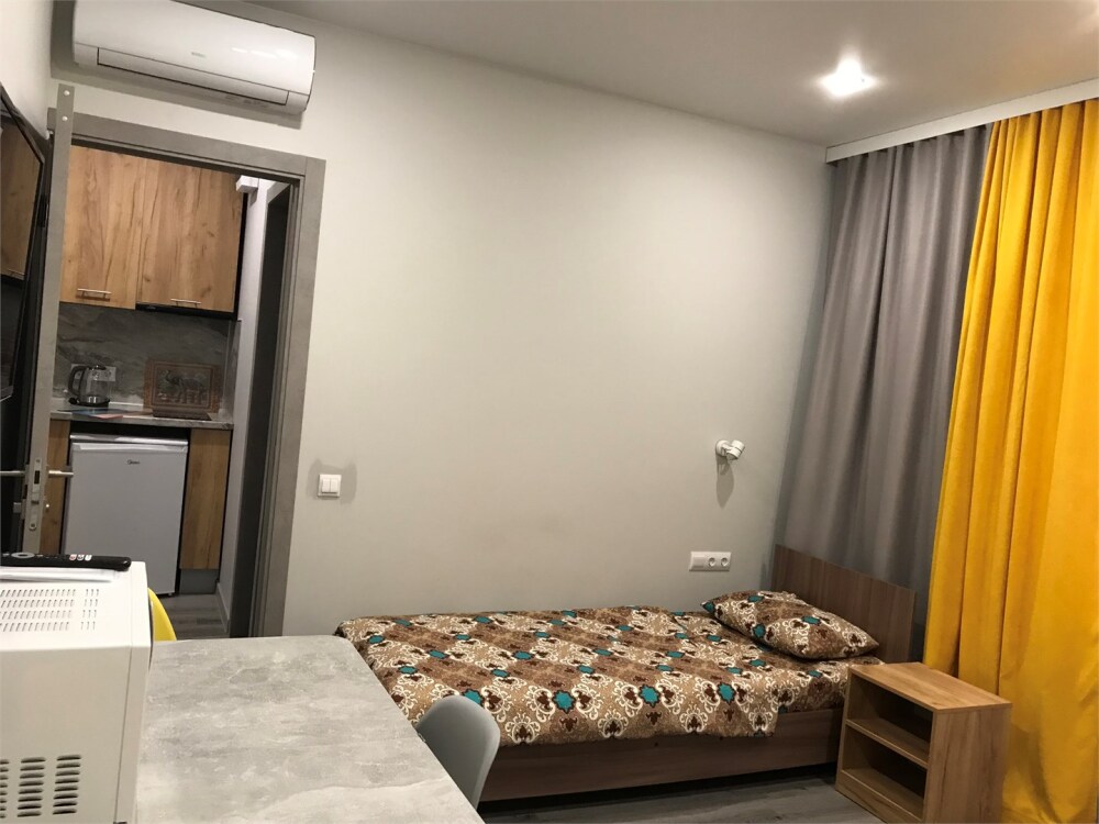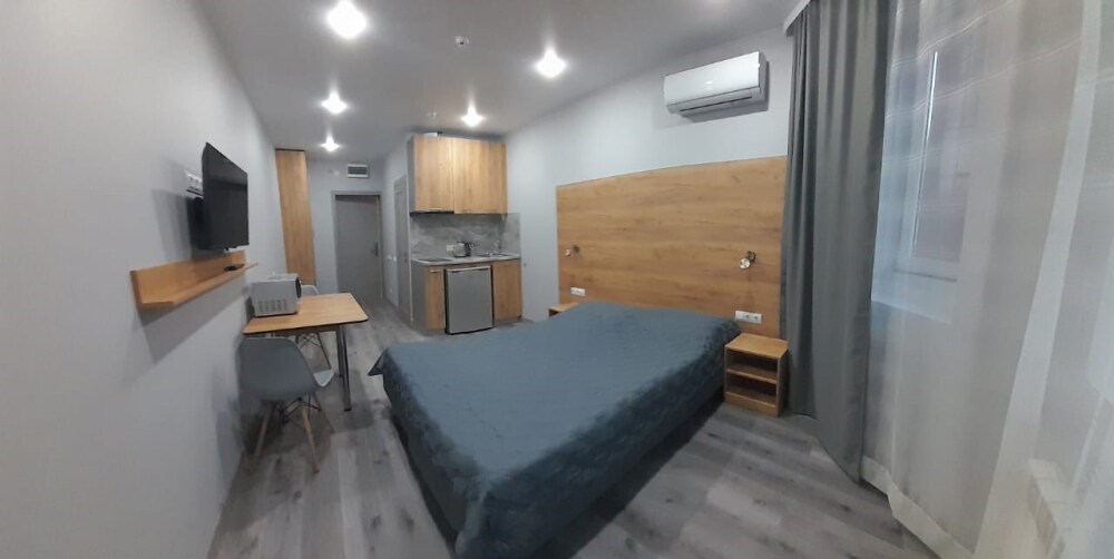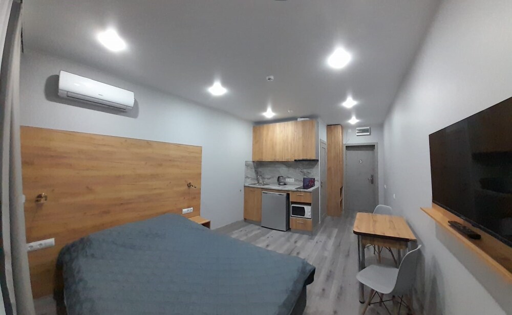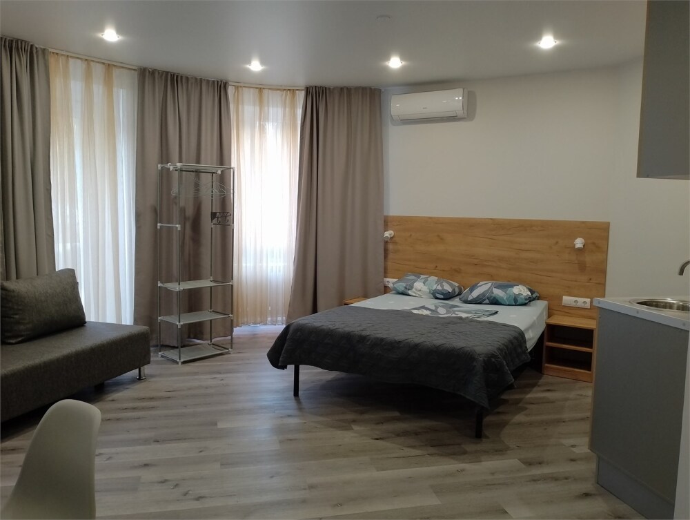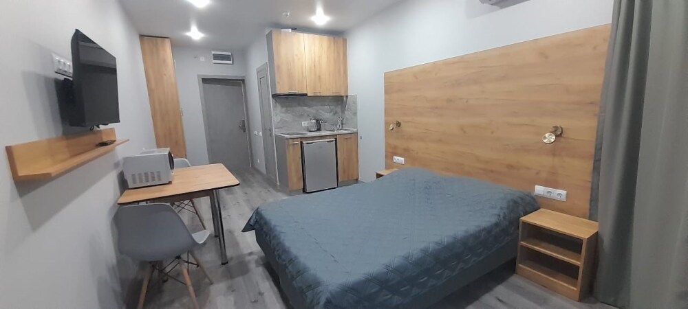 Уютные, в современном стиле комфортабельные апартаменты. В апартаментах предусмотрены удобные матрасы, гипоаллергенные подушки, сатиновое постельное белье премиум класса для комфортного отдыха. В апартаментах кондиционер, холодильник, встроенная кухня, необходимая бытовая кухонная техника, набор посуды.