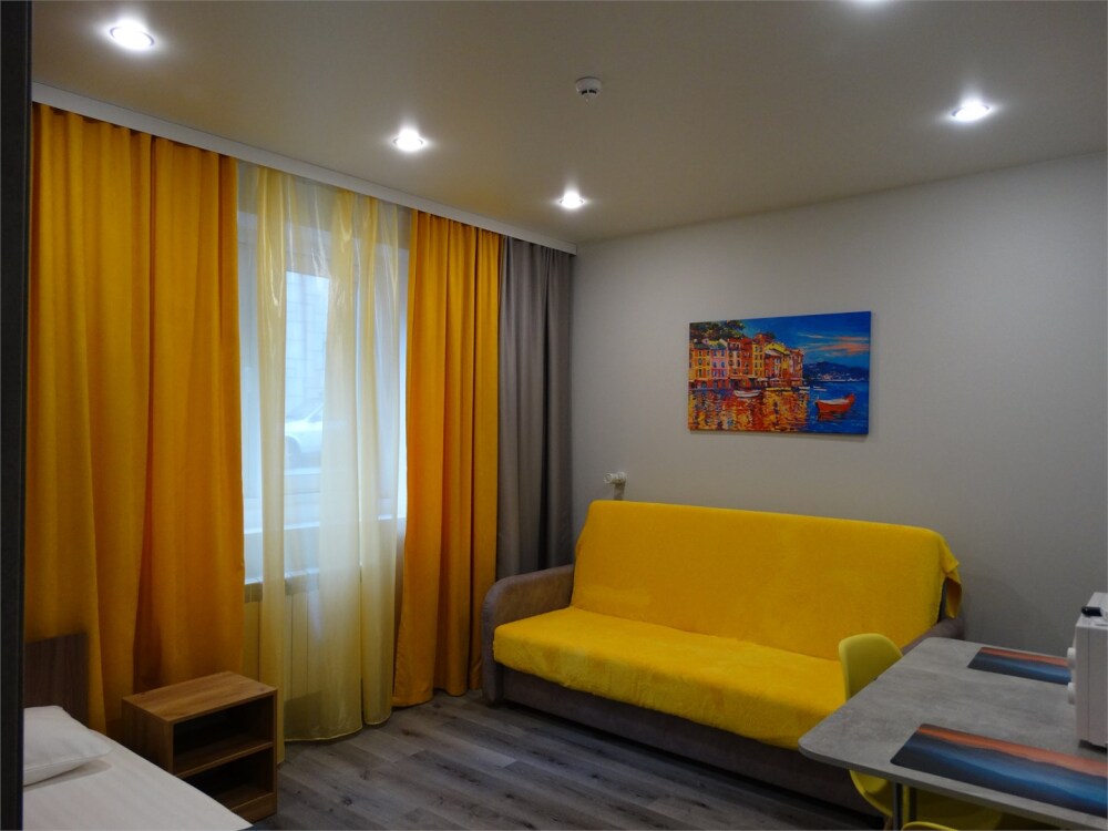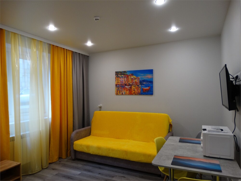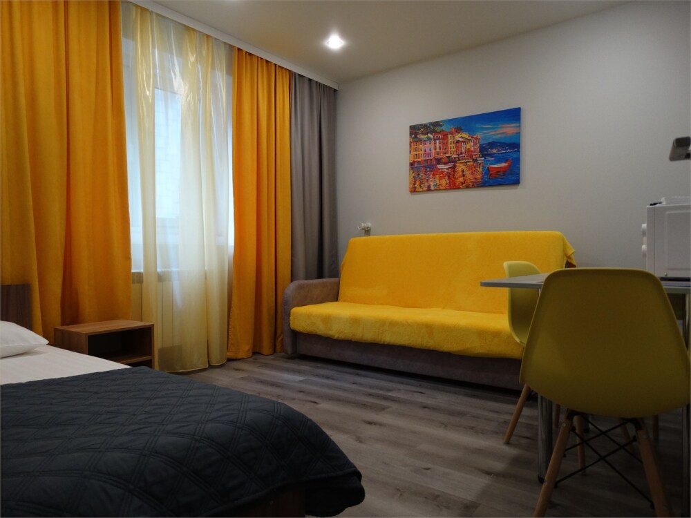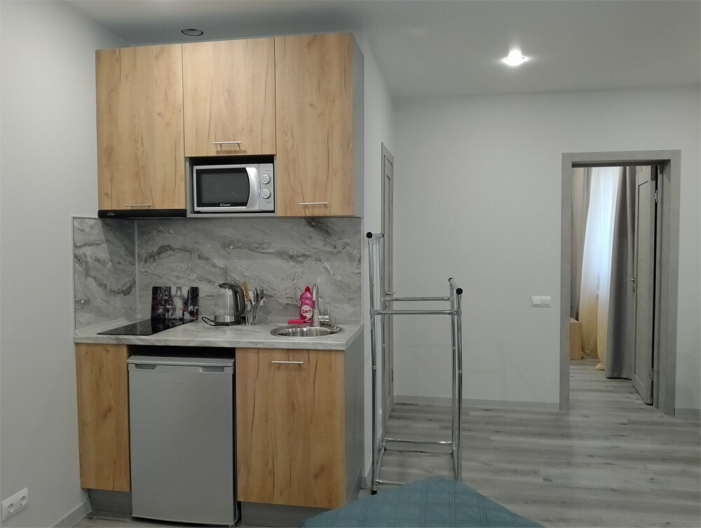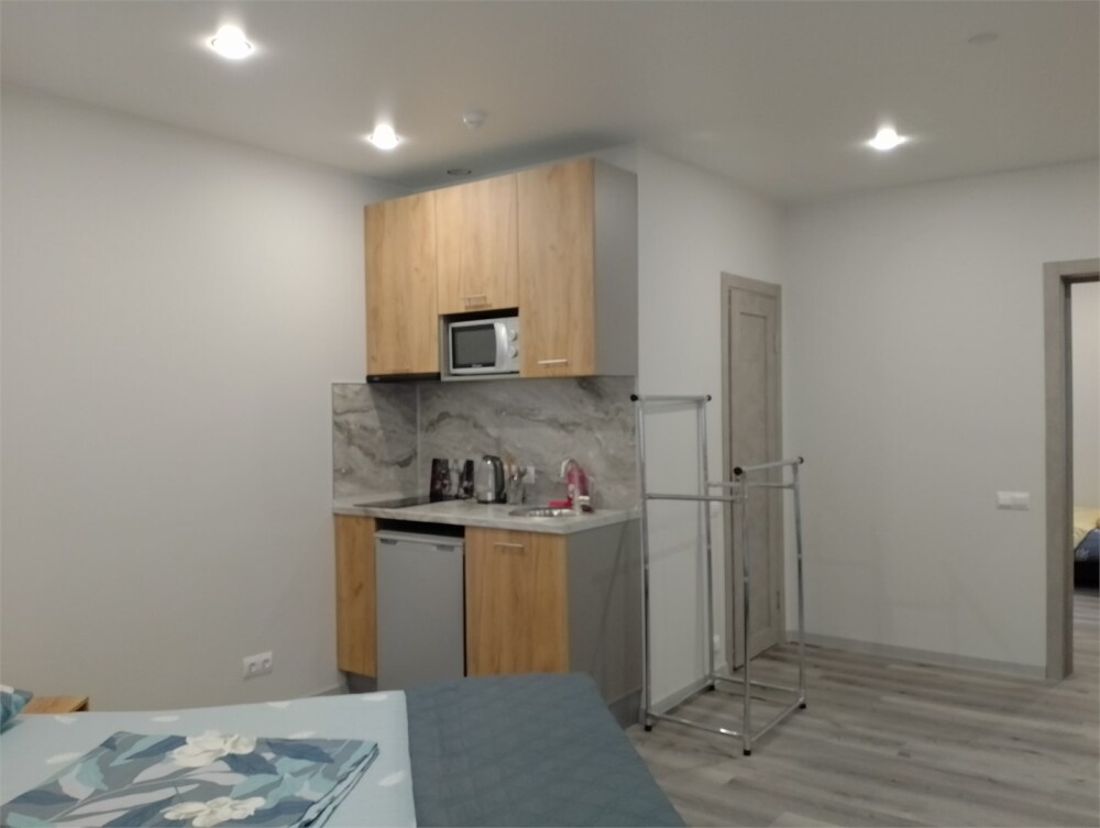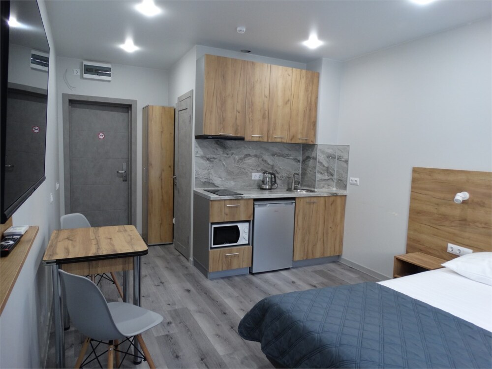 Апартаменты в современном стиле, с балконом. В апартаментах предусмотрены удобные матрасы, гипоаллергенные подушки, постельное белье премиум класса для комфортного отдыха. В апартаментах кондиционер, фен, холодильник, встроенная кухня, электрический чайник, обеденный стол, микроволновая печь.
