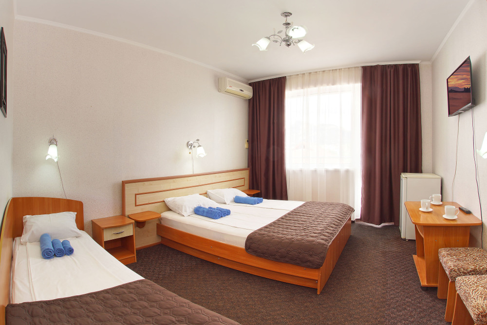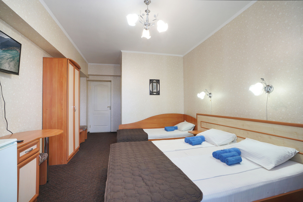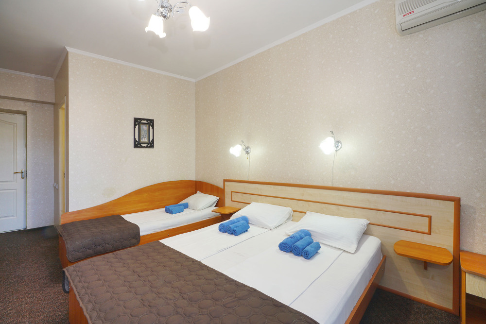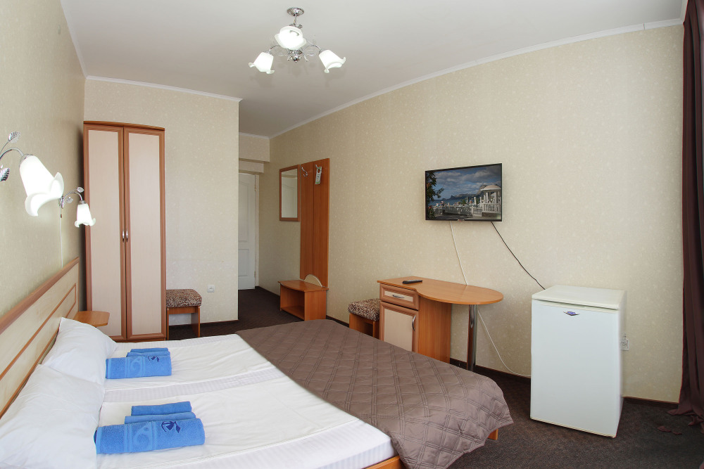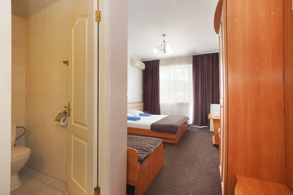 Однокомнатный номер общей площадью 20 кв.м., оформленный в традиционном стиле. В номере есть все необходимое для комфортного проживания: двуспальная кровать и односпальная (или три односпальные) с удобным матрасом, балкон, шкаф для хранения одежды, прикроватные тумбы, холодильник, ЖК-телевизор, сплит-система, собственная ванная комната с душевой кабиной и туалетными принадлежностями, набор для приготовления чая/кофе. Вид из номера на город и горы. Номера расположены на 3, 4 и 5 этажах.