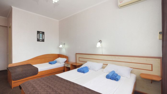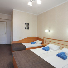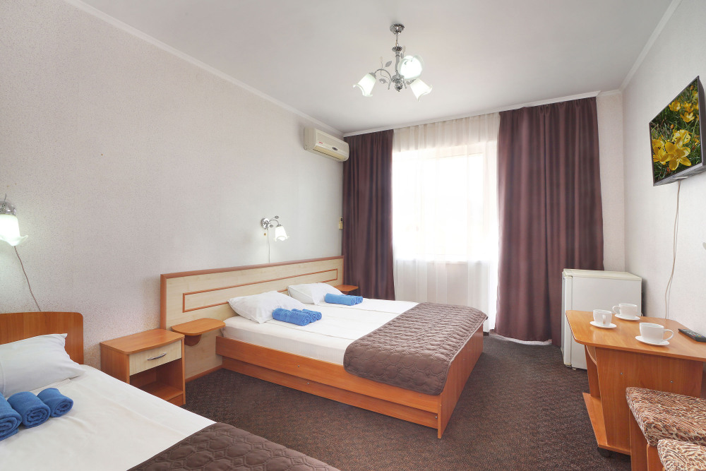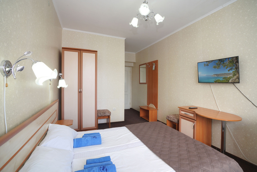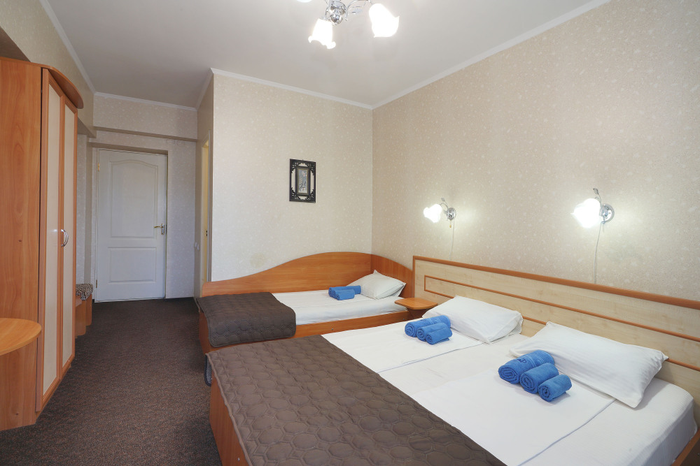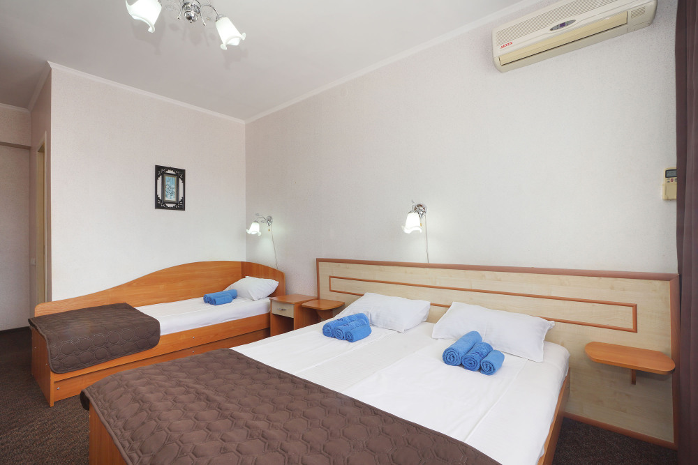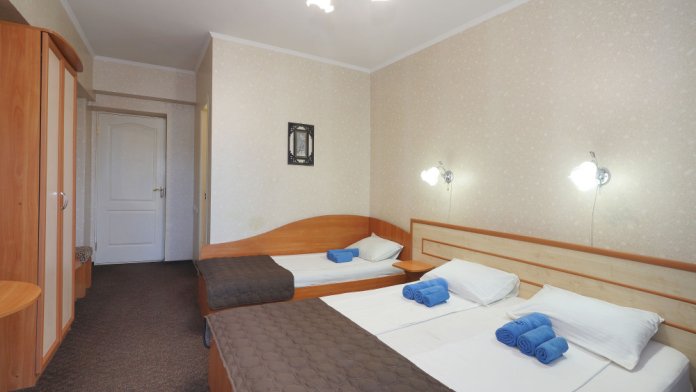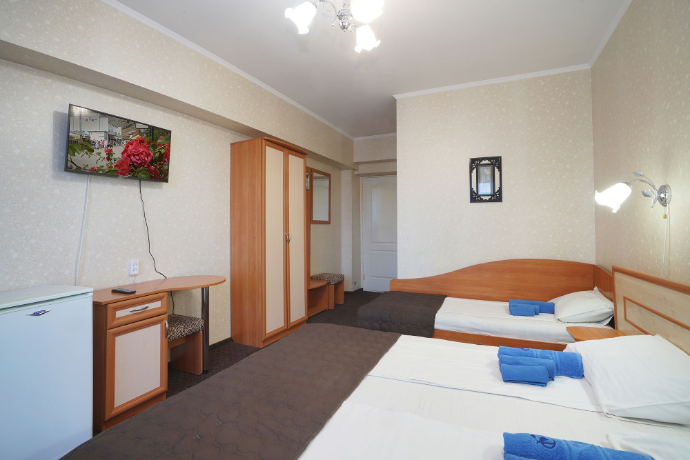 Однокомнатный номер общей площадью 20 кв.м., оформленный в традиционном стиле. В номере есть все необходимое для комфортного проживания: двуспальная кровать и односпальная (или три односпальные) с удобным матрасом, балкон, шкаф для хранения одежды, прикроватные тумбы, холодильник, ЖК-телевизор, сплит-система, собственная ванная комната с душевой кабиной и туалетными принадлежностями, набор для приготовления чая/кофе. Вид из номера на город и горы. Номера расположены на 3, 4 и 5 этажах.