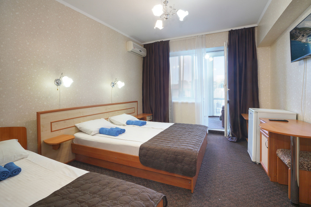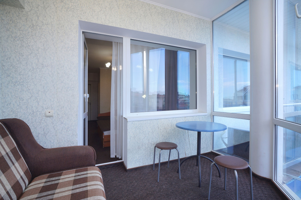 Двухкомнатный номер общей площадью 25 кв.м., оформленный в традиционном стиле. В основной комнате двуспальная кровать и односпальная кровать. На лоджии с панорамными окнами расположен раскладной двуспальный диван. В номере есть все необходимое для комфортного проживания: тумба для размещения багажа, шкаф для хранения одежды, прикроватные тумбы, холодильник, ЖК-телевизор, письменный стол, сплит-система, собственная ванная комната с душевой кабиной и туалетными принадлежностями, набор для приготовления чая/кофе. Вид из номера на город и горы. Номера расположены на 3, 4 и 5 этажах