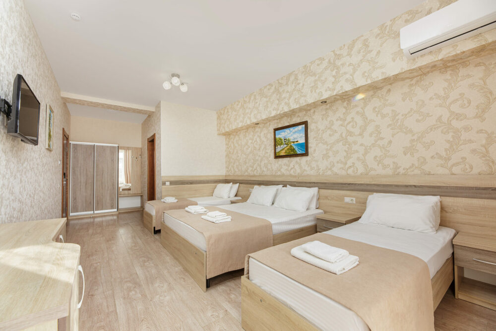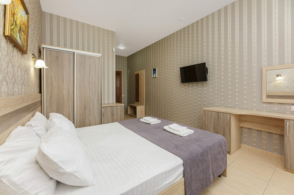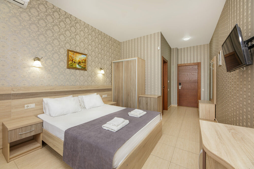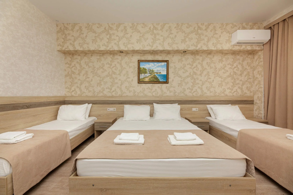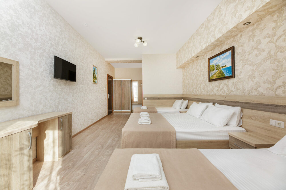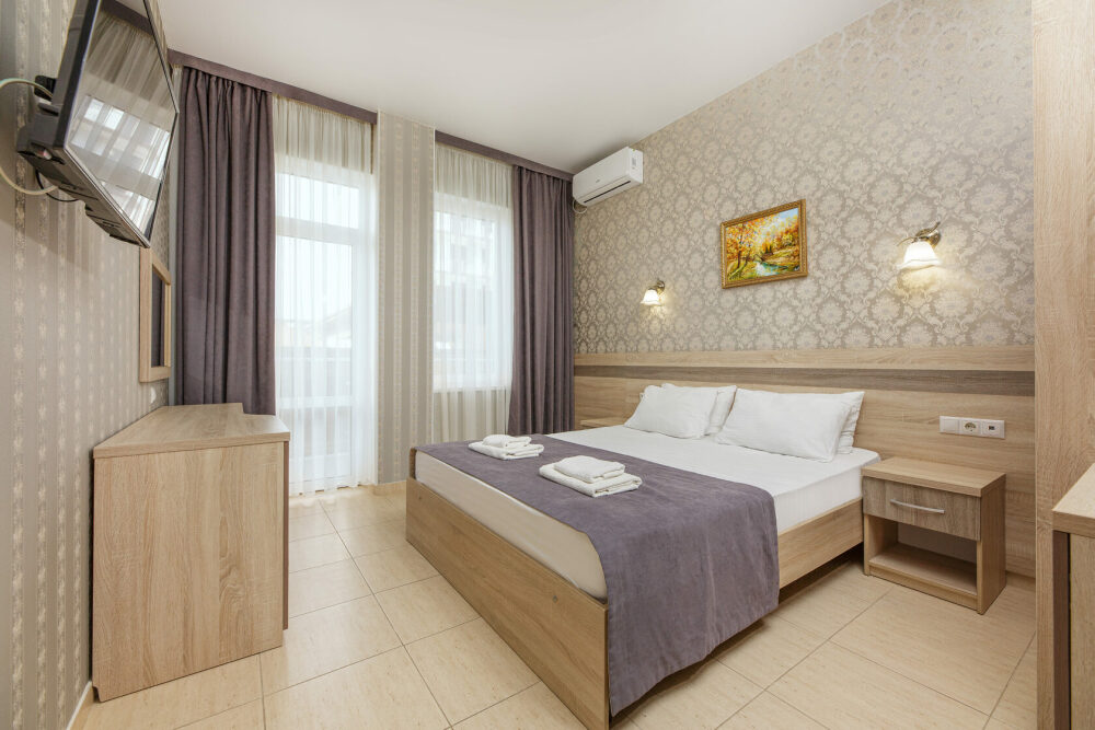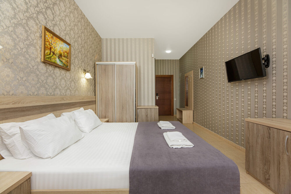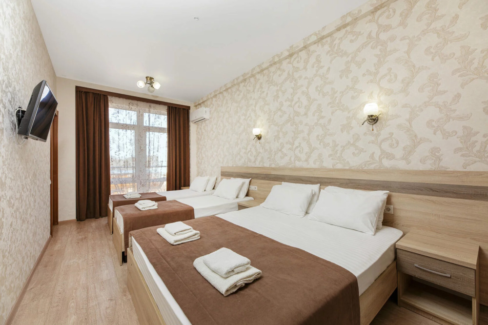 Кроме удобного расположения, мы предоставляем отдыхающим и комфортабельное проживание. В отеле есть все для этого необходимое. Бесплатный Wi-Fi и удобная индивидуальная парковка на территории отеля. Собственный бассейн с пресной водой, с подогревом. Так же в нем предусмотрено специальное отделение для детей. Рядом с бассейном открытая терраса для отдыха и загара. Есть детская площадка и анимация. Столовые, кафе и рестораны в шаговой доступности.
