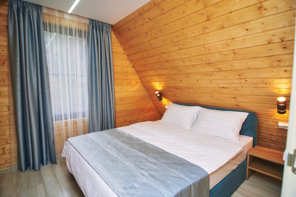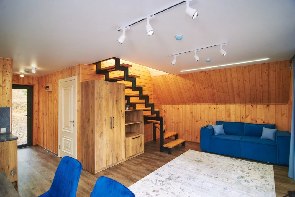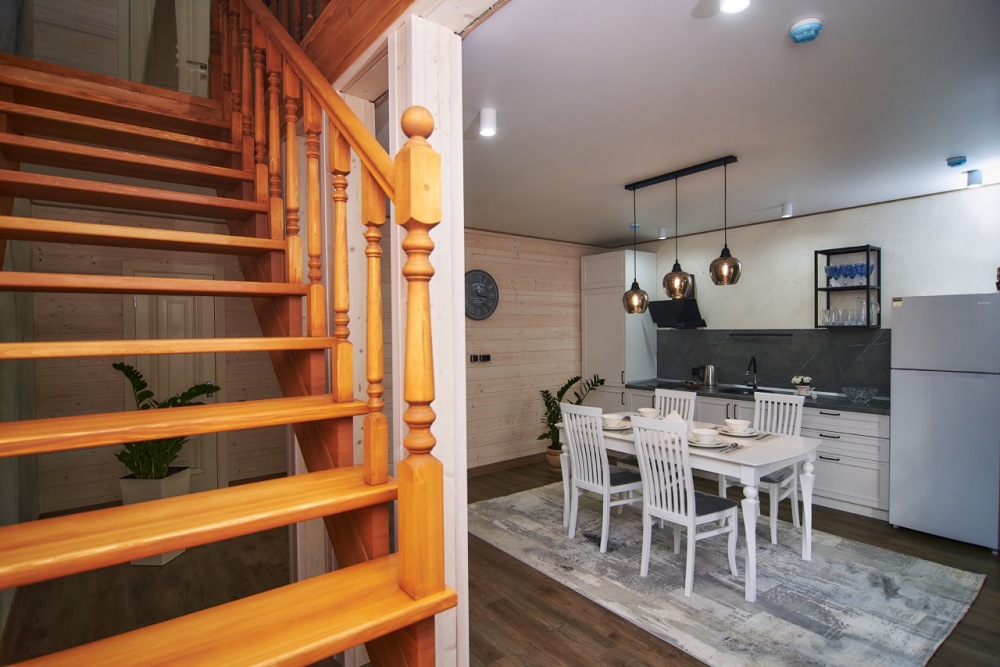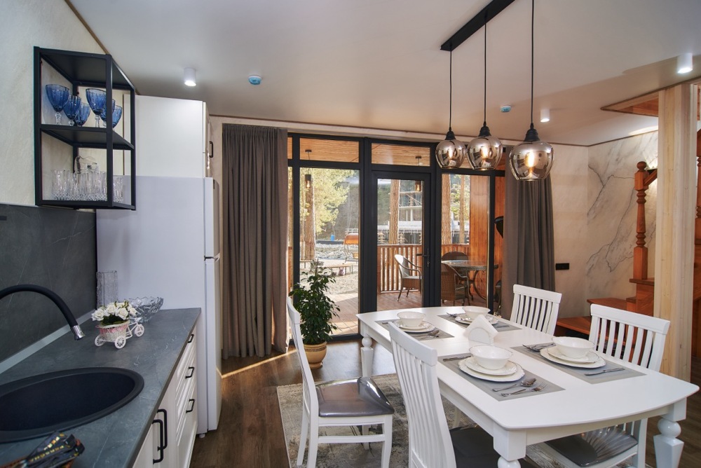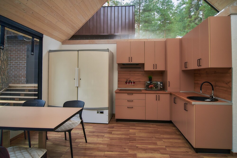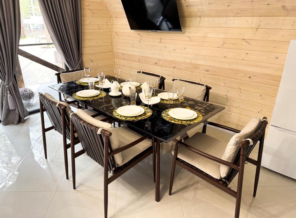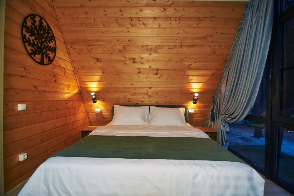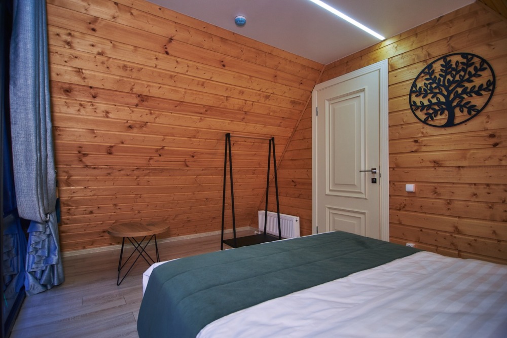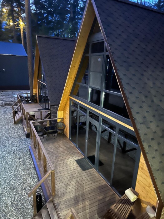 Наши домики типа «A-frame» и «Бaрнxаус» - настоящие шедевры из натурального дерева. Они полностью шумоизолированы и оснащены отоплением с теплым полом. Внутри Вы найдете все необходимое для комфортного отдыха: полностью оборудованную кухню с бытовой техникой и посудой для самостоятельного приготовления пищи.