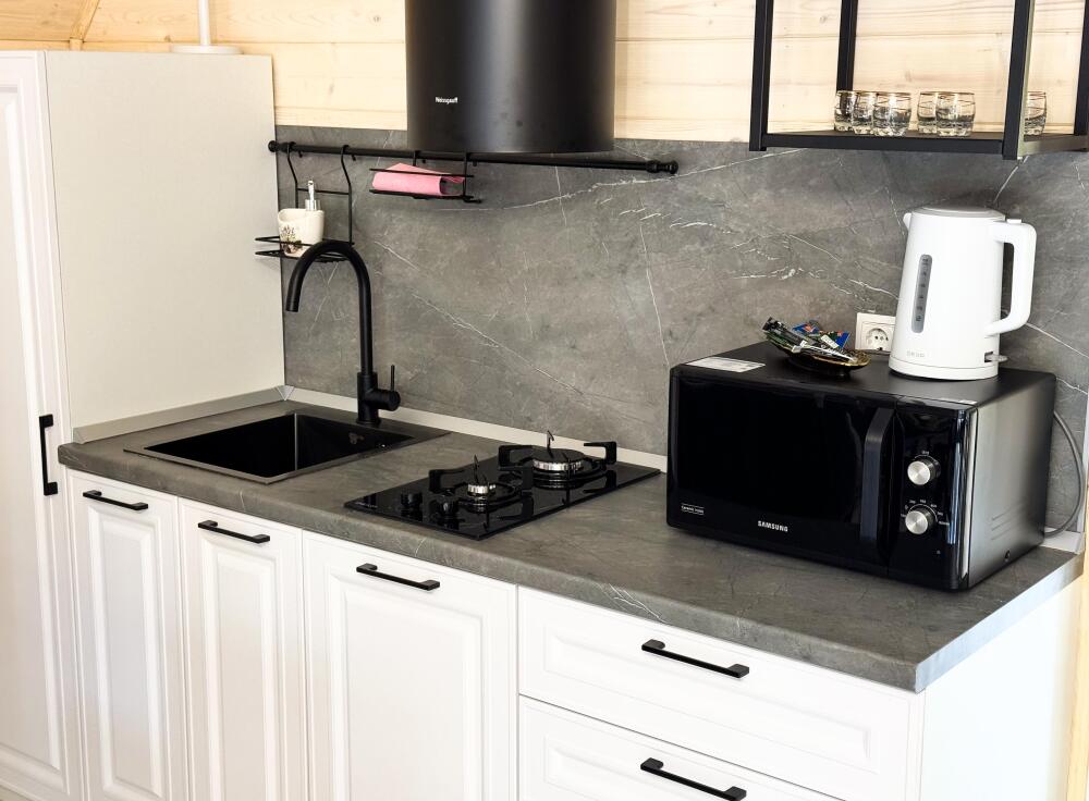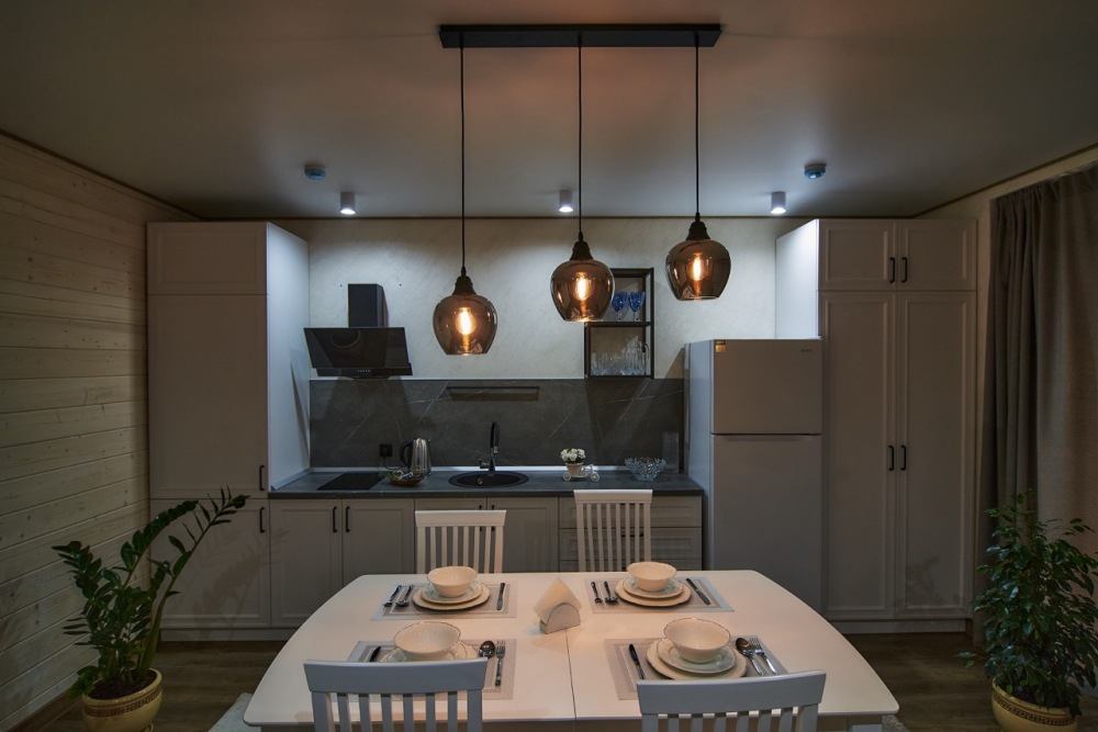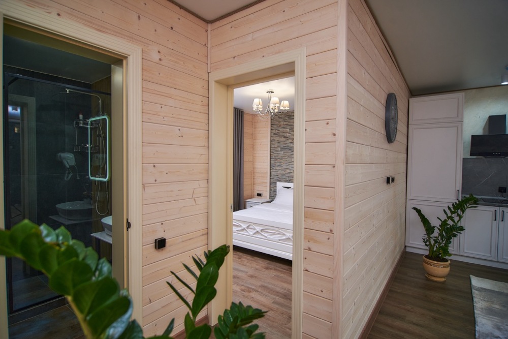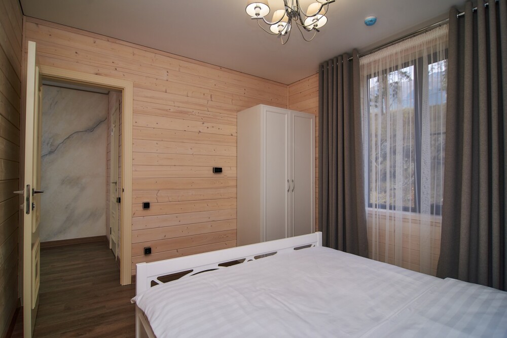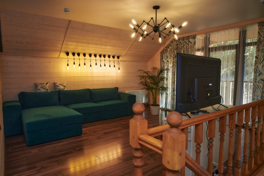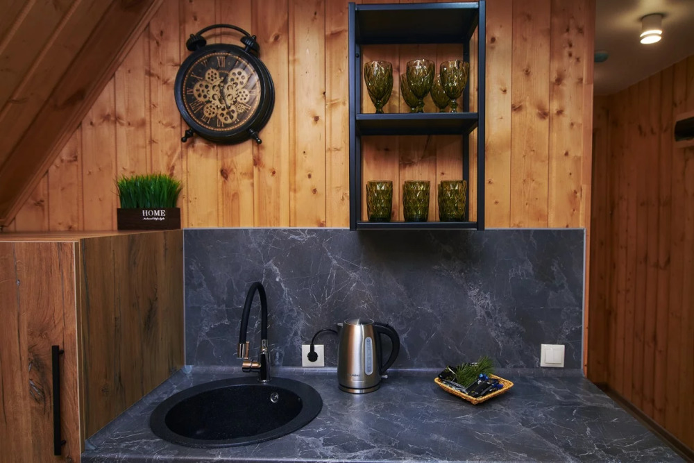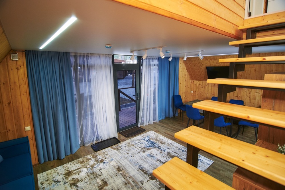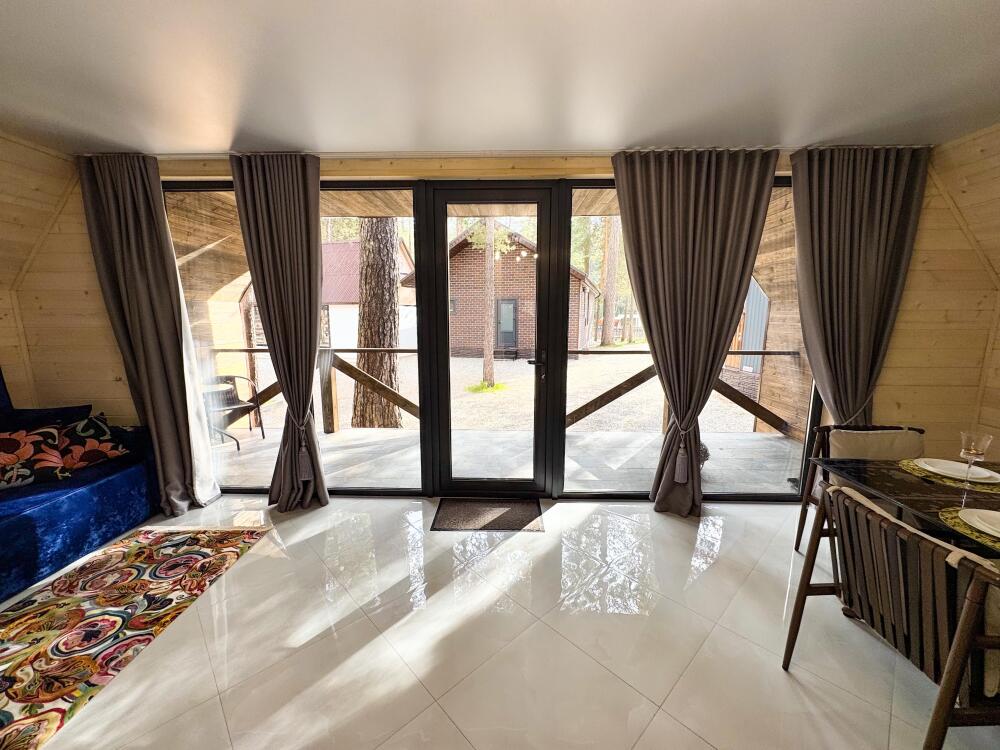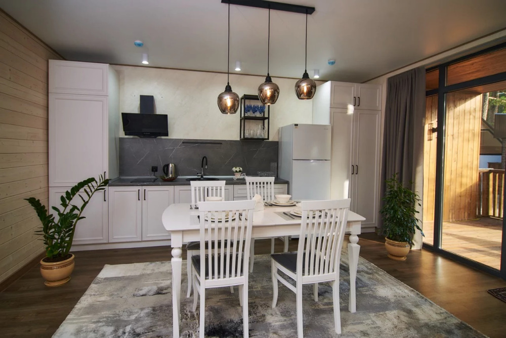 Наши домики типа «A-frame» и «Бaрнxаус» - настоящие шедевры из натурального дерева. Они полностью шумоизолированы и оснащены отоплением с теплым полом. Внутри Вы найдете все необходимое для комфортного отдыха: полностью оборудованную кухню с бытовой техникой и посудой для самостоятельного приготовления пищи.