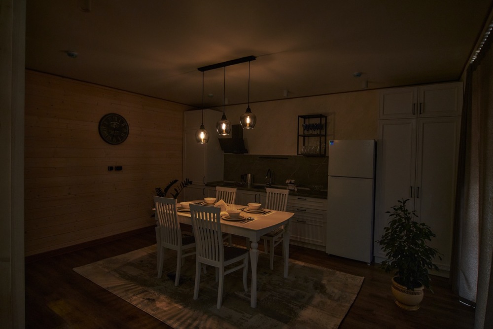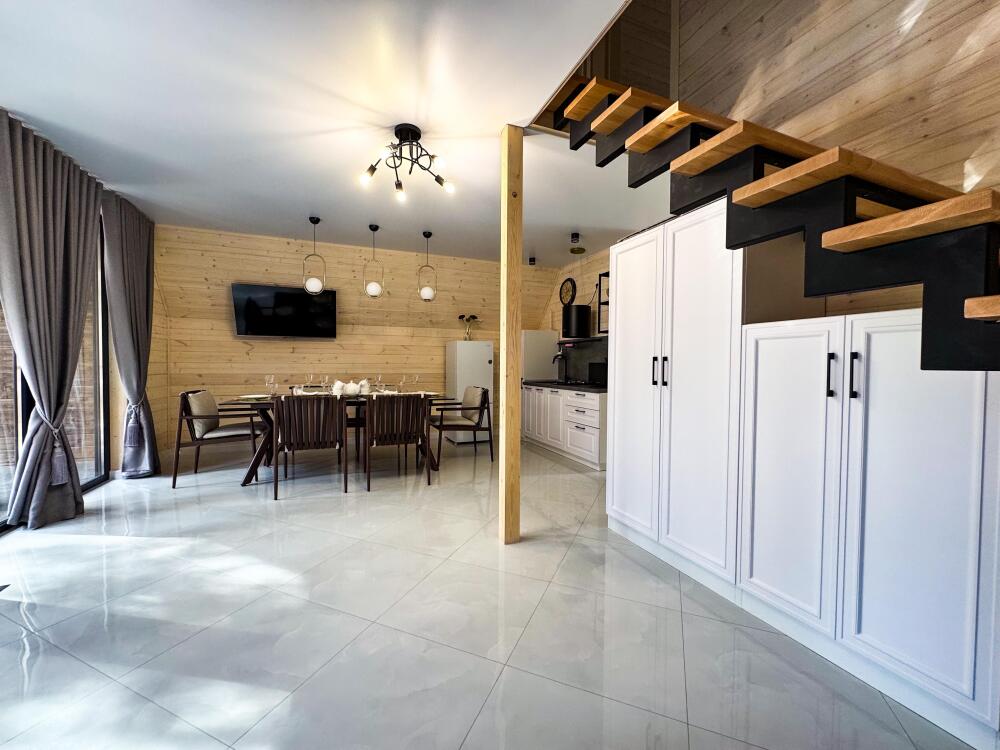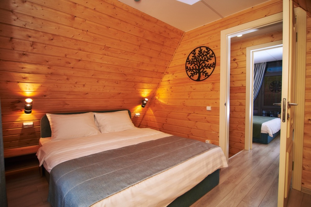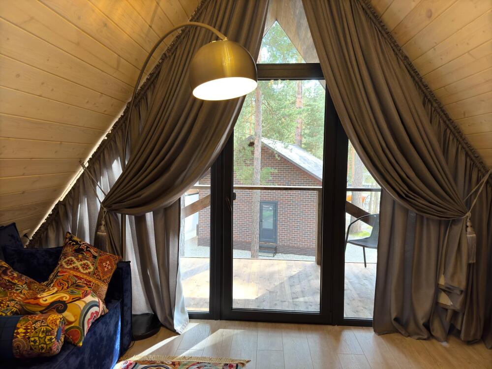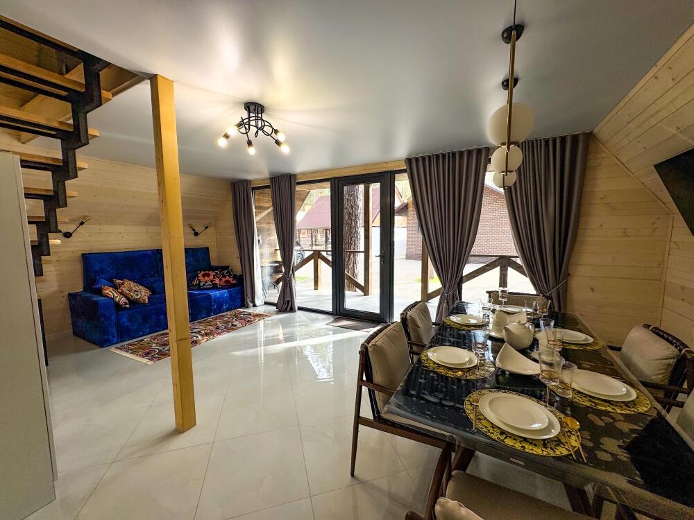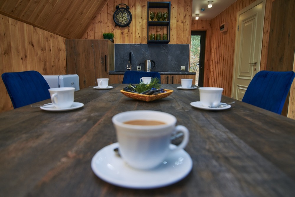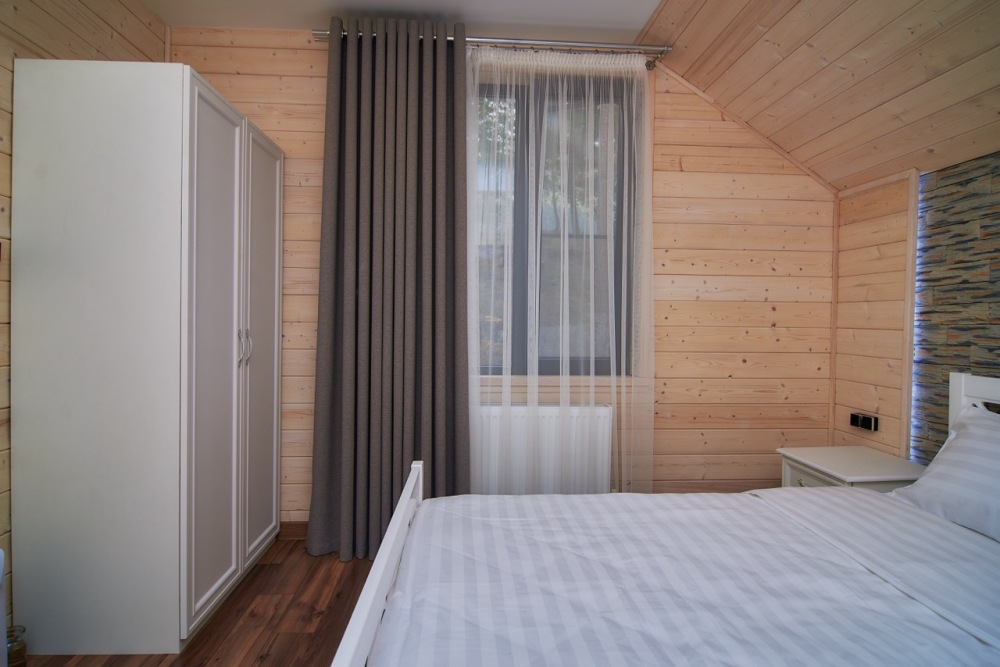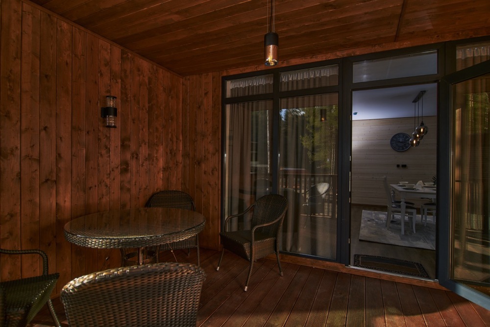 Наши домики типа «A-frame» и «Бaрнxаус» - настоящие шедевры из натурального дерева. Они полностью шумоизолированы и оснащены отоплением с теплым полом. Внутри Вы найдете все необходимое для комфортного отдыха: полностью оборудованную кухню с бытовой техникой и посудой для самостоятельного приготовления пищи.