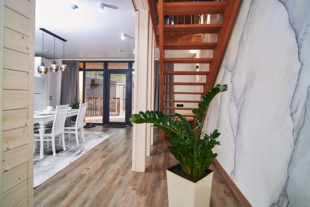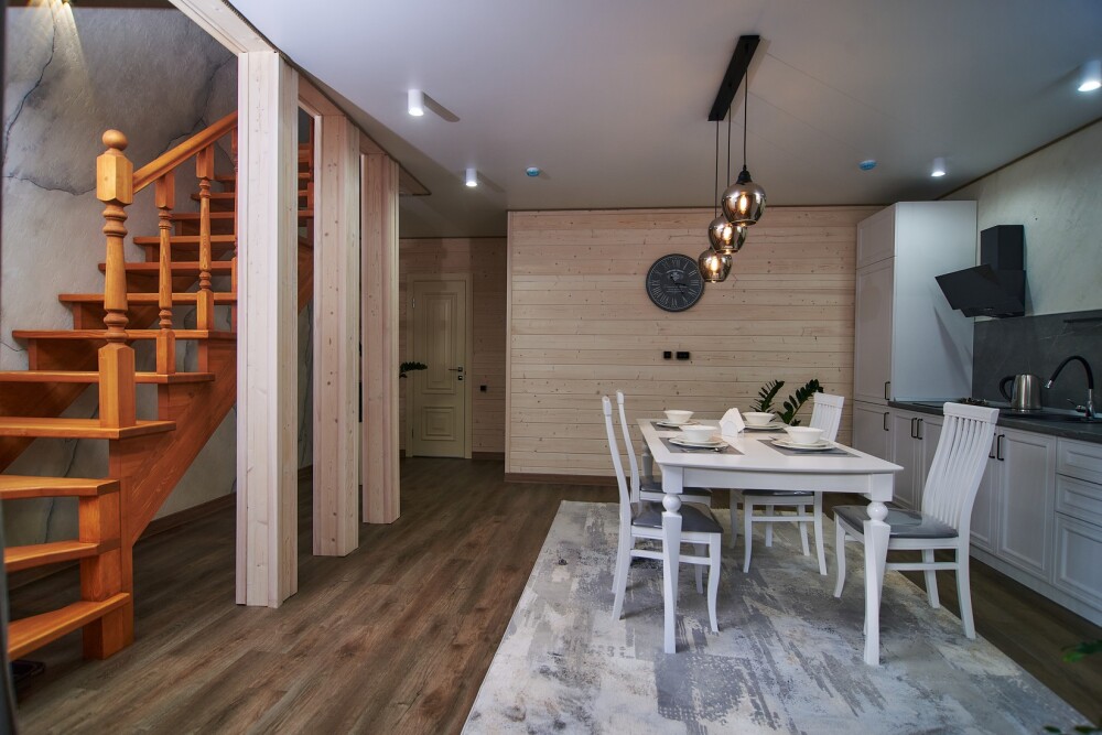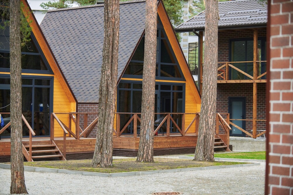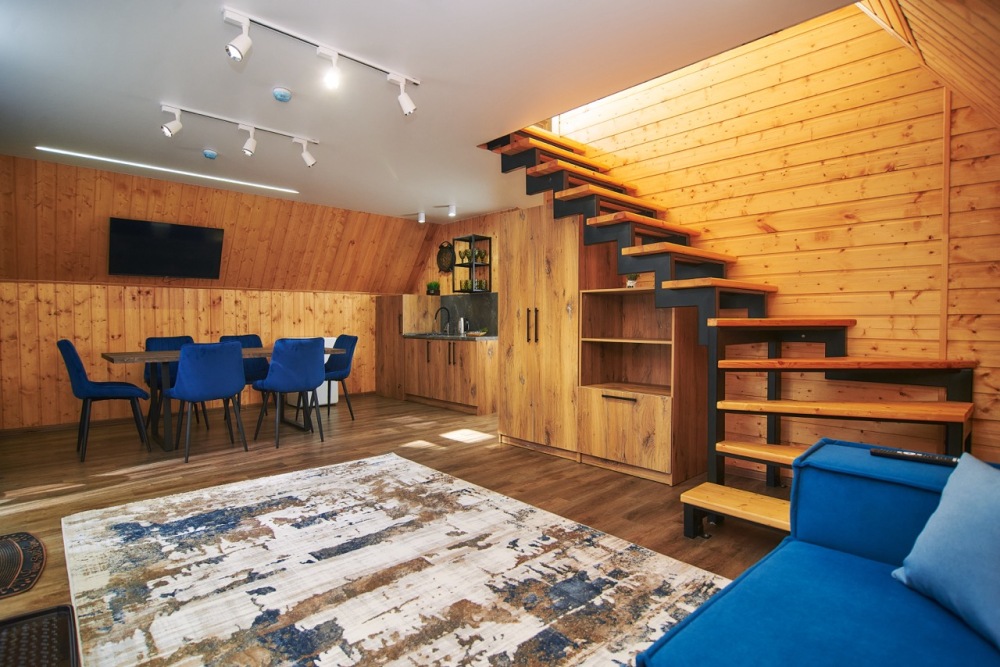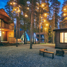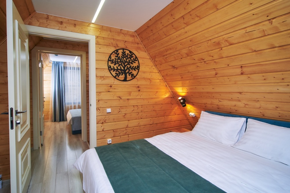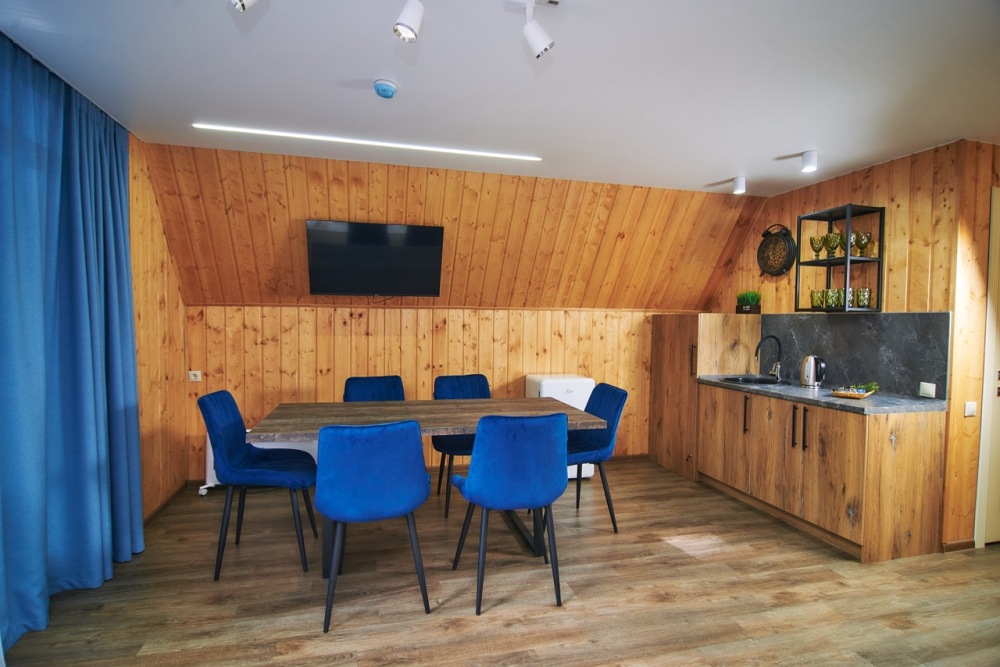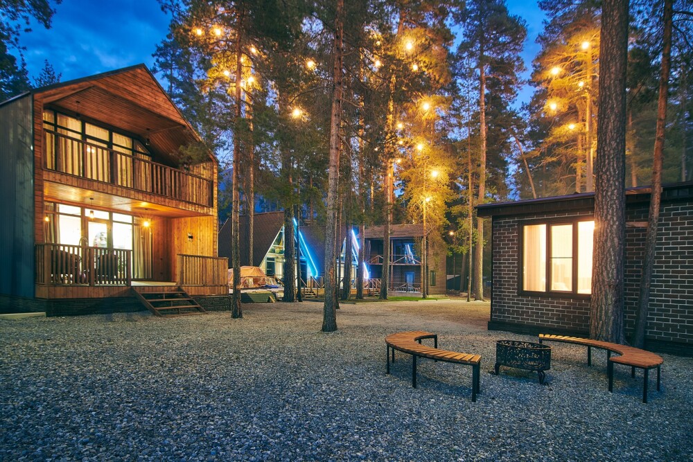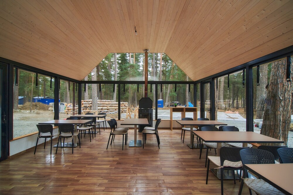 Наши домики типа «A-frame» и «Бaрнxаус» - настоящие шедевры из натурального дерева. Они полностью шумоизолированы и оснащены отоплением с теплым полом. Внутри Вы найдете все необходимое для комфортного отдыха: полностью оборудованную кухню с бытовой техникой и посудой для самостоятельного приготовления пищи.