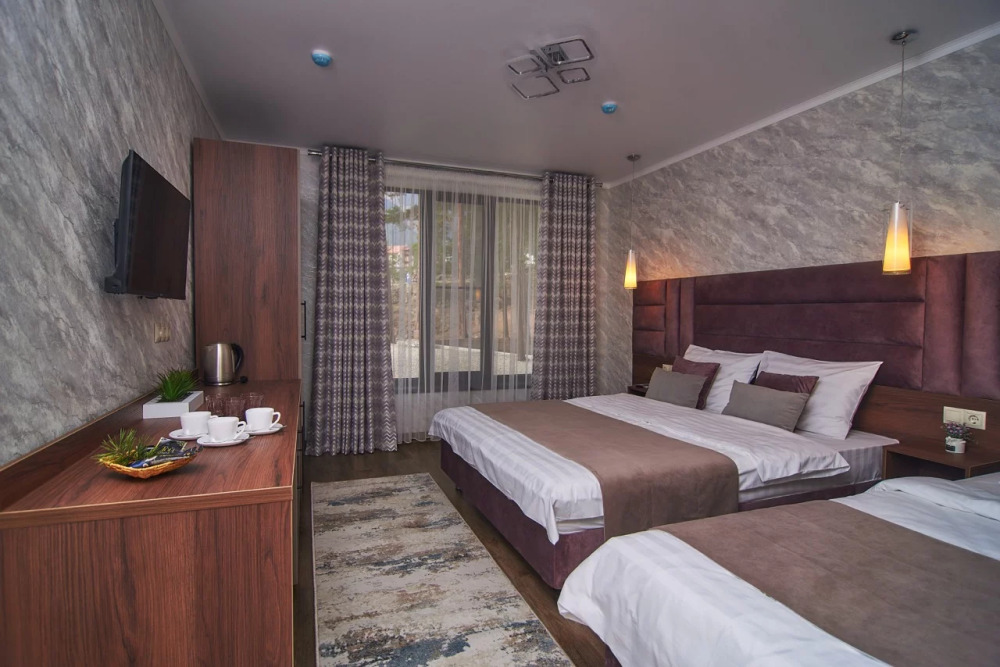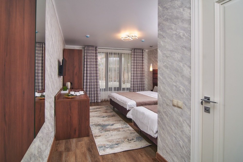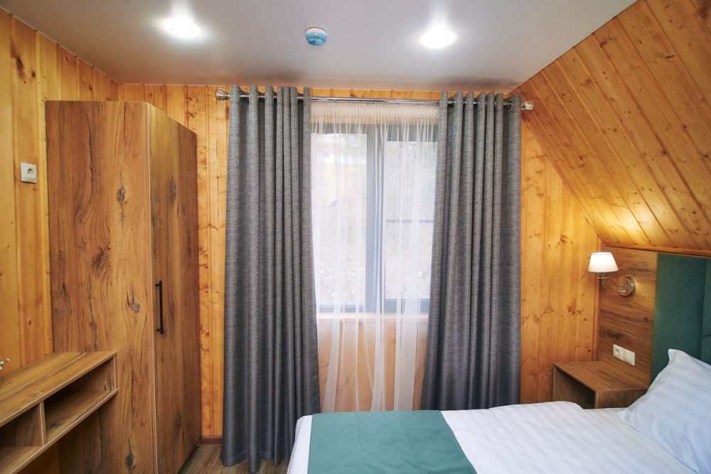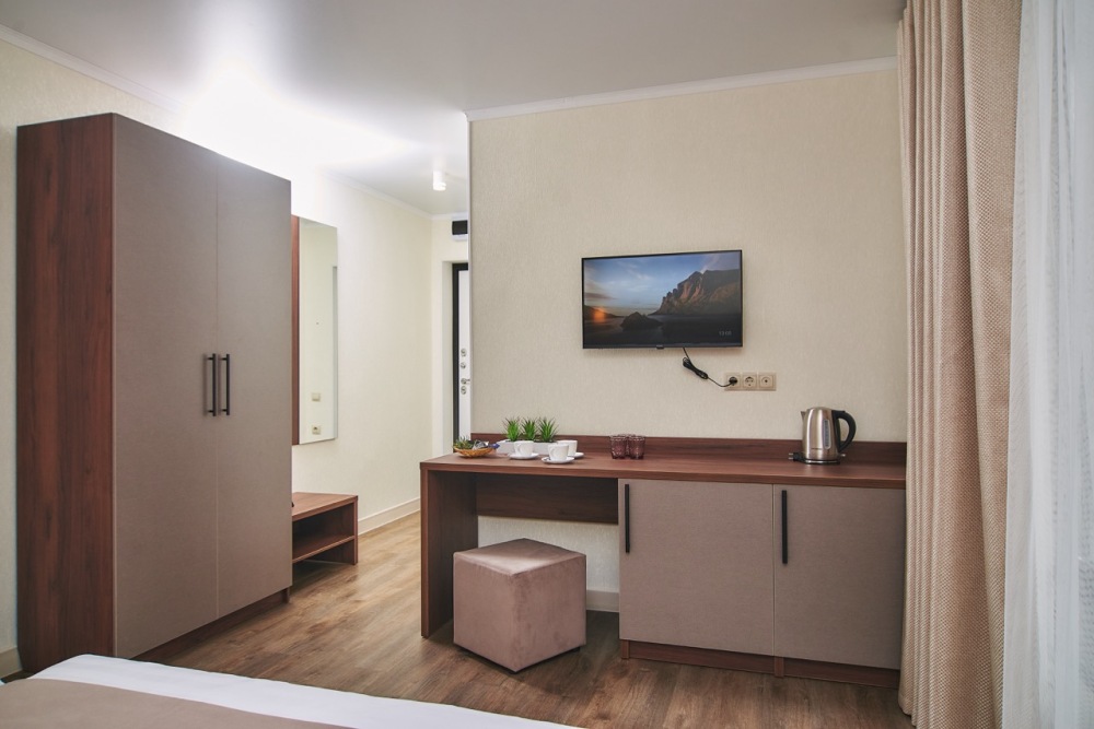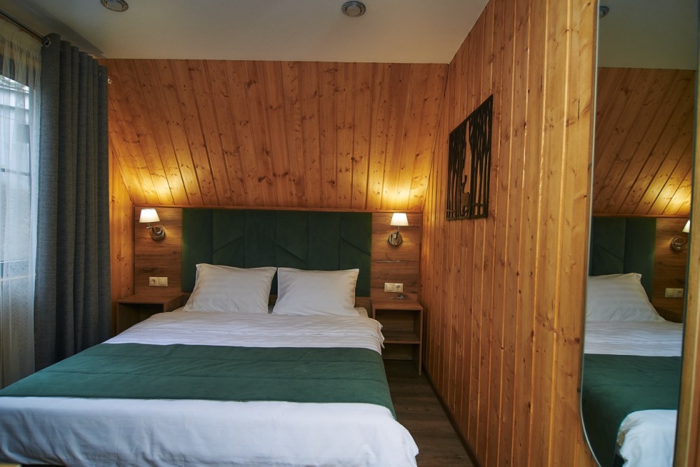 Для размещения гостей также есть номера категорий: Семейный, Полулюкс и Люкс. Все номера оснащены: теплым полом, чайником, мини-холодильником, телевизором. Номера категории Люкс оборудованы кухней.